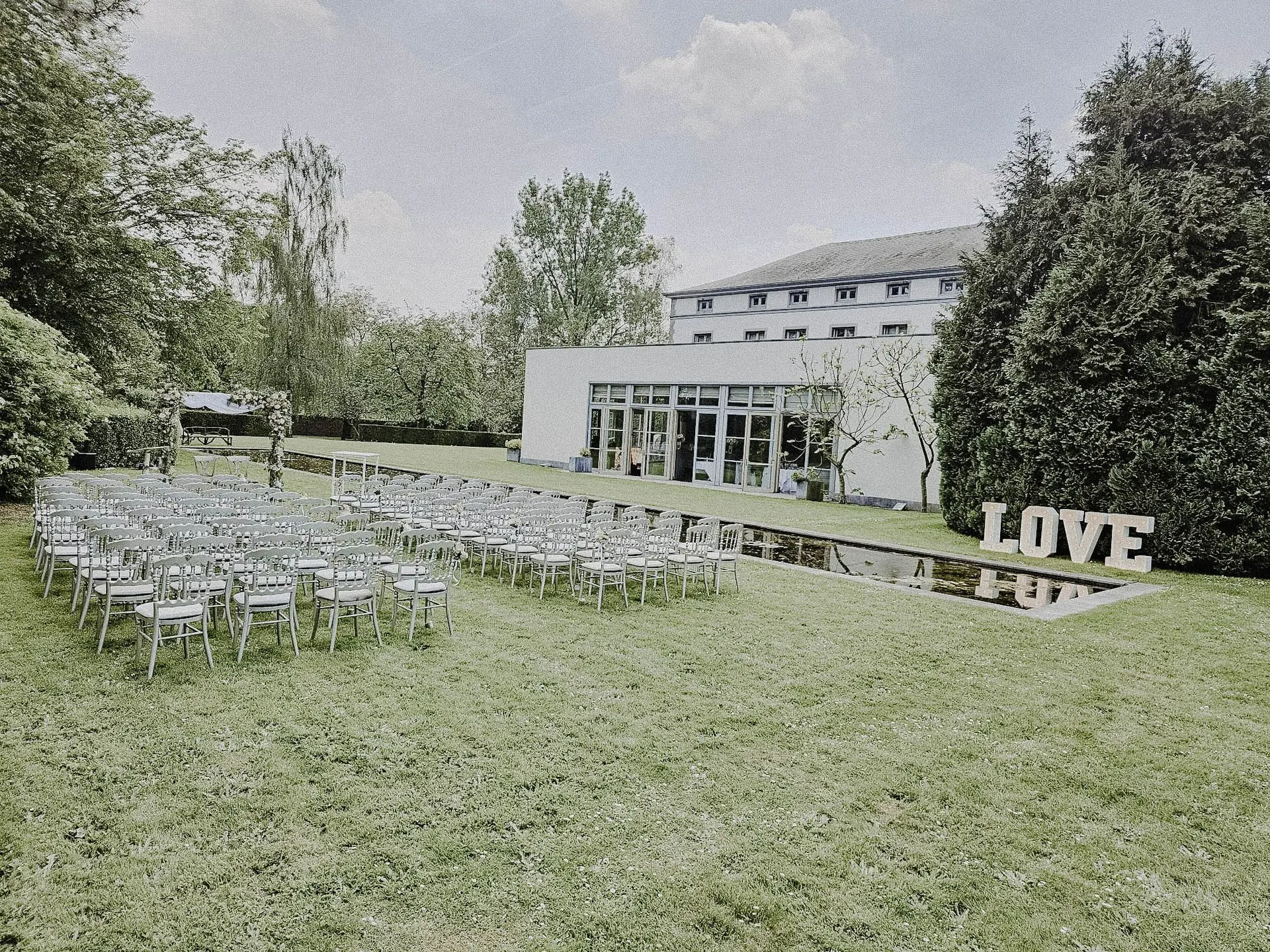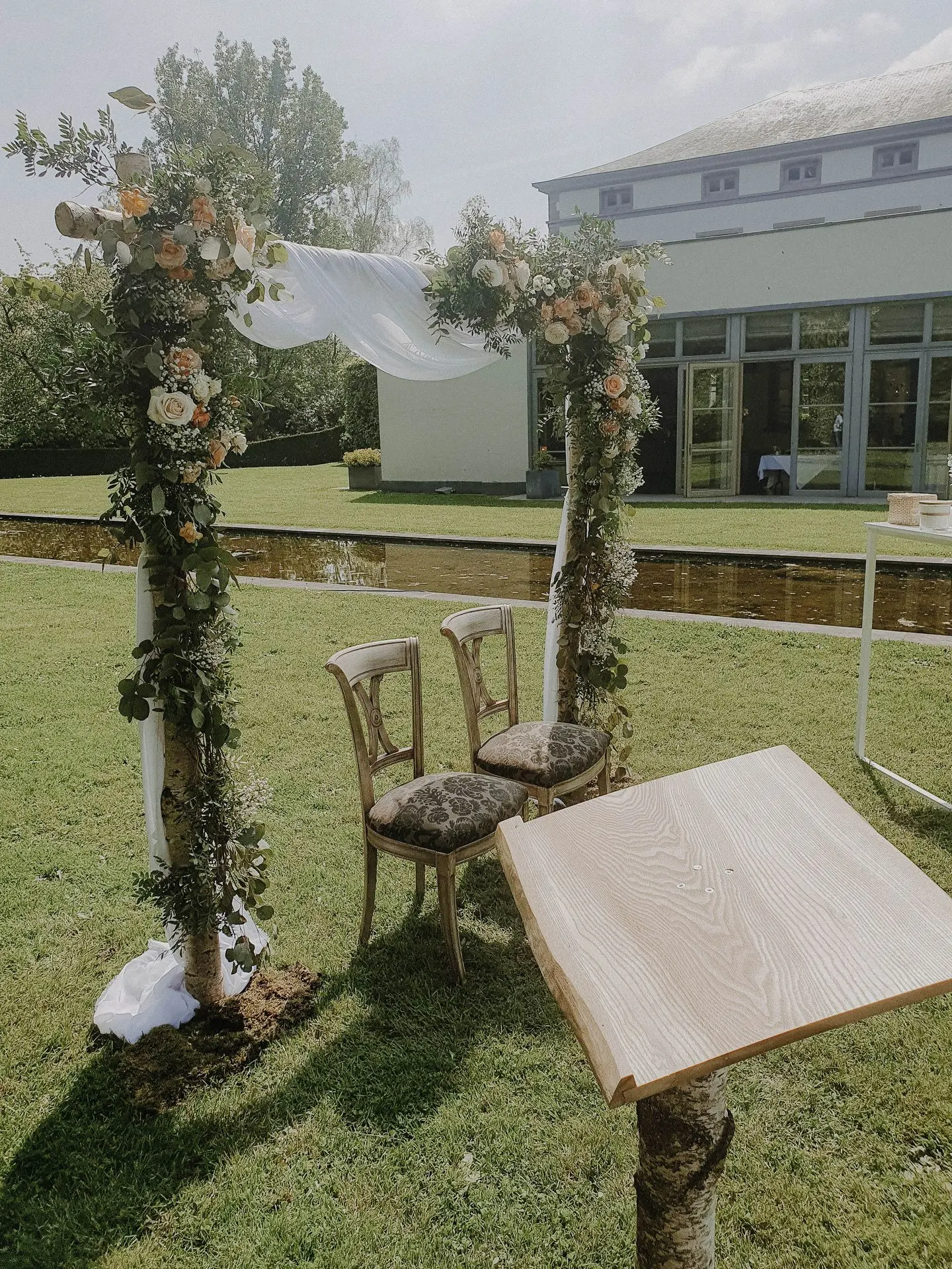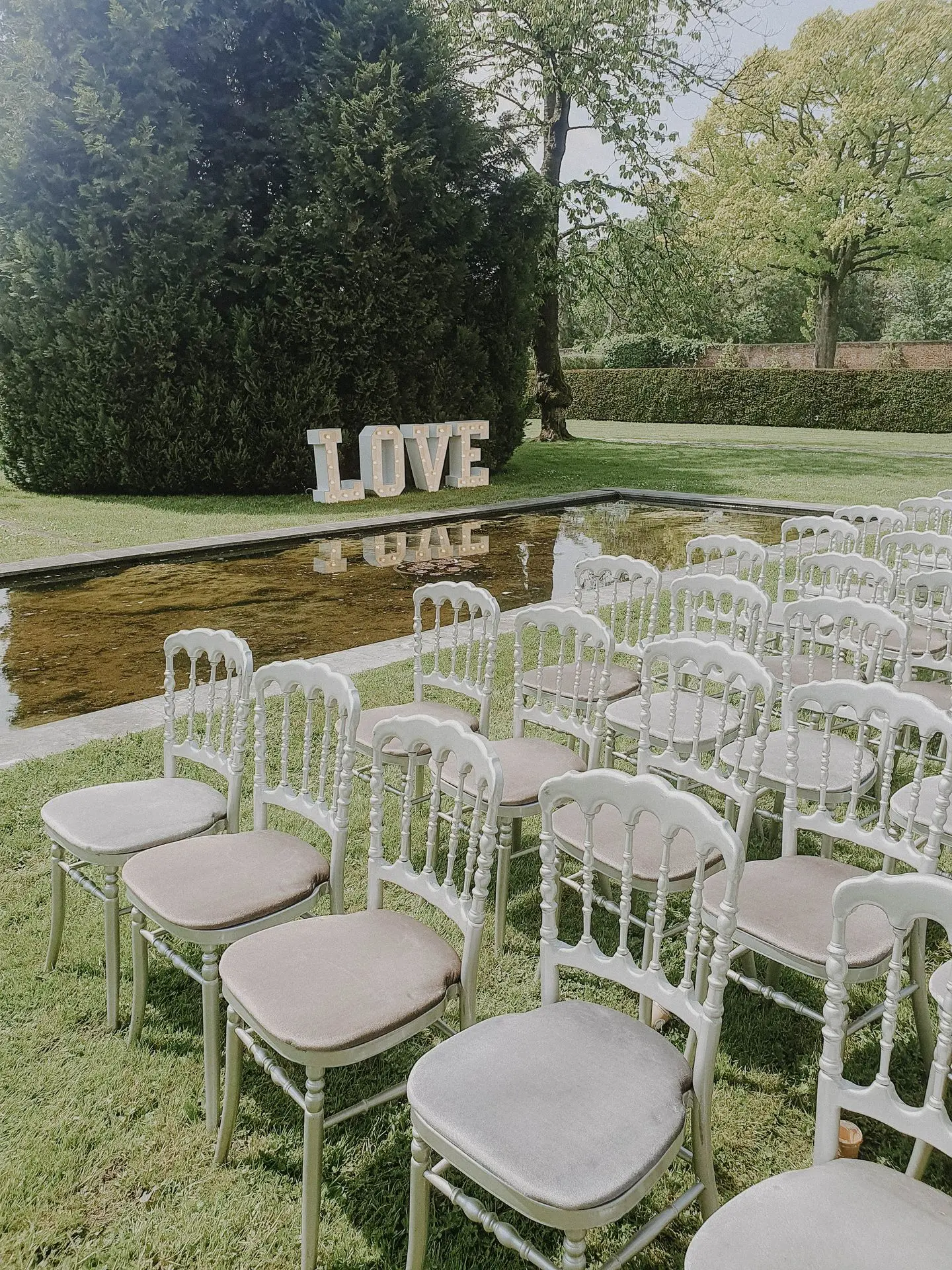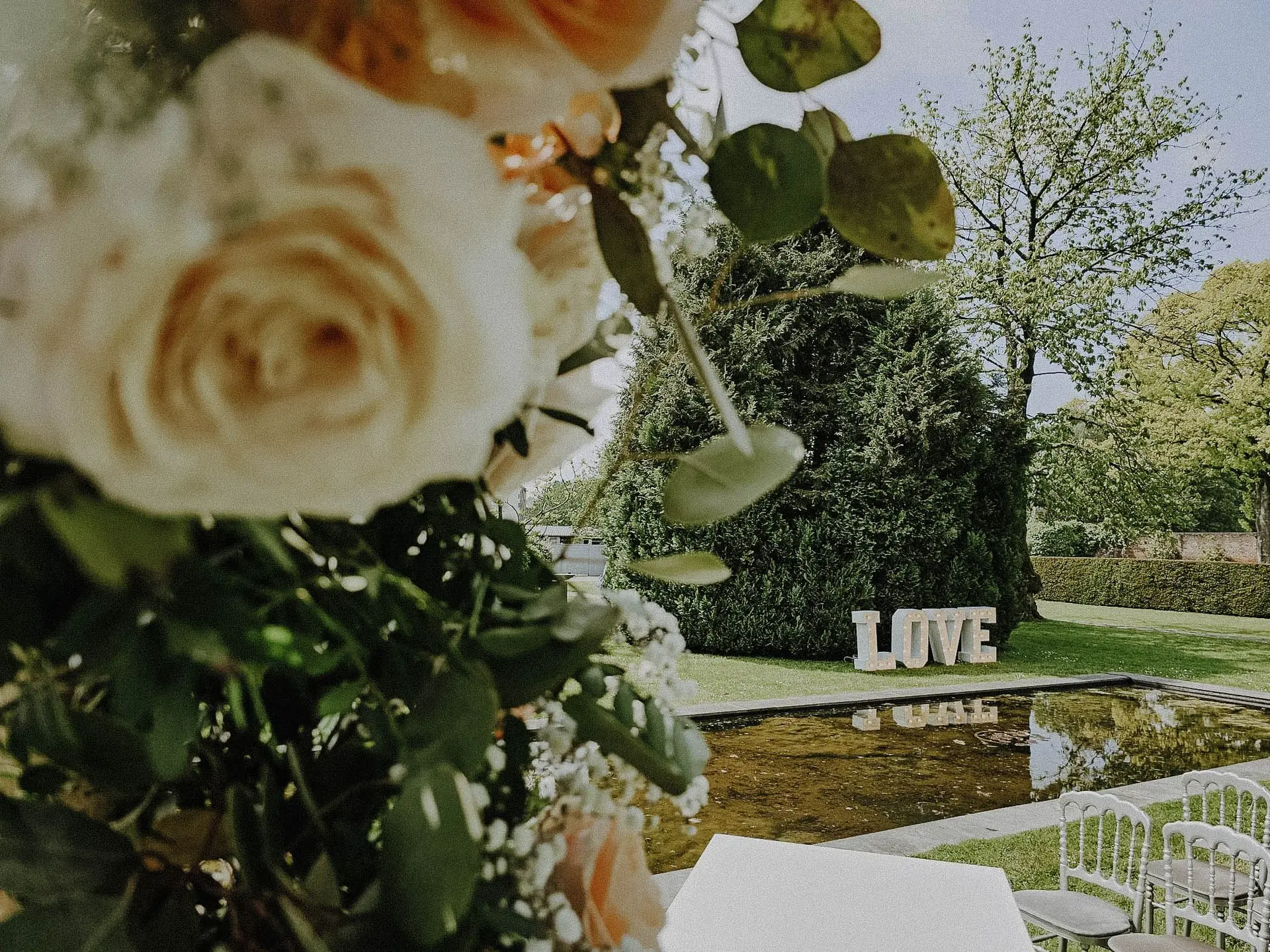 La cérémonie extérieure se déroulait au bord de l’étang, sous une arche en bouleau assortie à un pupitre du même bois, pour une ambiance authentique et raffinée. De grands lettres « love » lumineuses ajoutaient une touche chaleureuse et romantique à l’ensemble.