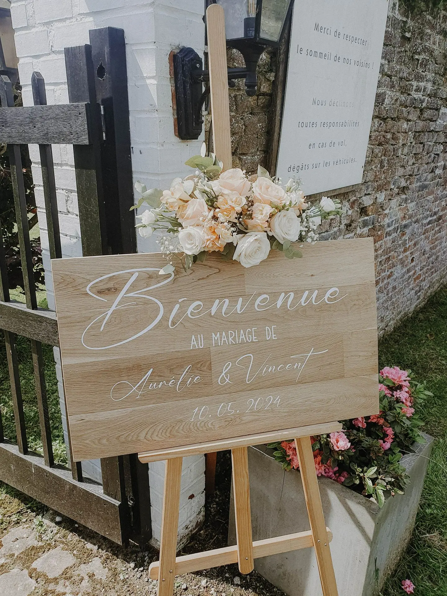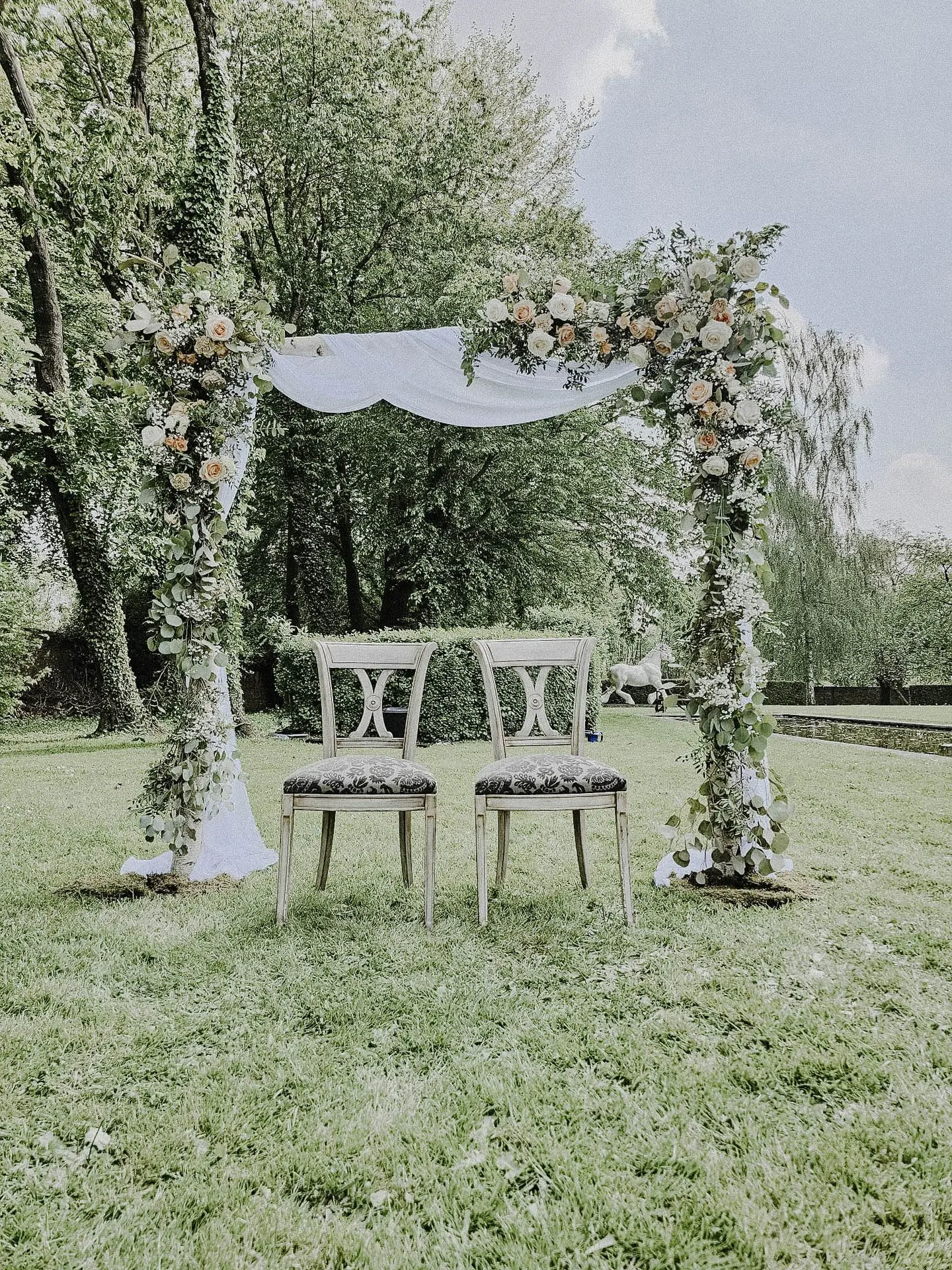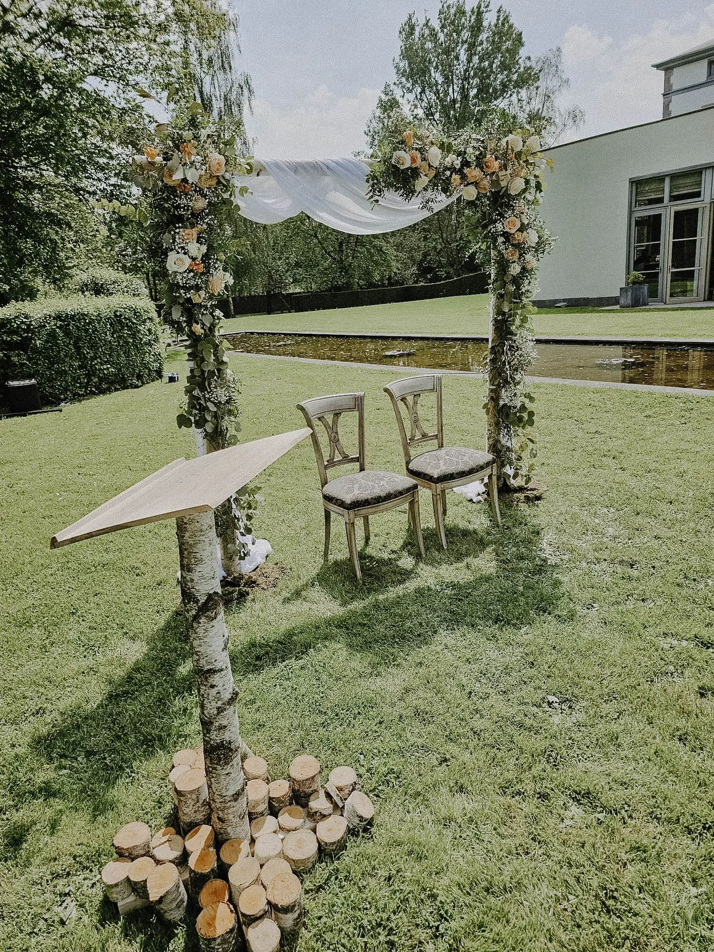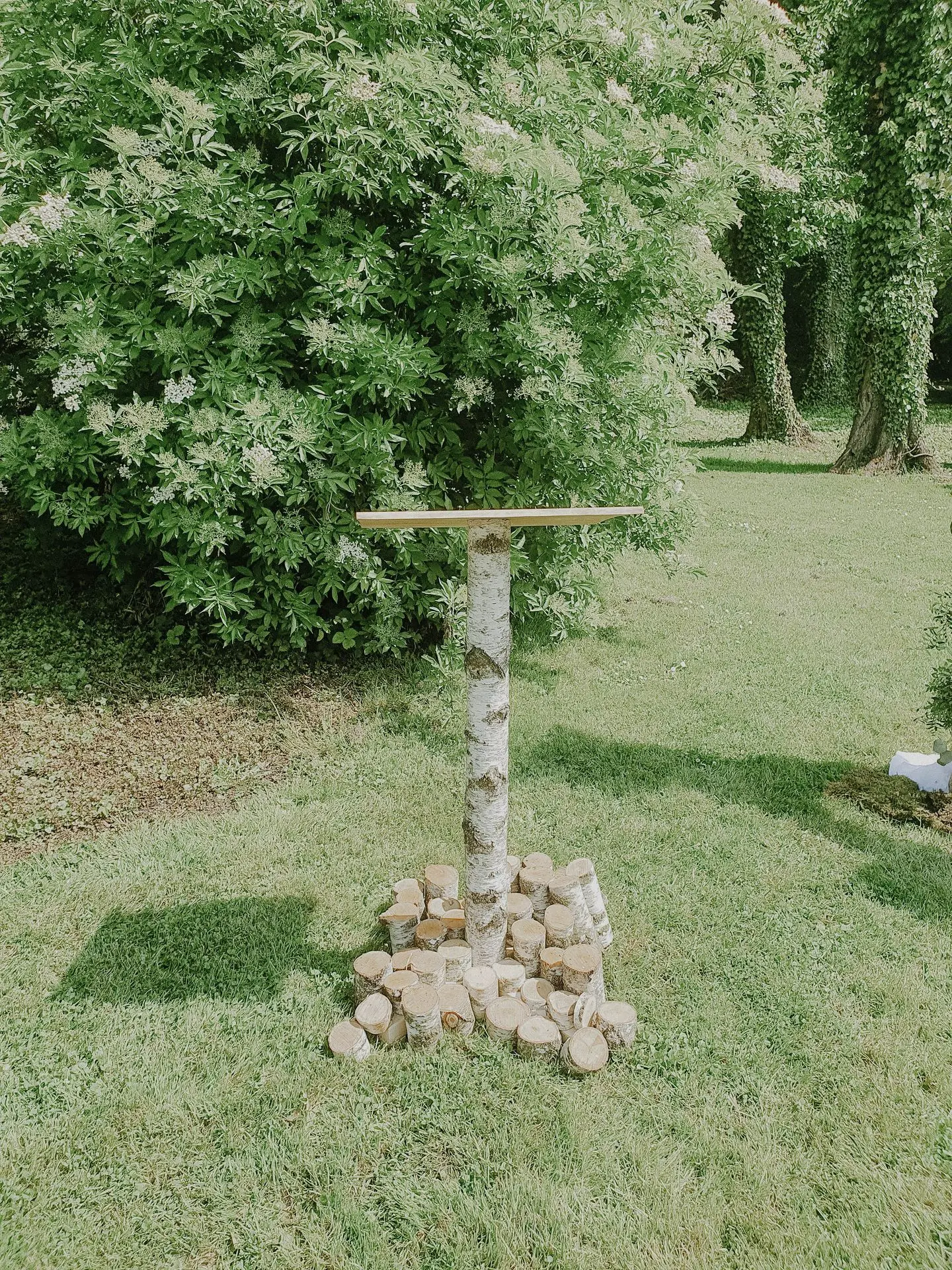 La cérémonie extérieure se déroulait au bord de l’étang, sous une arche en bouleau assortie à un pupitre du même bois, pour une ambiance authentique et raffinée. De grands lettres « love » lumineuses ajoutaient une touche chaleureuse et romantique à l’ensemble.
