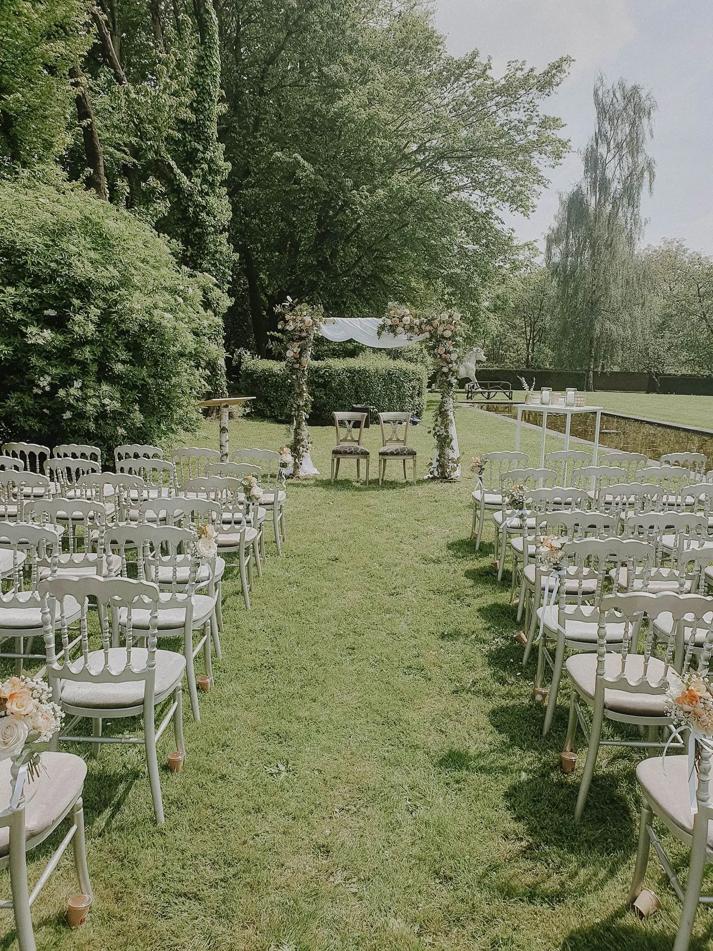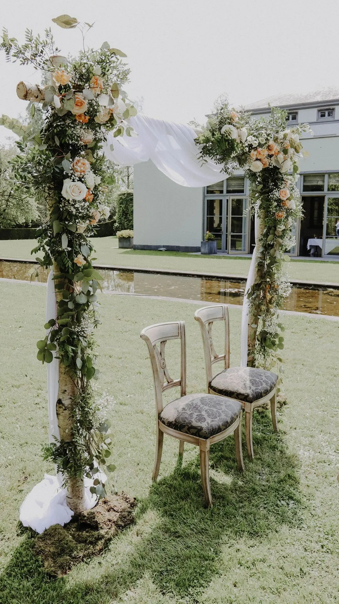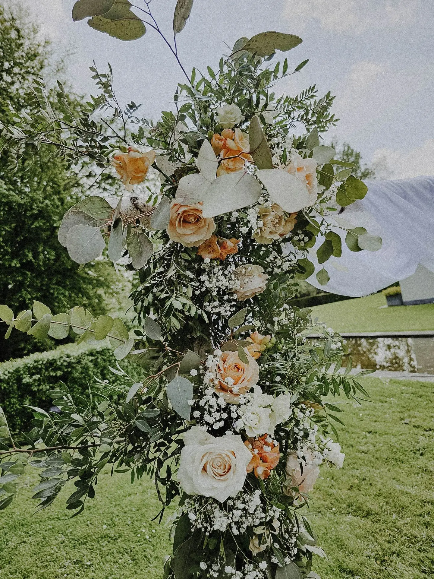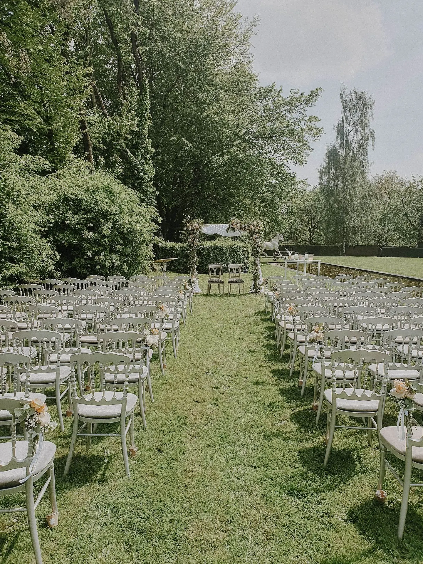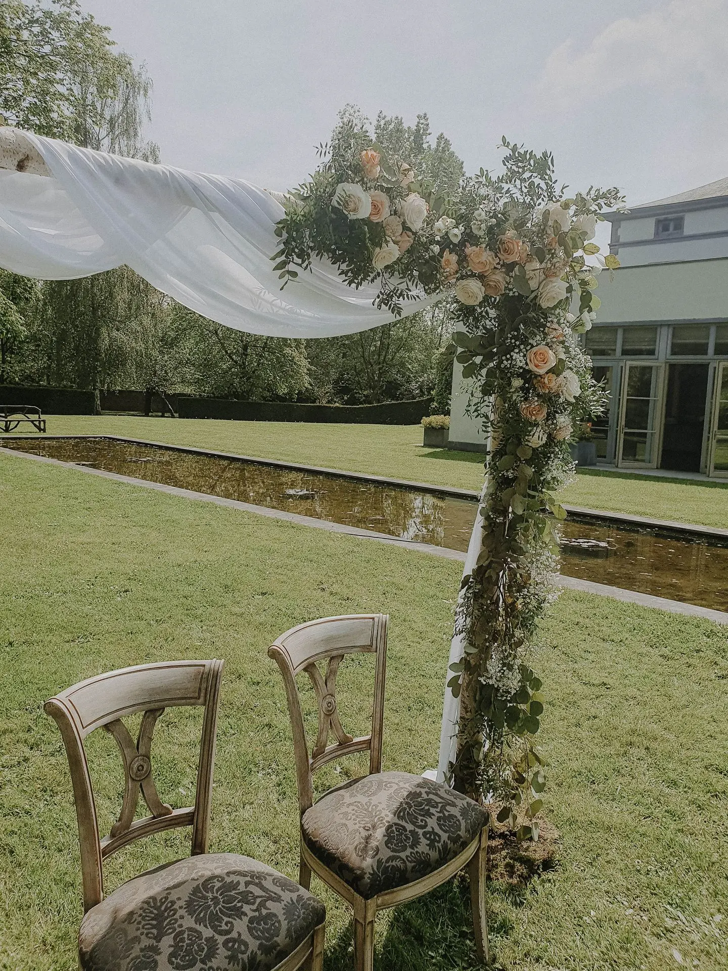 La cérémonie extérieure se déroulait au bord de l’étang, sous une arche en bouleau assortie à un pupitre du même bois, pour une ambiance authentique et raffinée. De grands lettres « love » lumineuses ajoutaient une touche chaleureuse et romantique à l’ensemble.