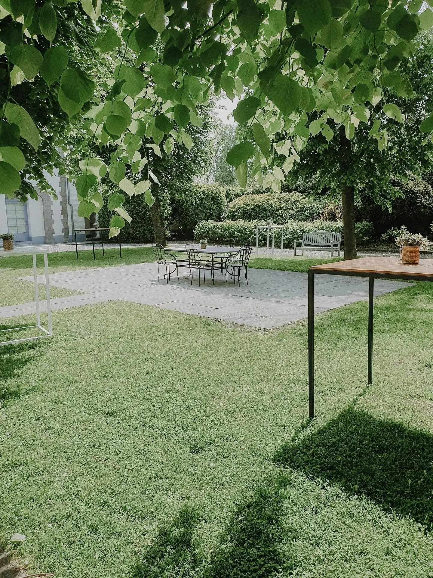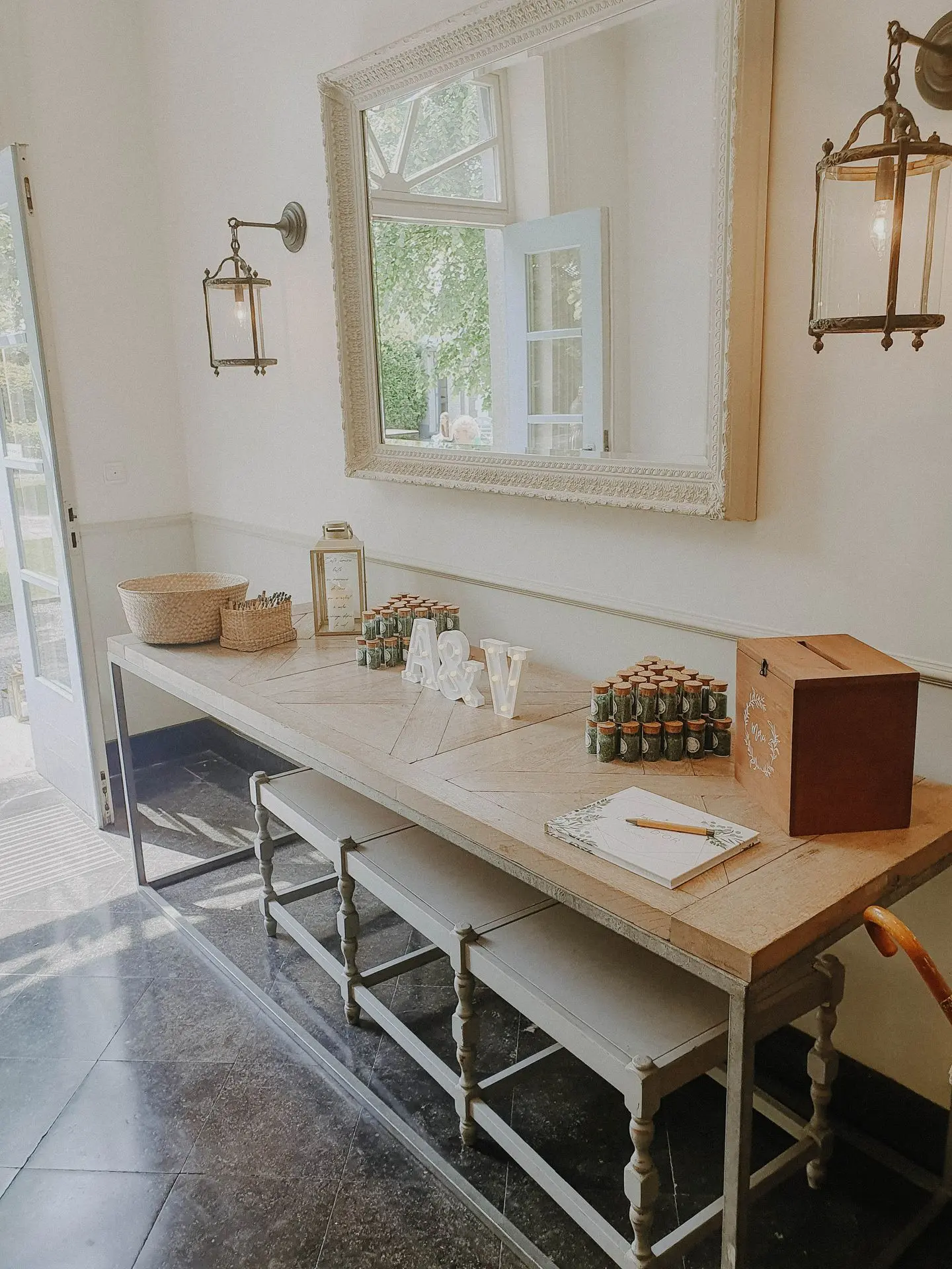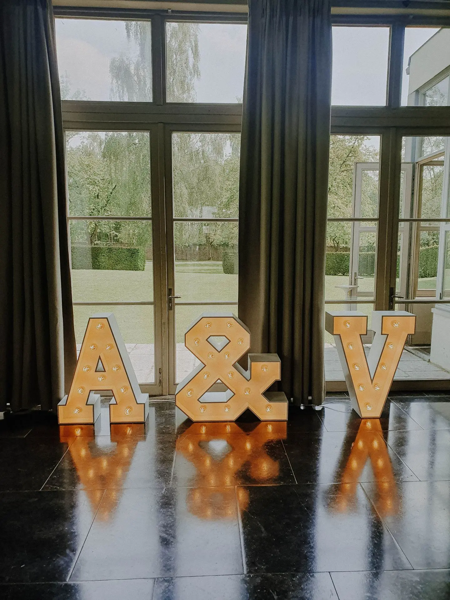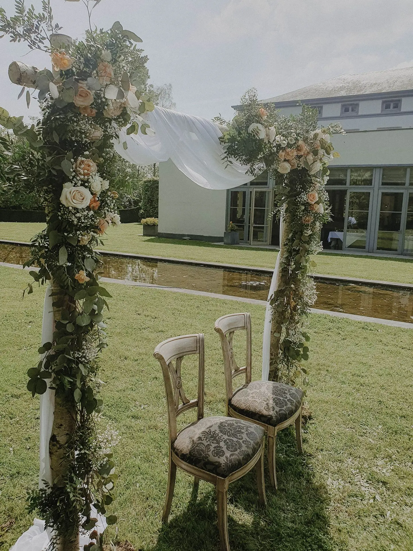 La cérémonie extérieure se déroulait au bord de l’étang, sous une arche en bouleau assortie à un pupitre du même bois, pour une ambiance authentique et raffinée. De grands lettres « love » lumineuses ajoutaient une touche chaleureuse et romantique à l’ensemble.