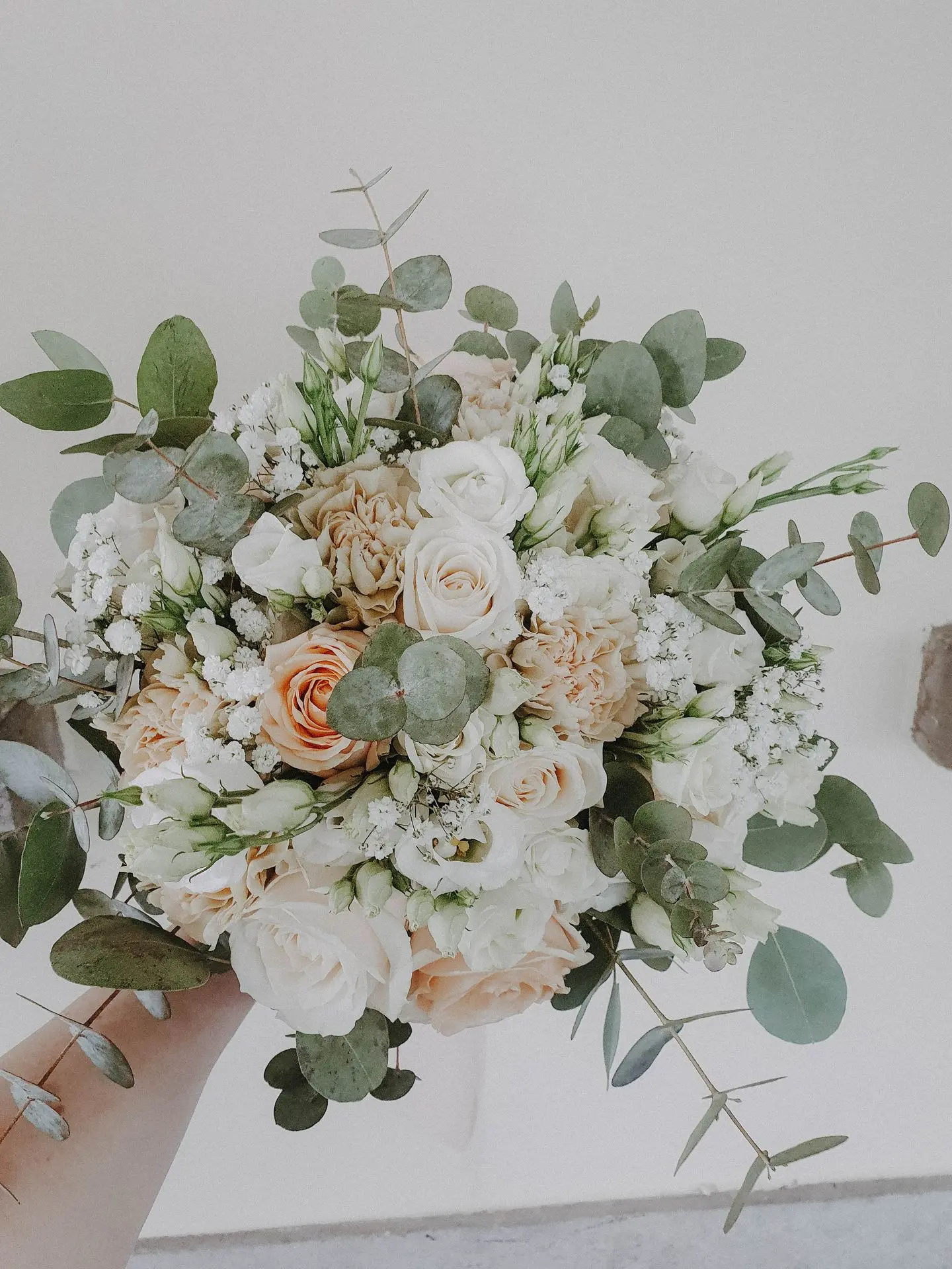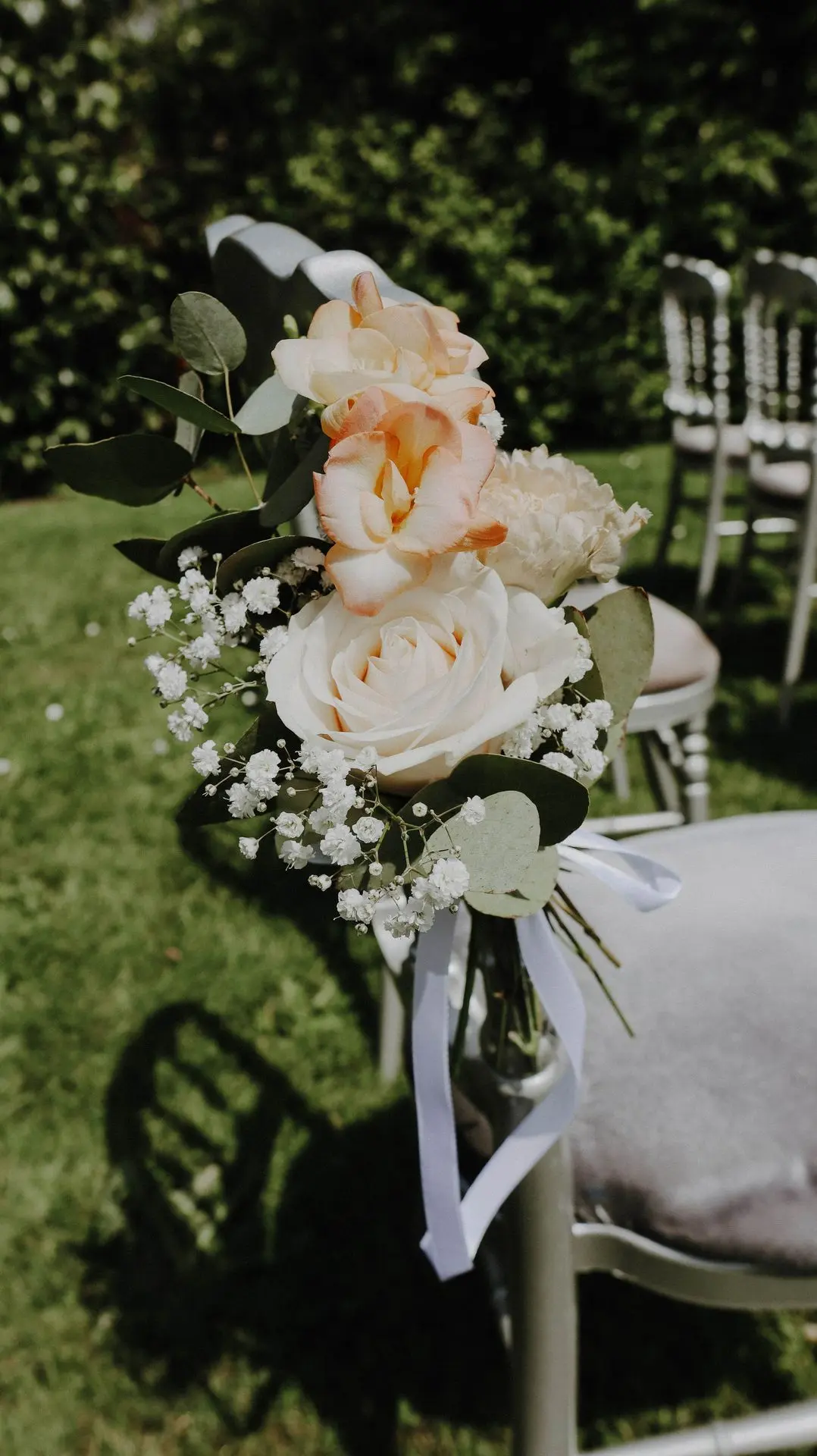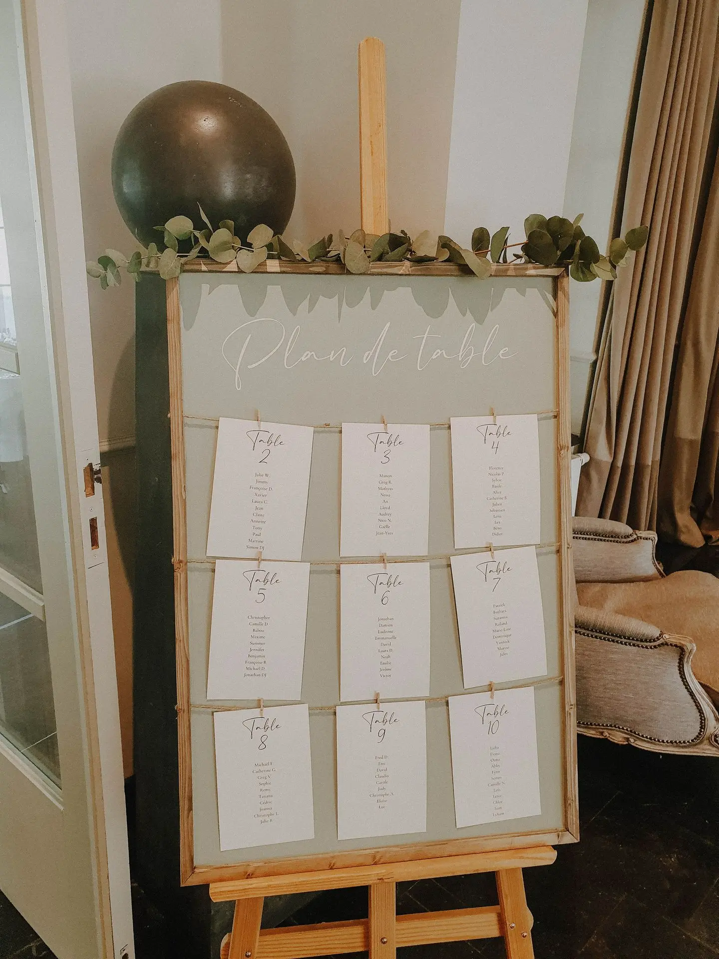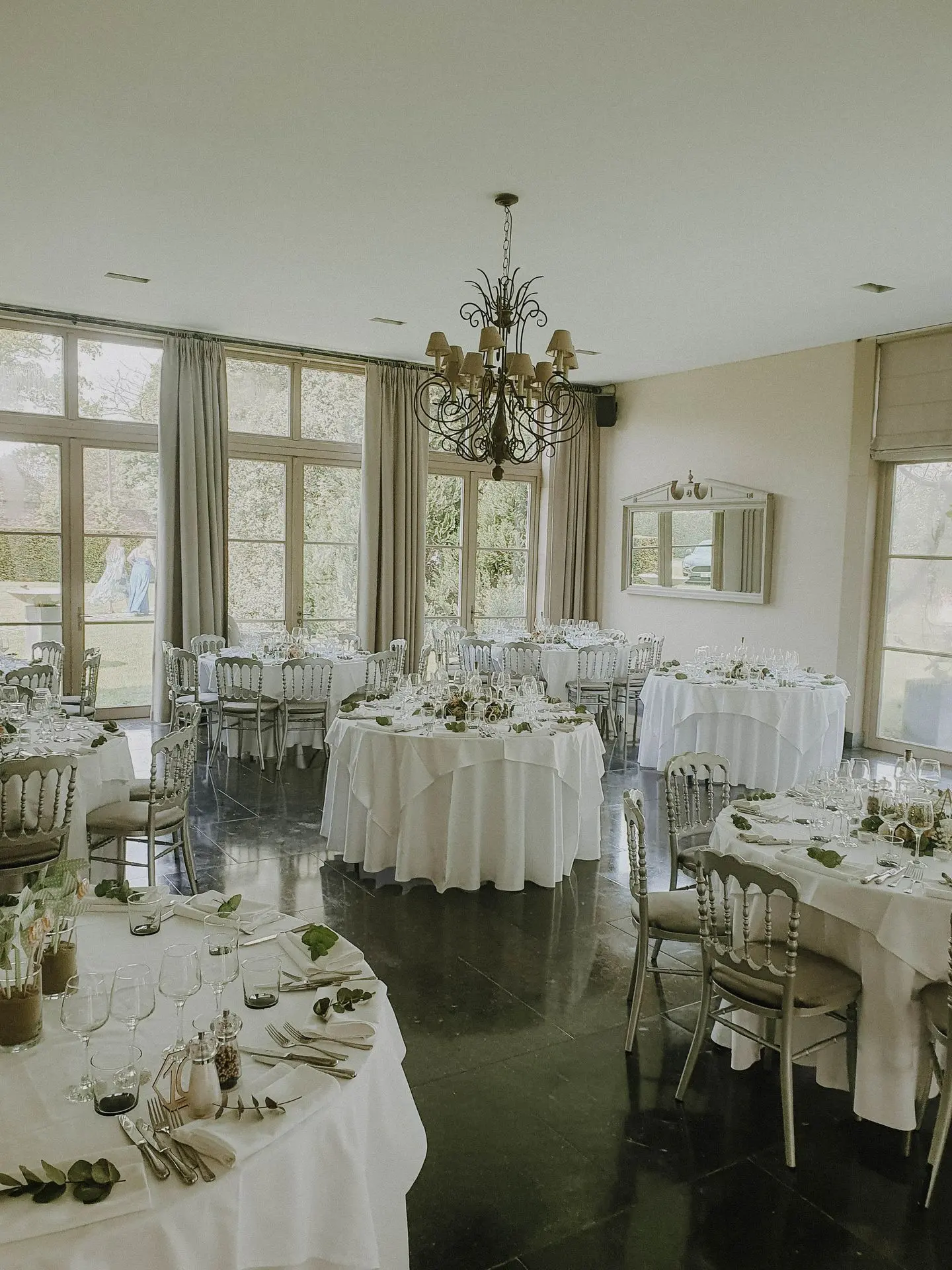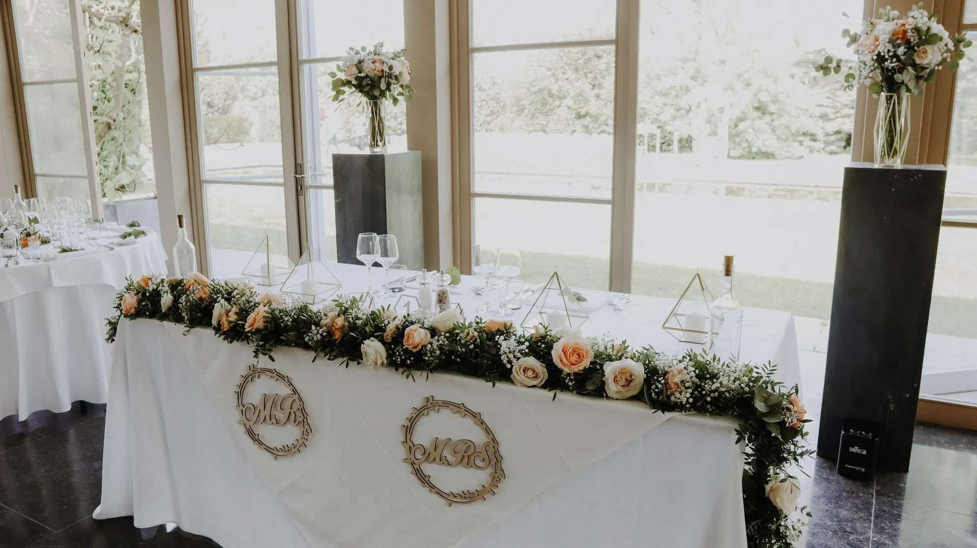 La table d’honneur, quant à elle, se distinguait avec une longue guirlande de feuillages ponctuée de fleurs, créant une atmosphère harmonieuse et généreuse autour des mariés.