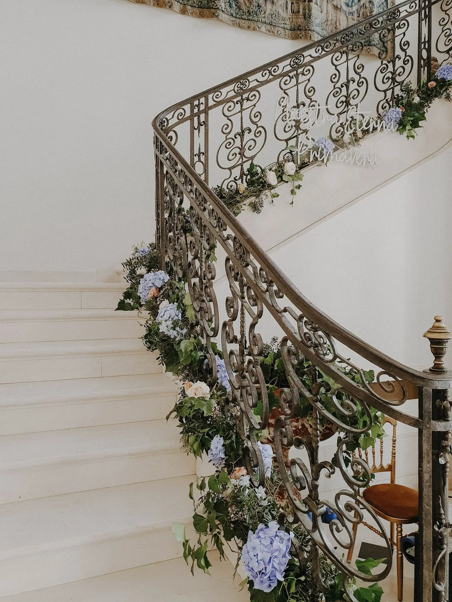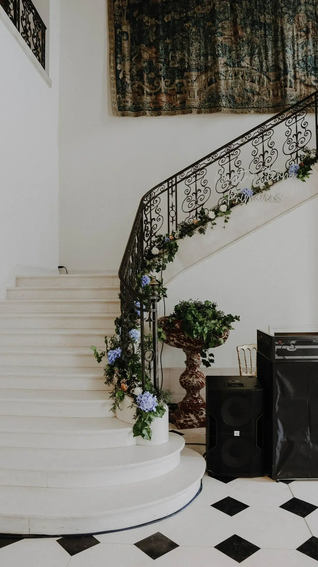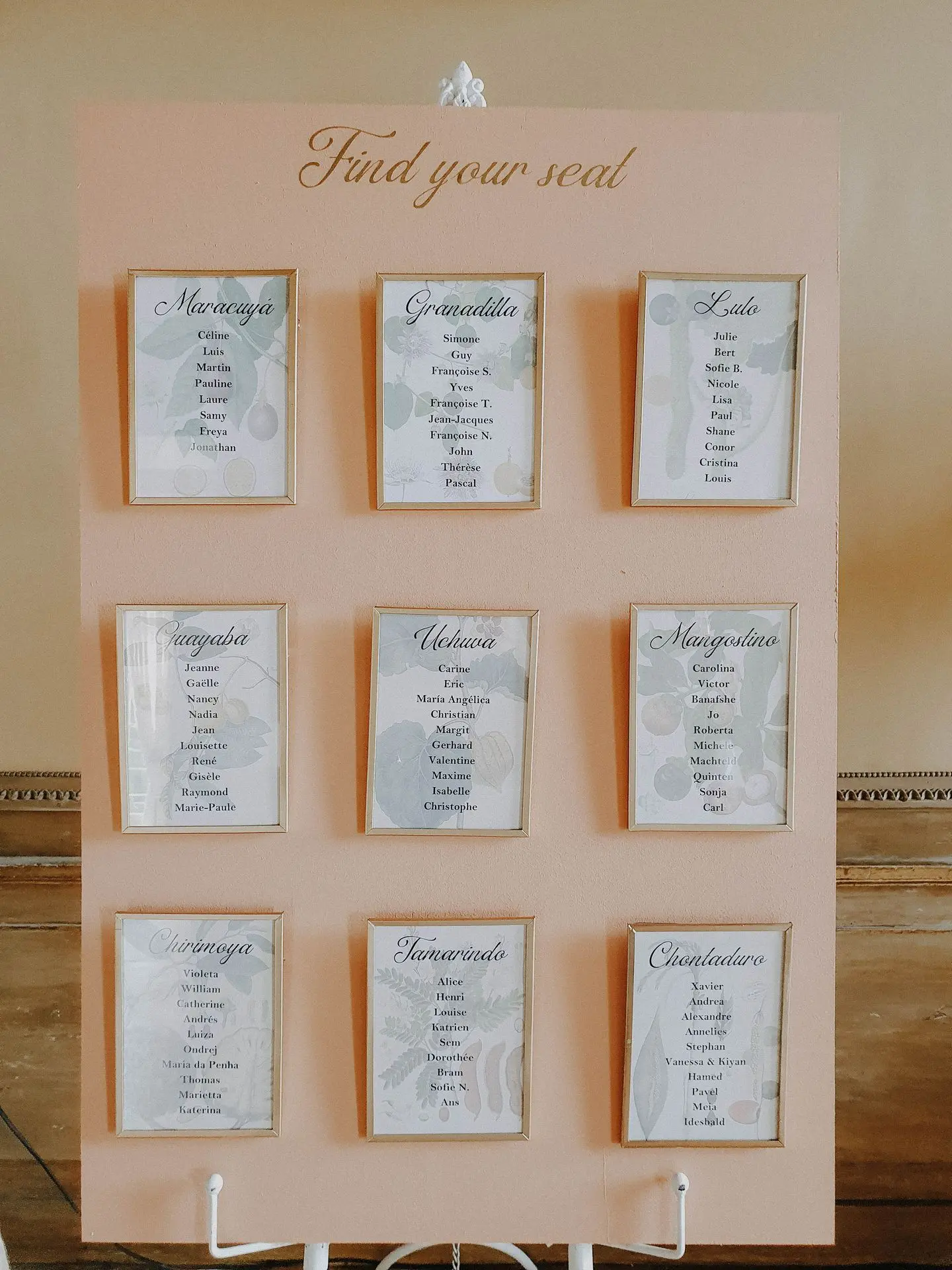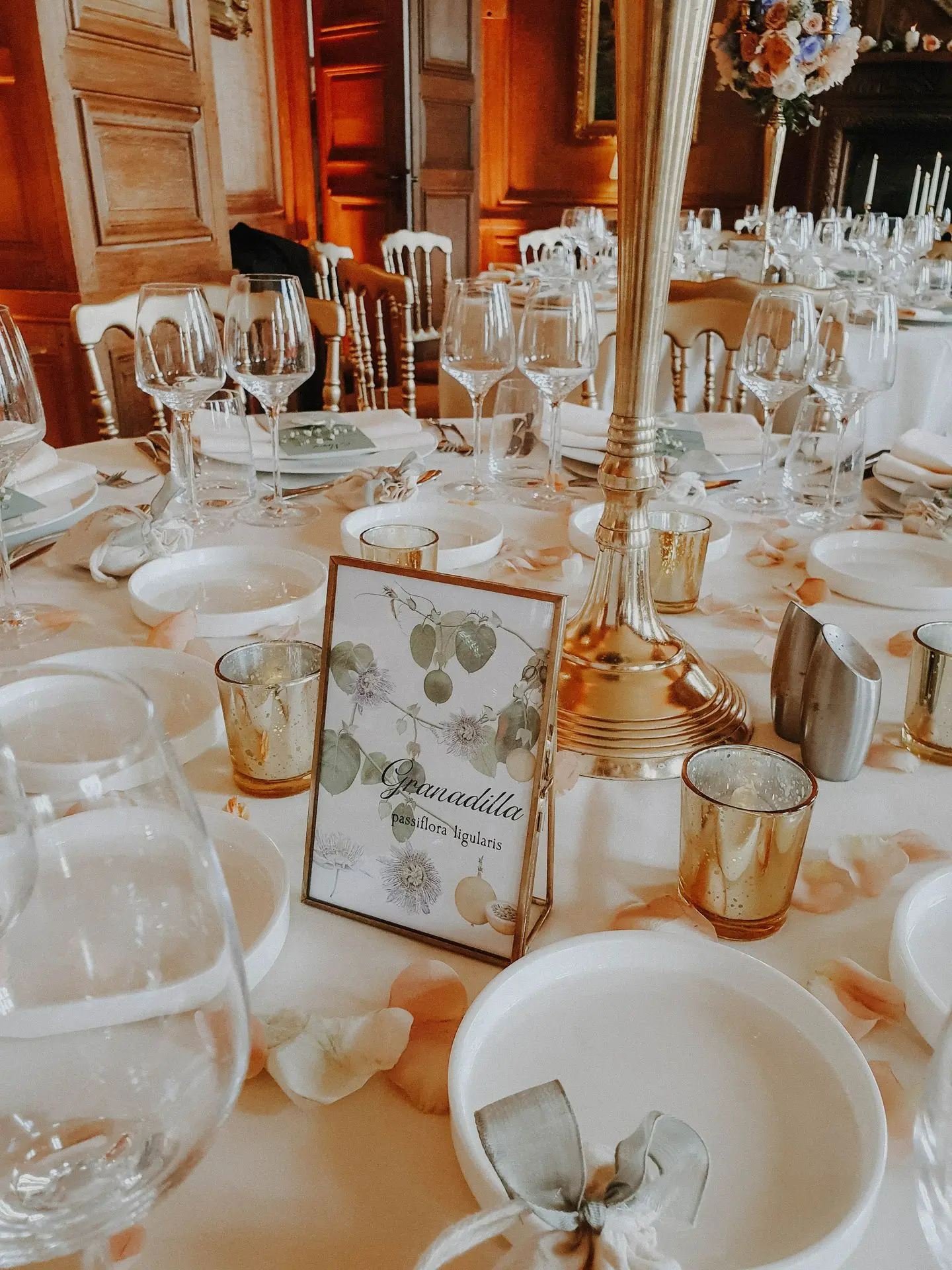 Le plan de table, lui aussi en cadres or, s’harmonisait avec les tables décorées de chandeliers dorés et de compositions florales. La table d’honneur était sublimée par un montage floral avec une chute devant les mariés, et l’escalier a été décoré pour offrir une descente de mariée spectaculaire.