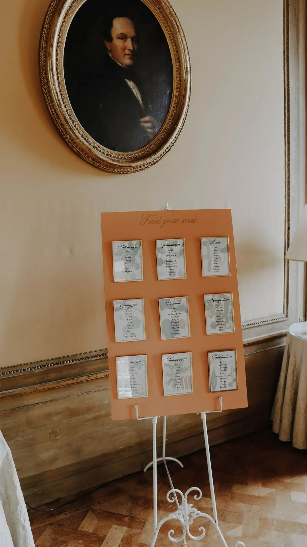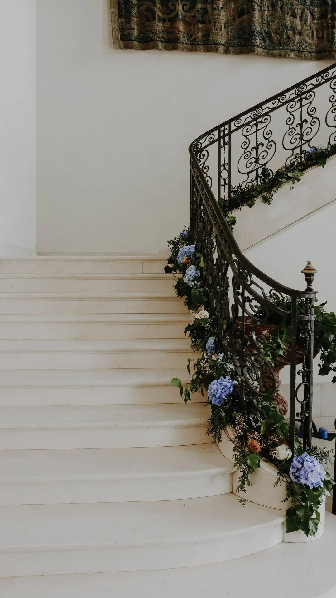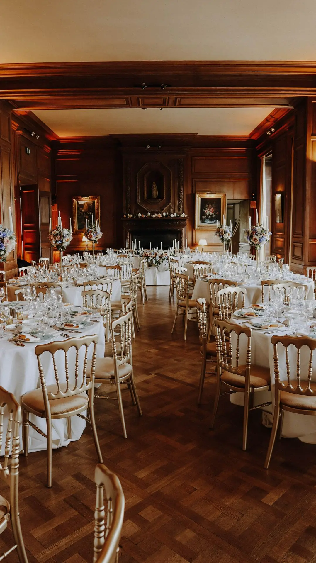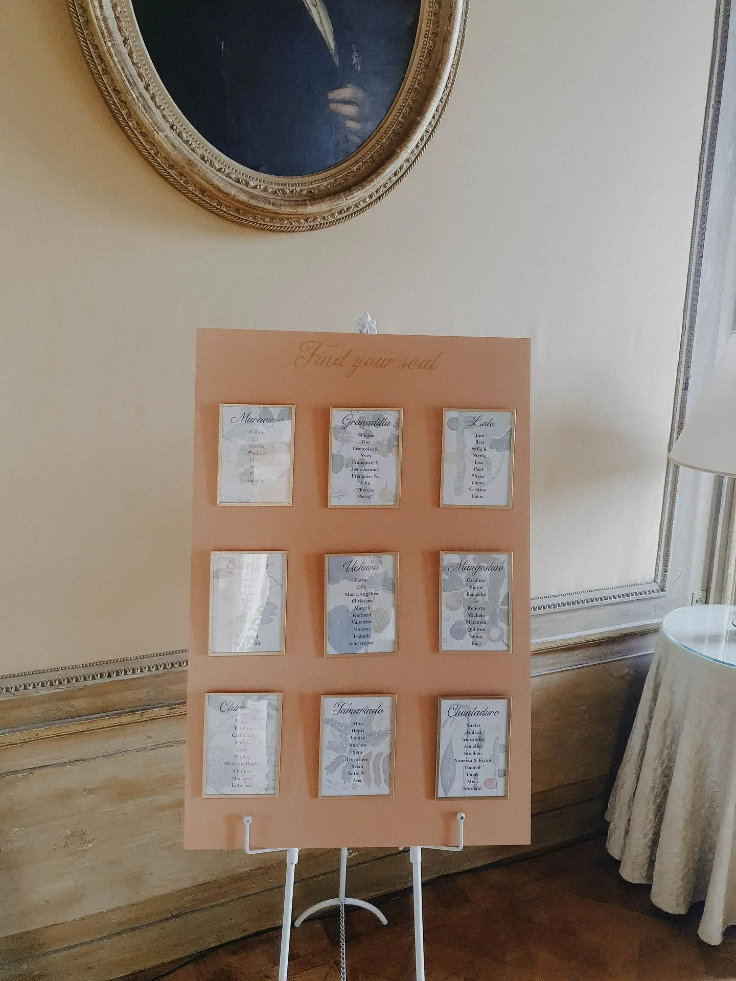Le plan de table, lui aussi en cadres or, s’harmonisait avec les tables décorées de chandeliers dorés et de compositions florales. La table d’honneur était sublimée par un montage floral avec une chute devant les mariés, et l’escalier a été décoré pour offrir une descente de mariée spectaculaire.