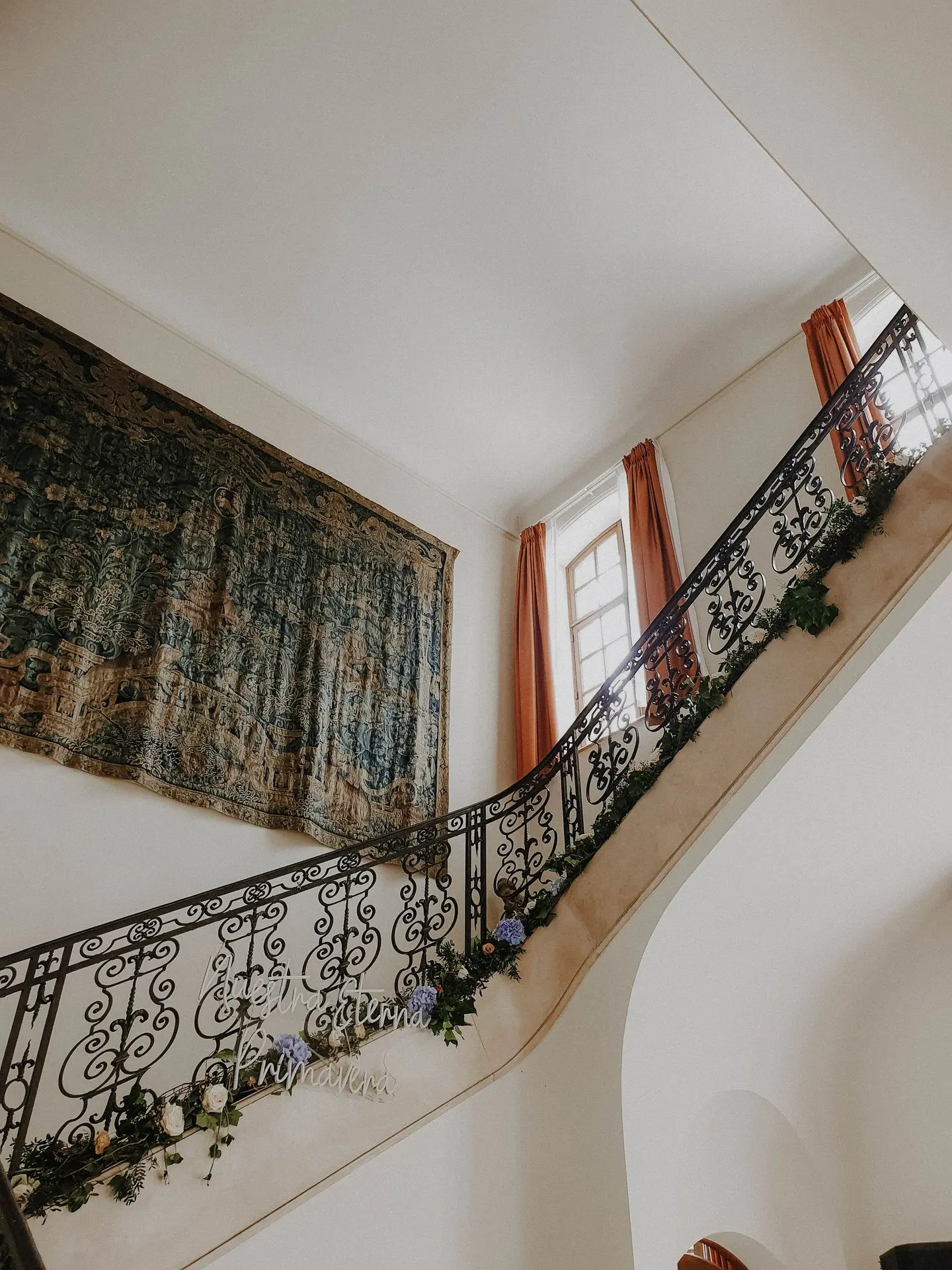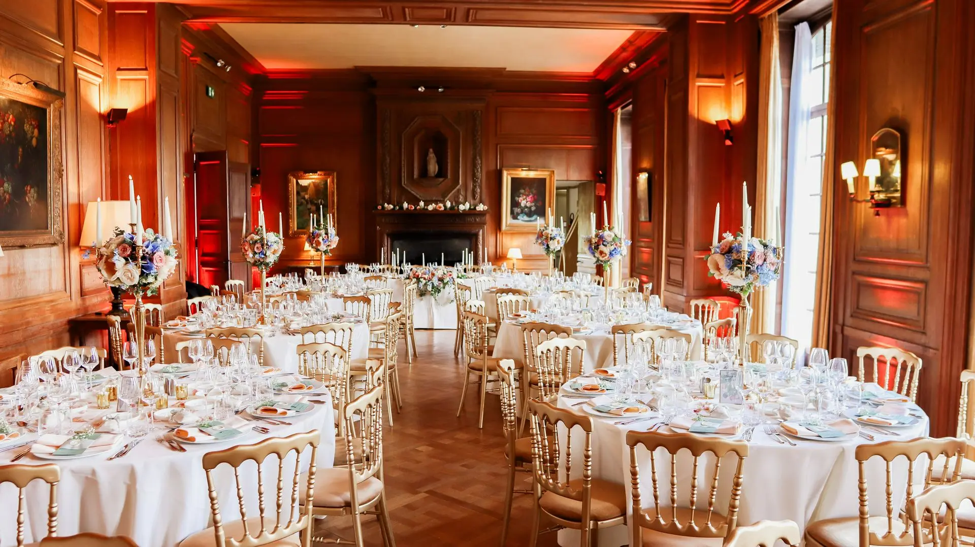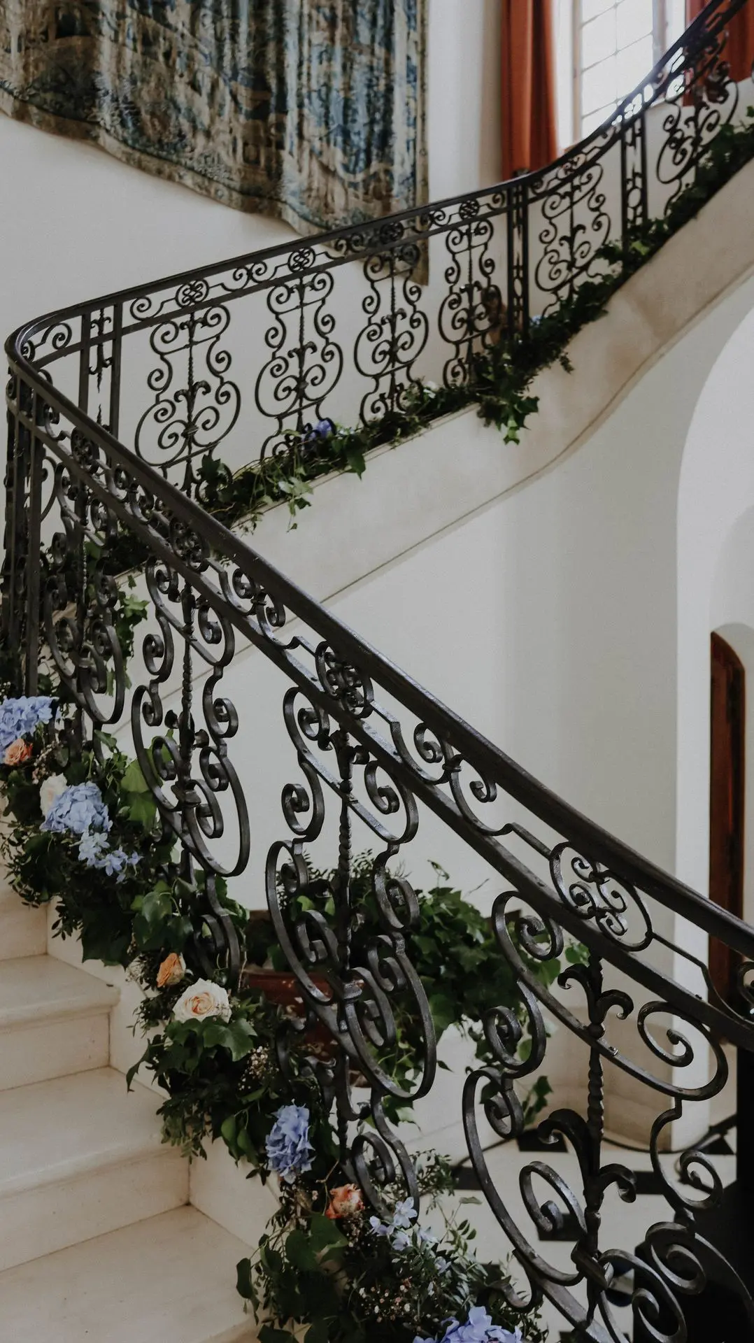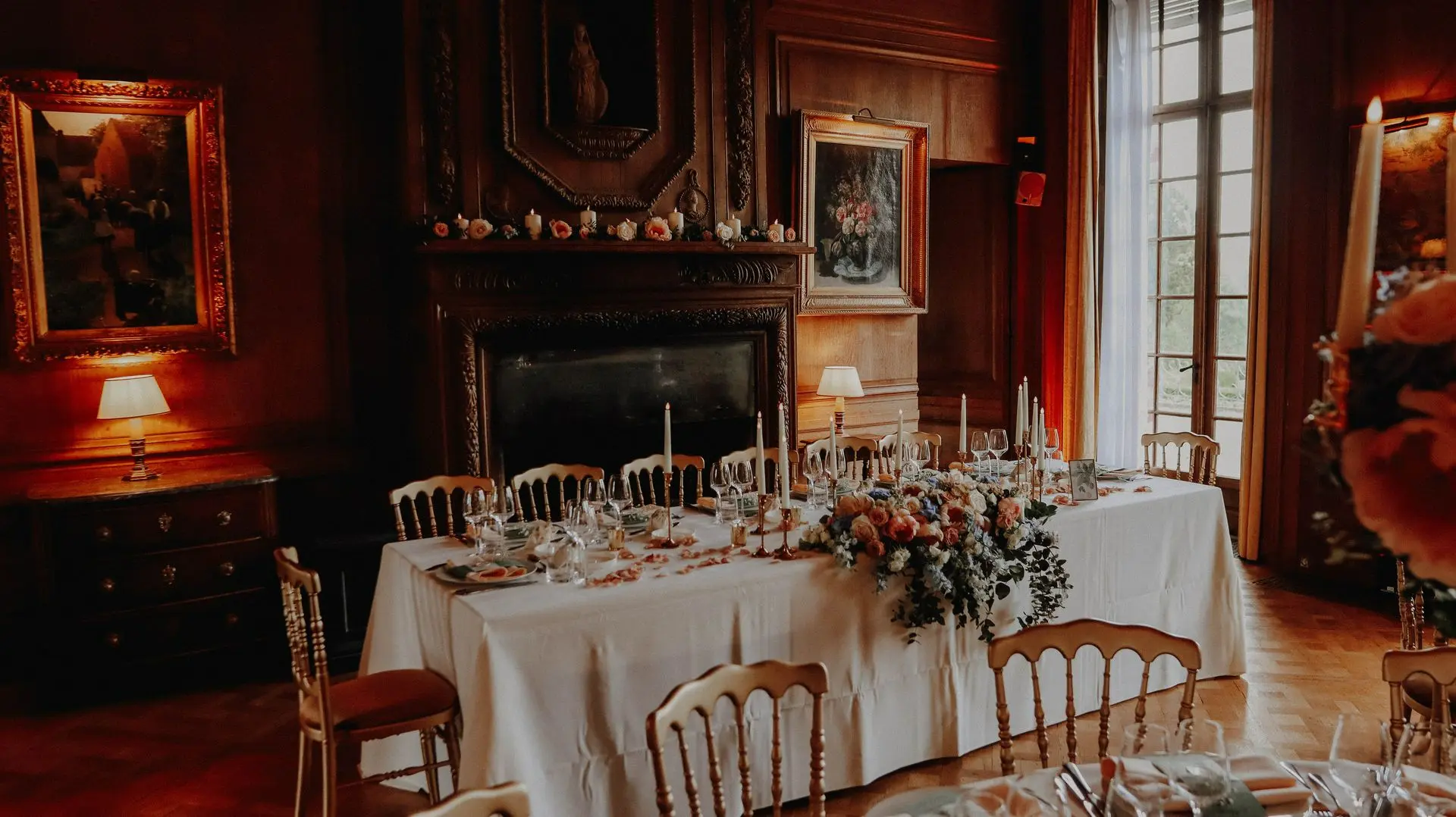Le plan de table, lui aussi en cadres or, s’harmonisait avec les tables décorées de chandeliers dorés et de compositions florales. La table d’honneur était sublimée par un montage floral avec une chute devant les mariés, et l’escalier a été décoré pour offrir une descente de mariée spectaculaire.