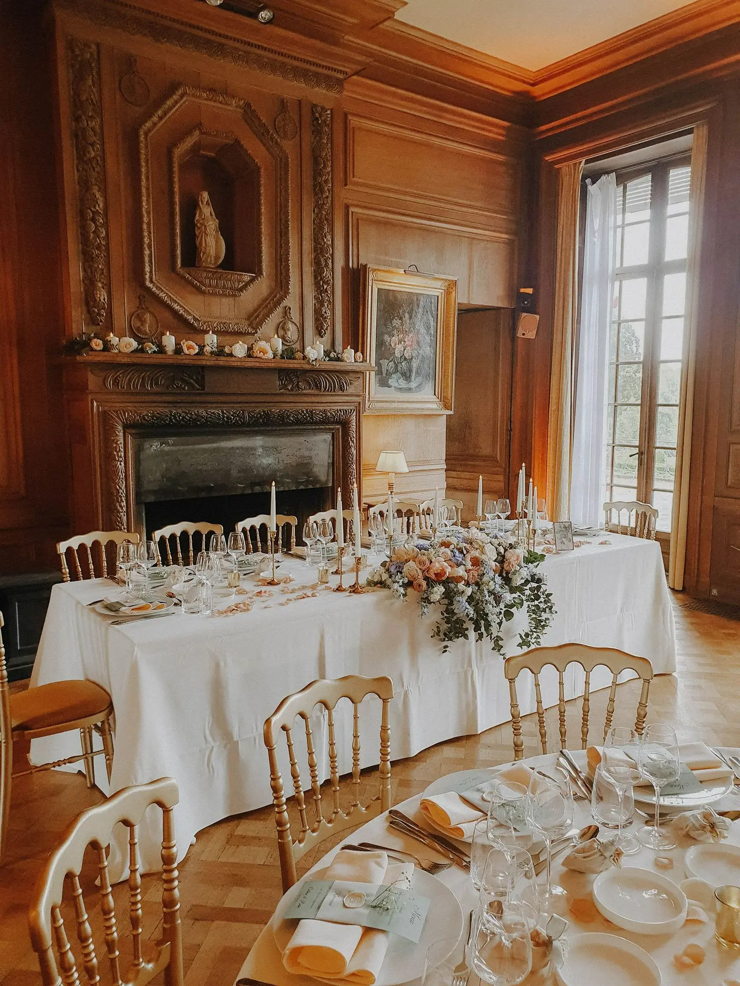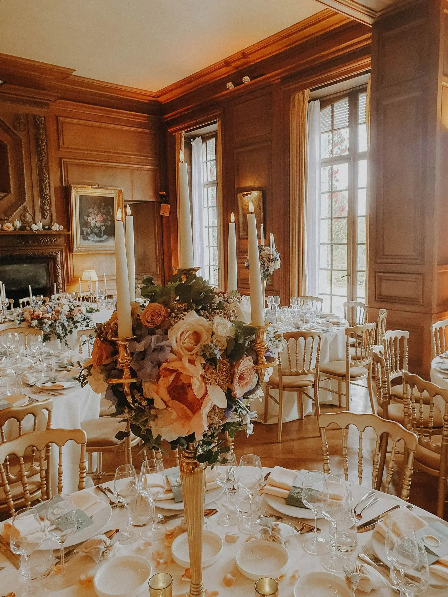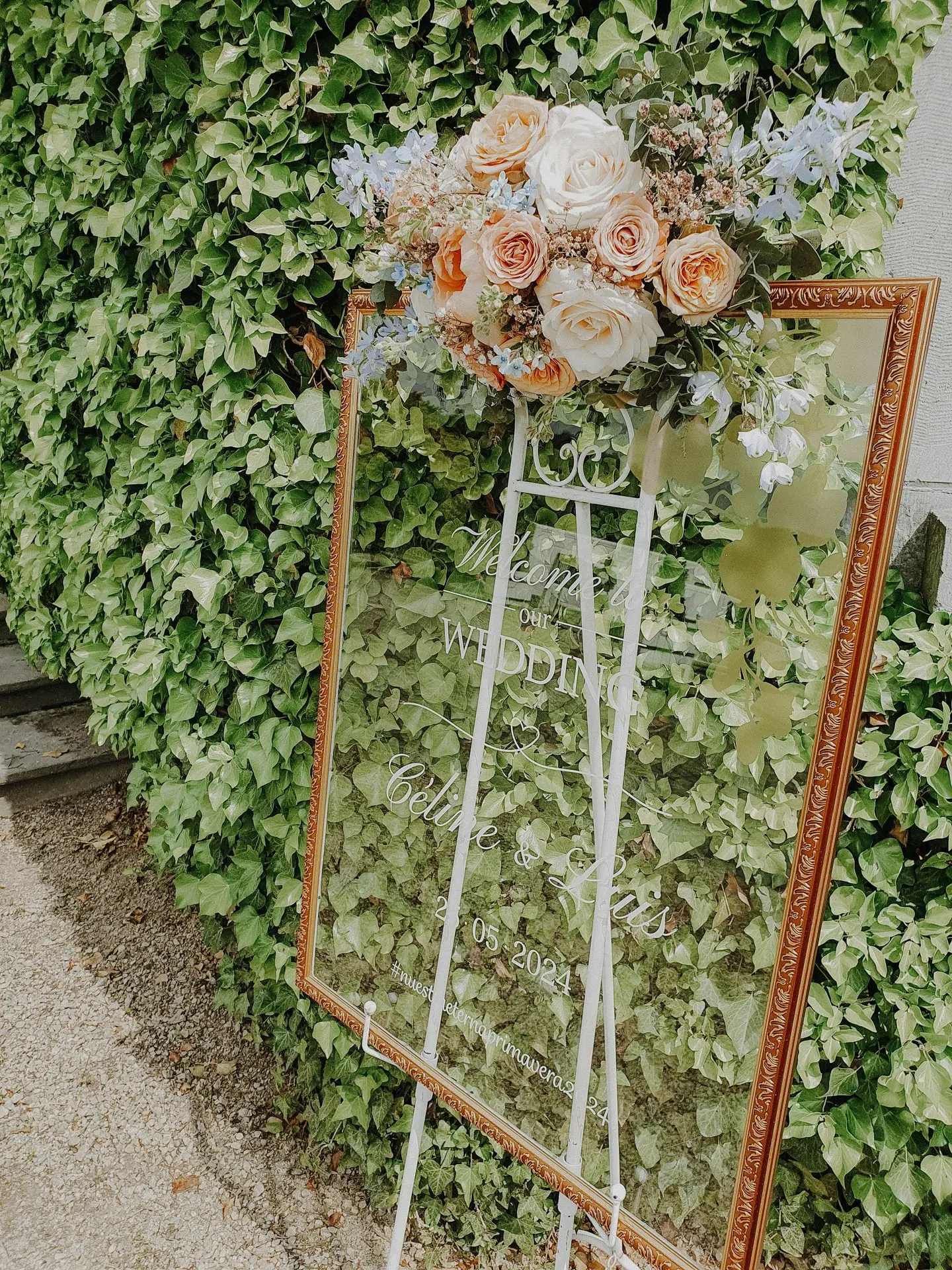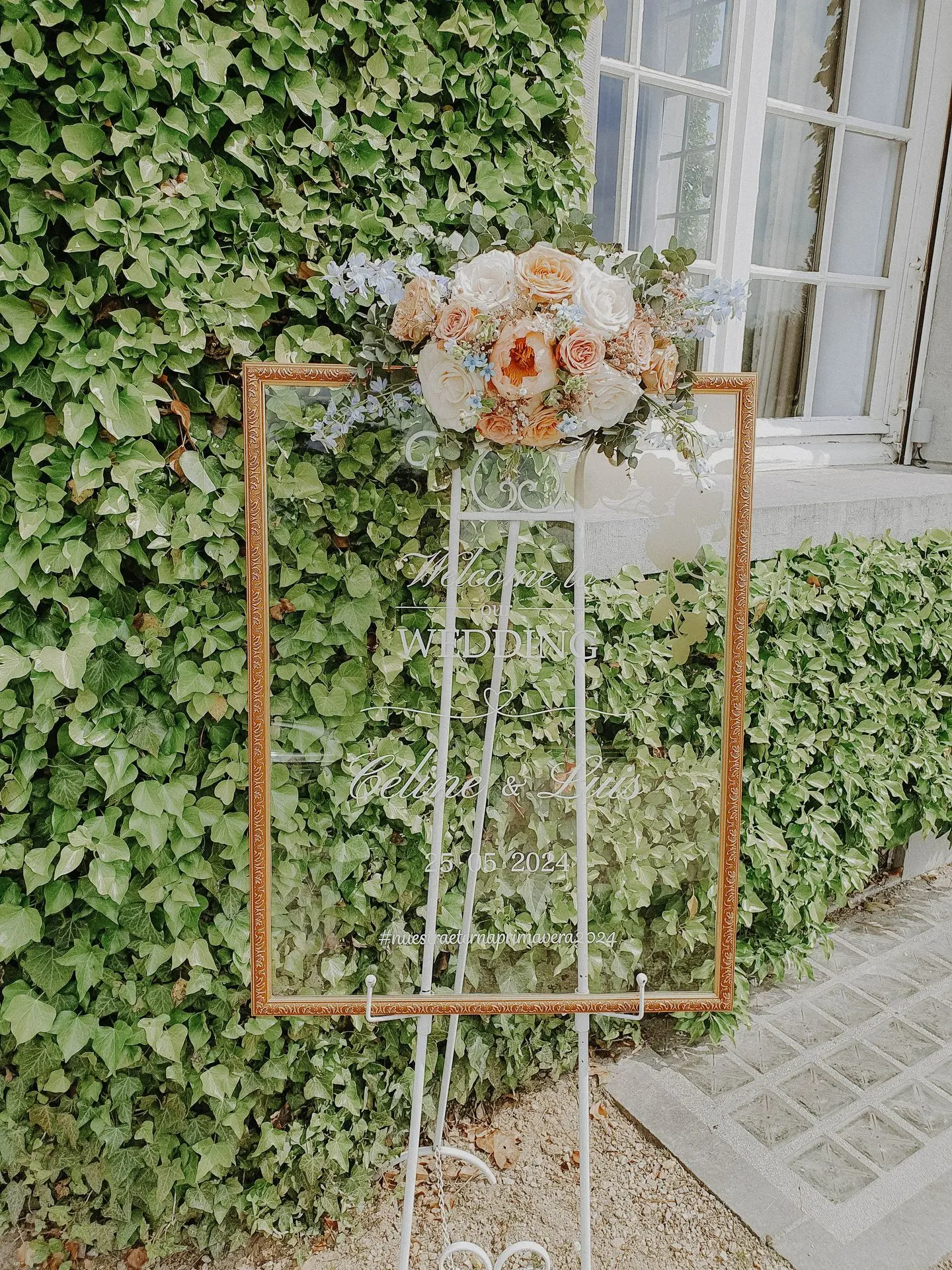J’ai eu le plaisir de créer le bouquet de mariée, installer les Médicis à l’entrée du château, ainsi que le panneau de bienvenue en cadre or et plexi transparent pour accueillir les invités avec élégance.