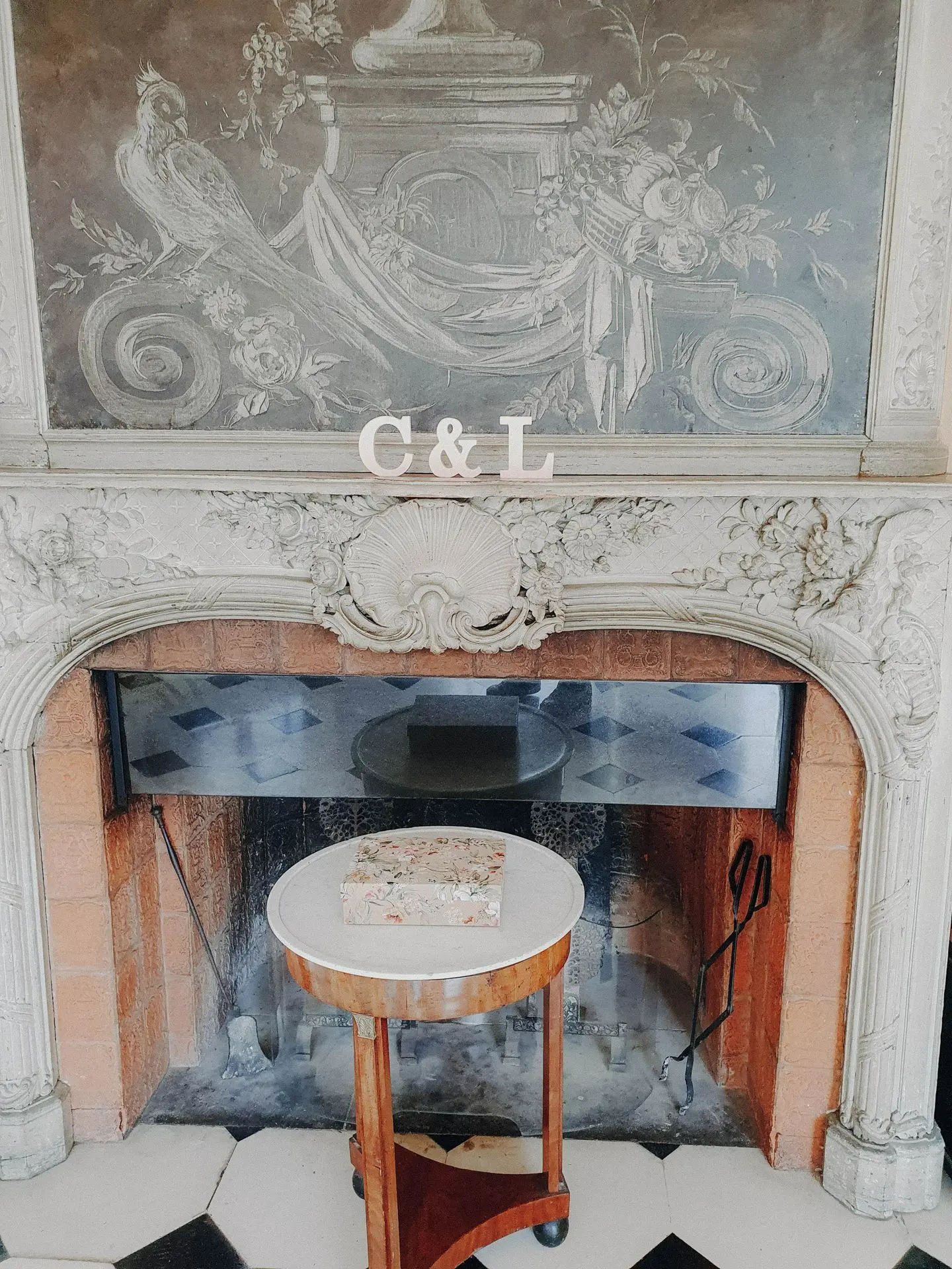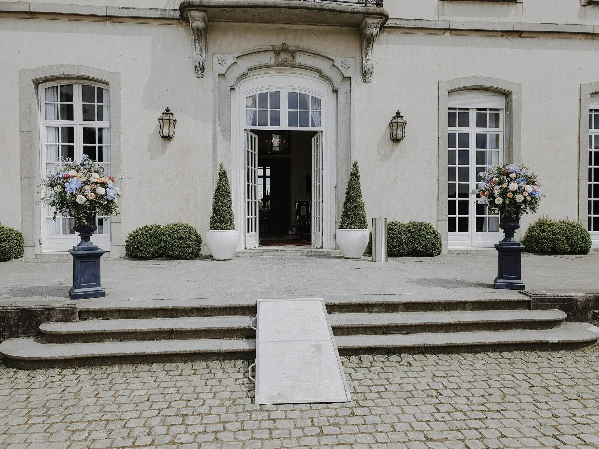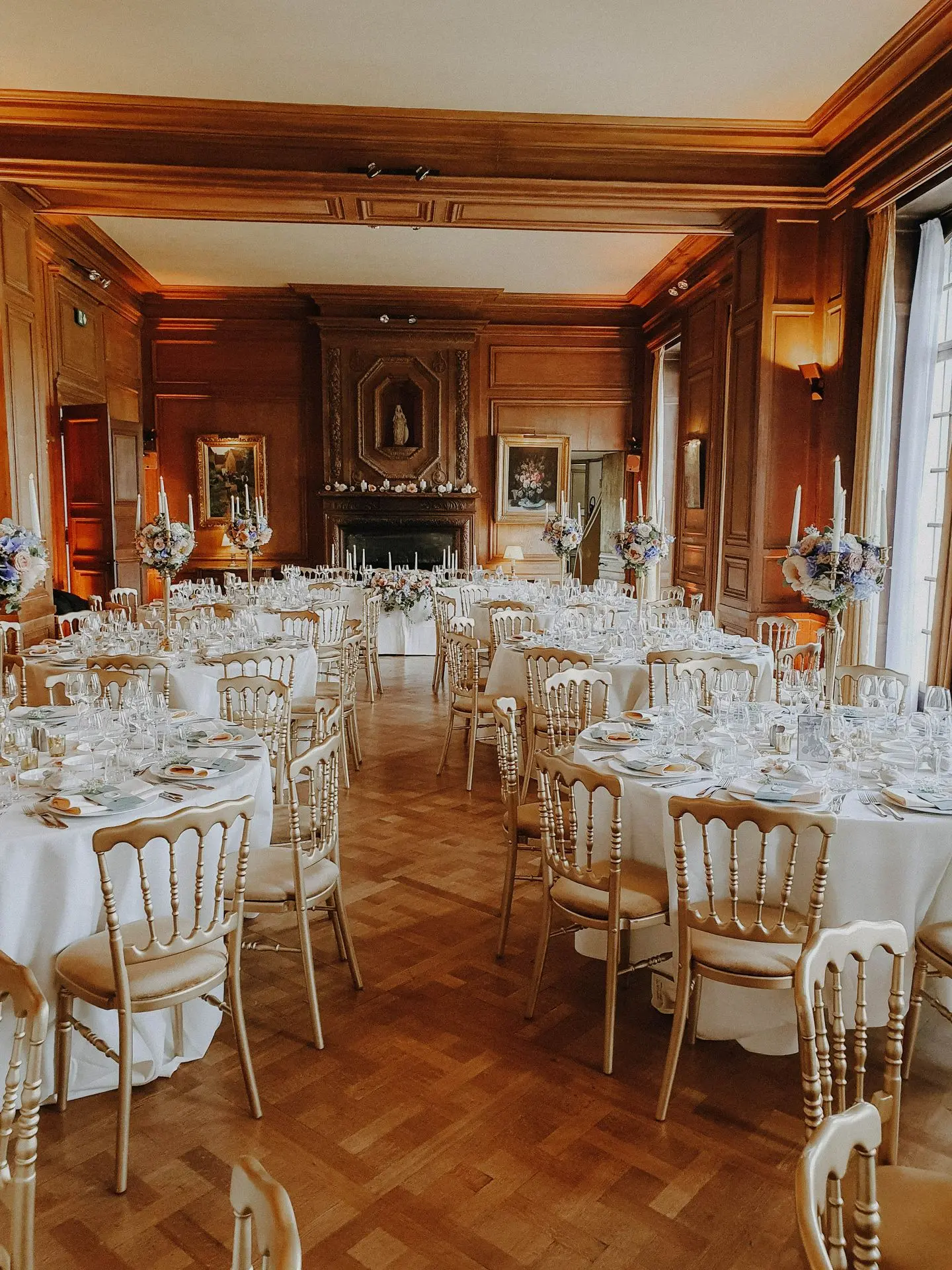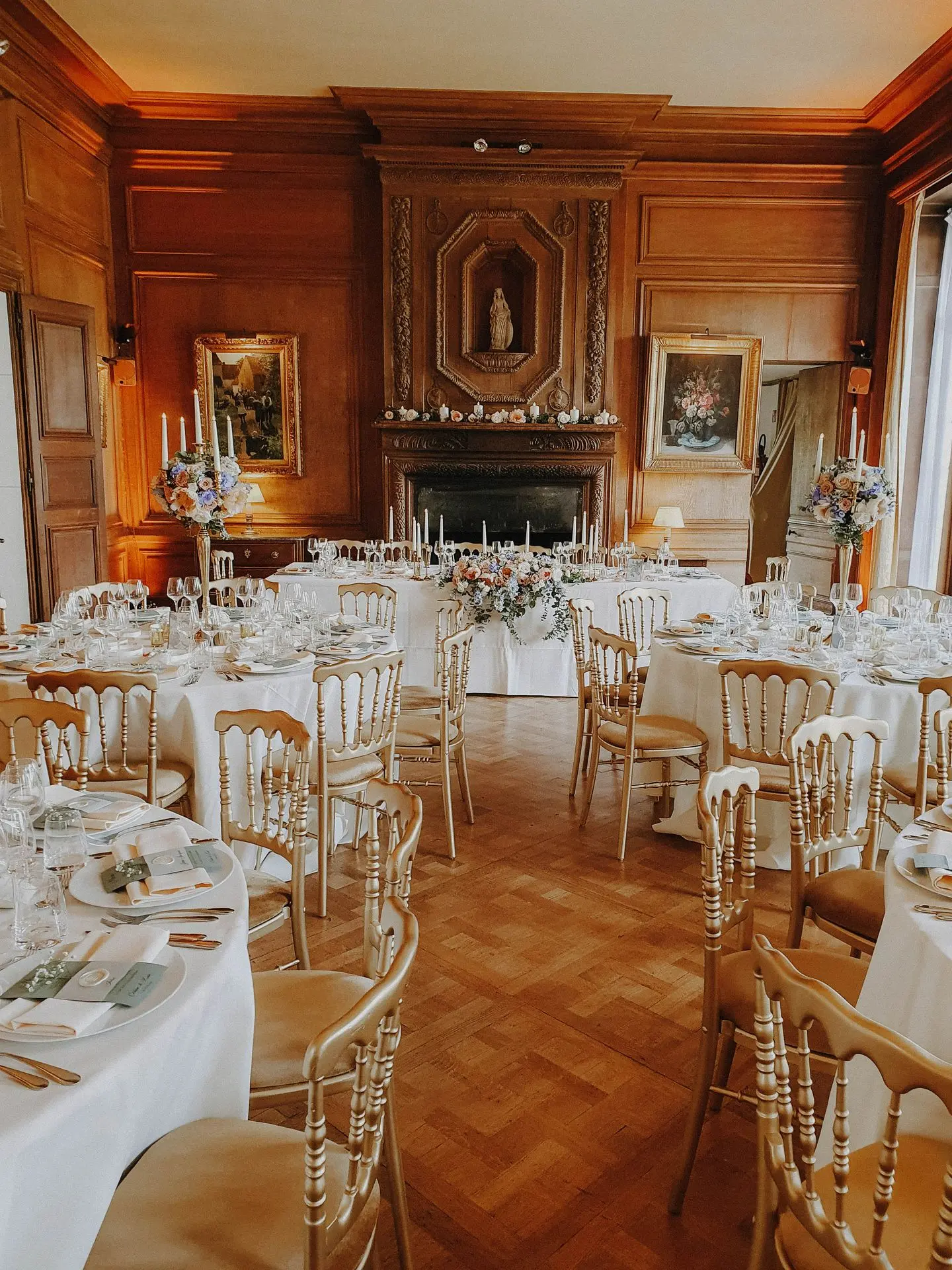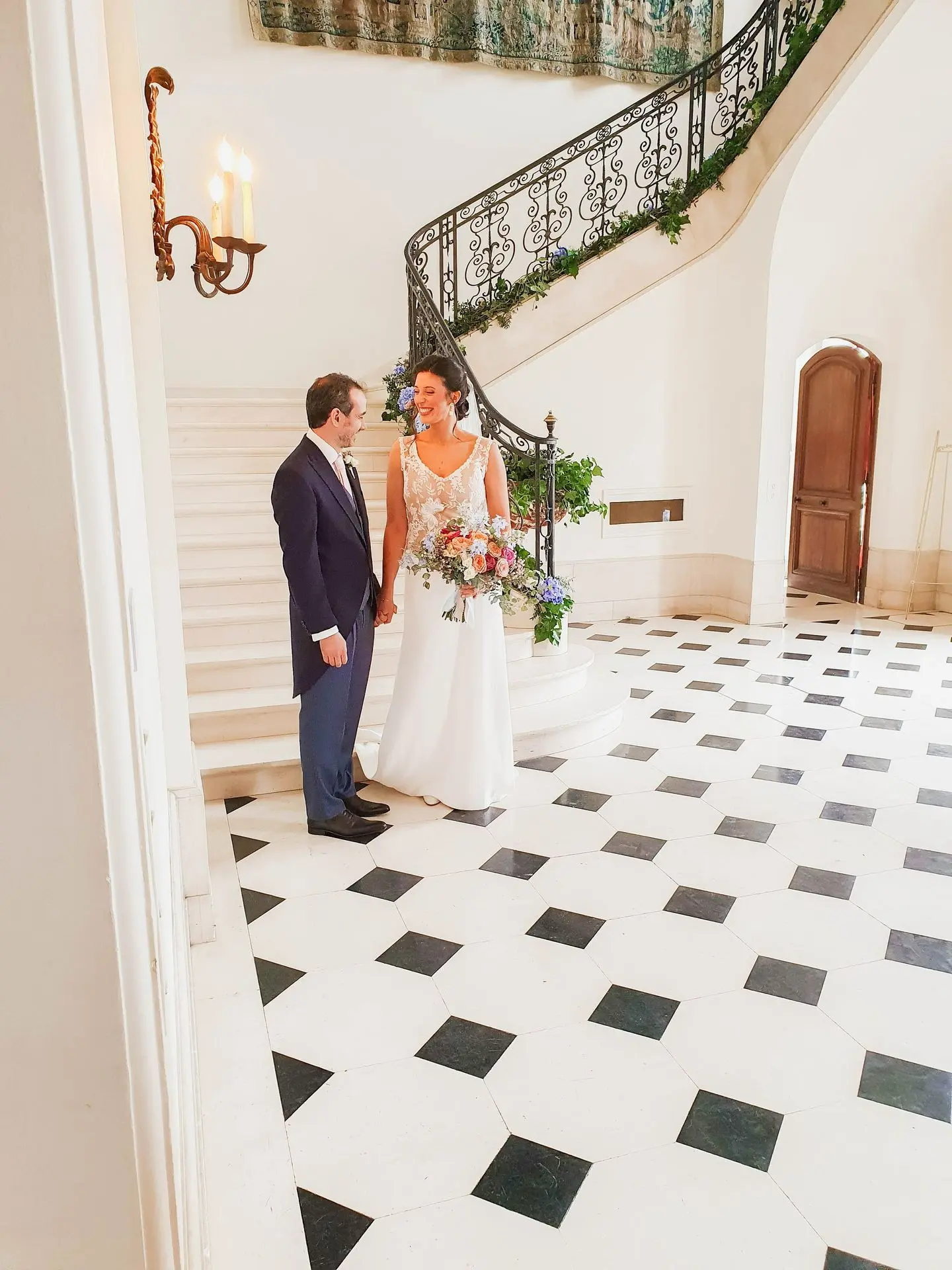 J’ai eu le plaisir de créer le bouquet de mariée, installer les Médicis à l’entrée du château, ainsi que le panneau de bienvenue en cadre or et plexi transparent pour accueillir les invités avec élégance.