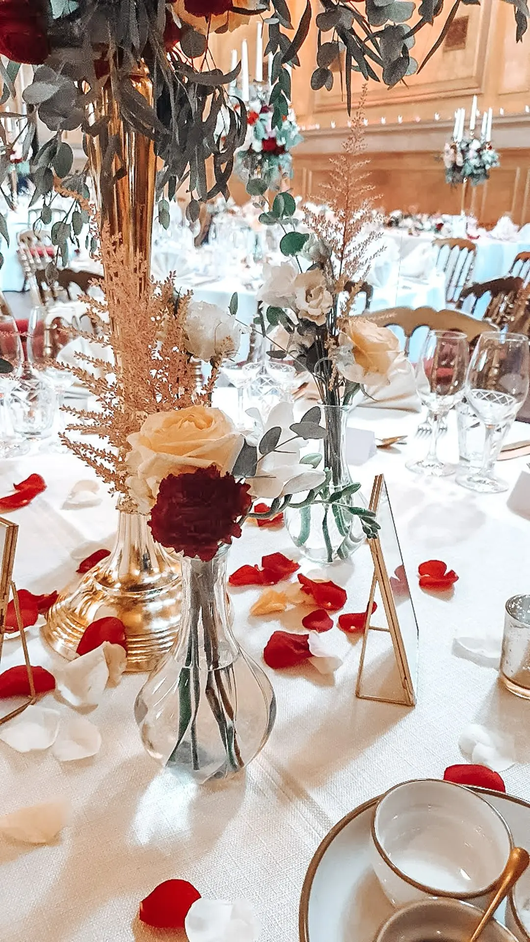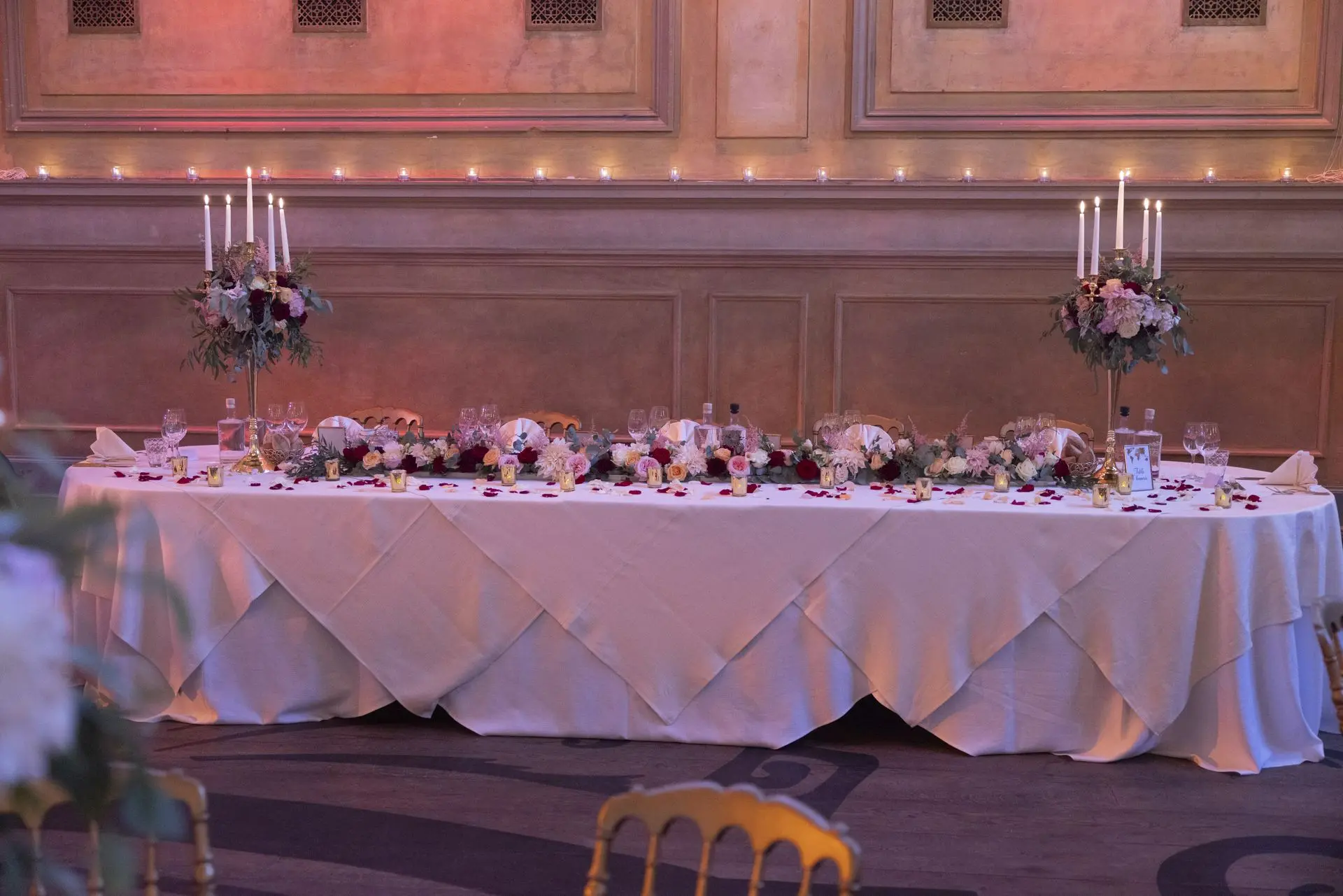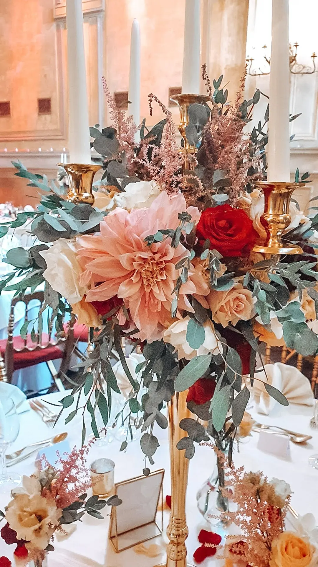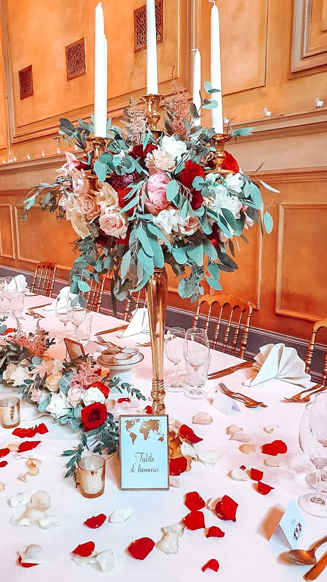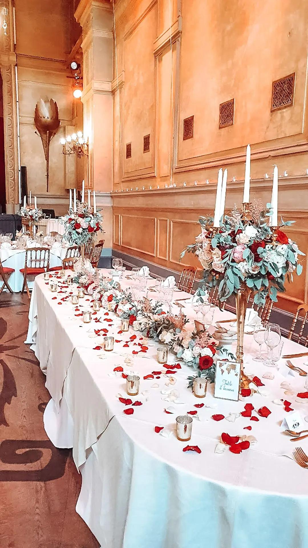 Les chandeliers fleuris, véritables pièces maîtresses, ont illuminé la salle tout en ajoutant une touche de romantisme. Les touches de rouge, subtilement intégrées dans la décoration, ont souligné l’intensité et l’émotion de cette journée exceptionnelle.