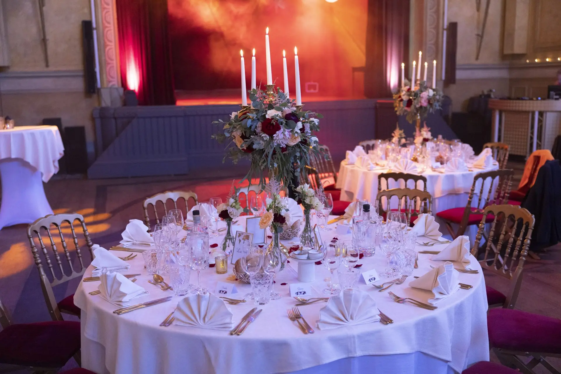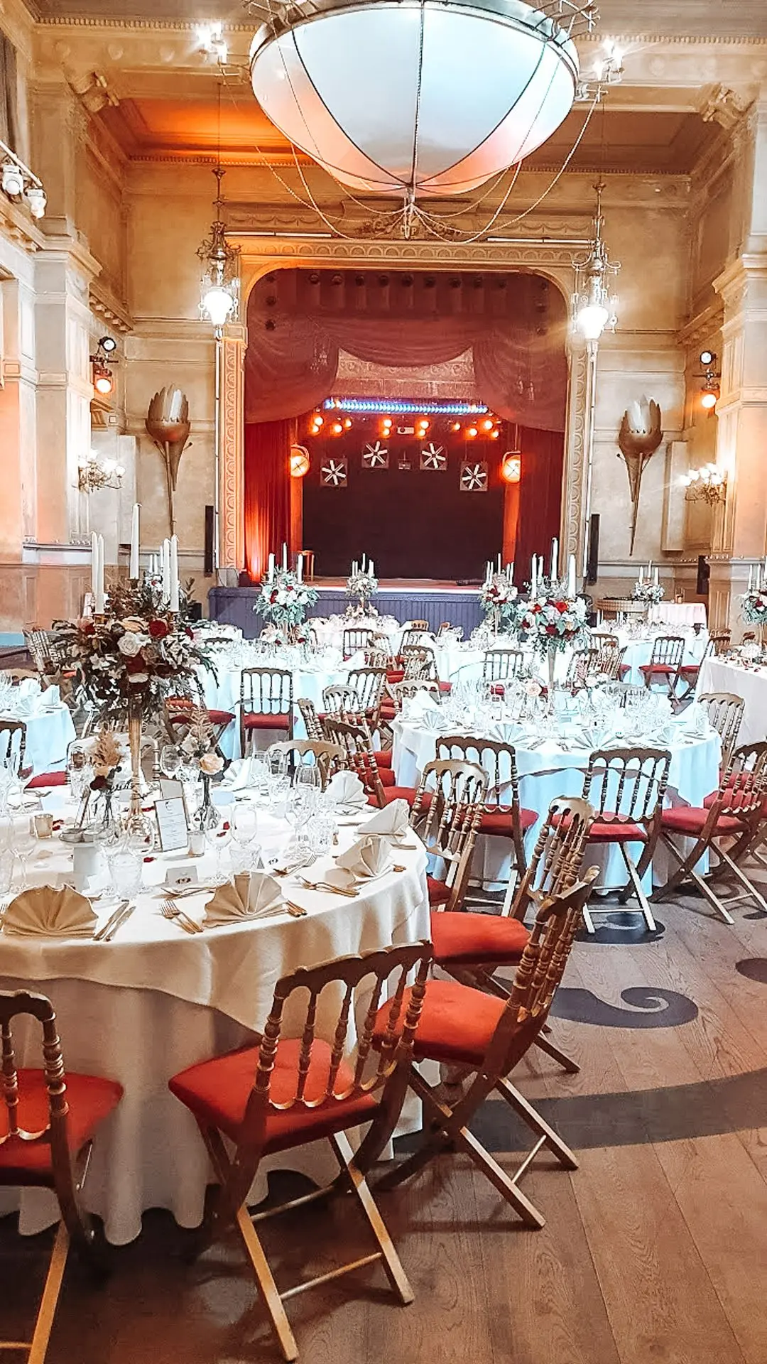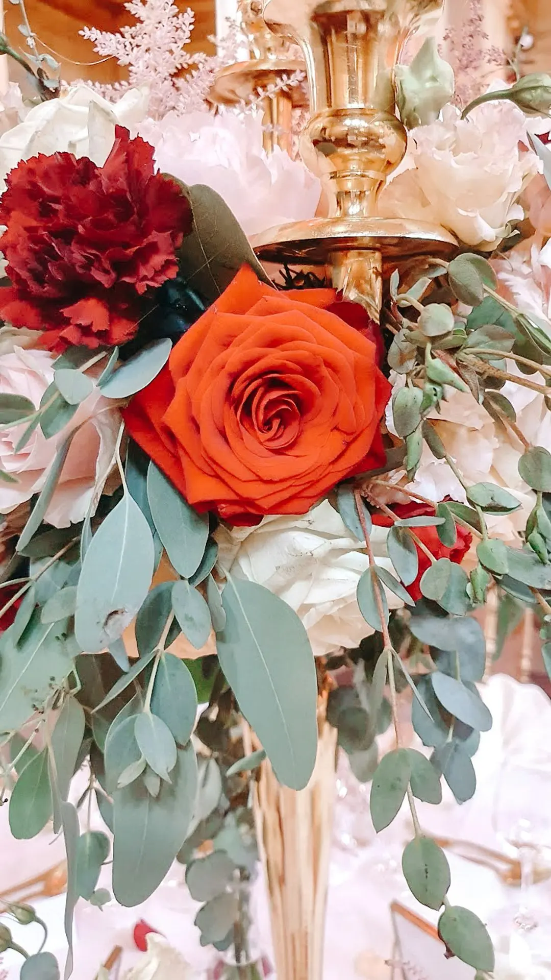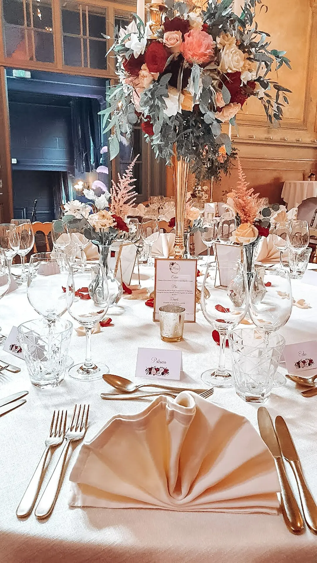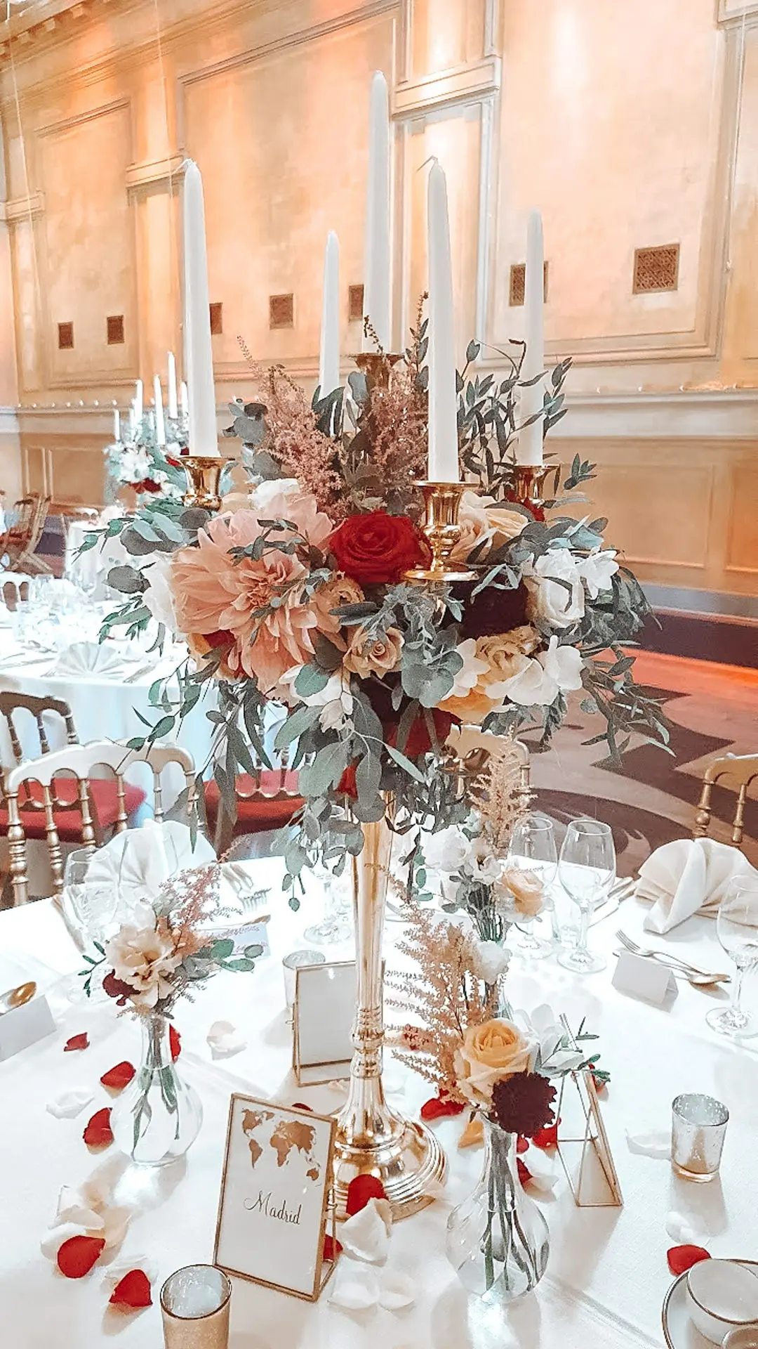 Les chandeliers fleuris, véritables pièces maîtresses, ont illuminé la salle tout en ajoutant une touche de romantisme. Les touches de rouge, subtilement intégrées dans la décoration, ont souligné l’intensité et l’émotion de cette journée exceptionnelle.