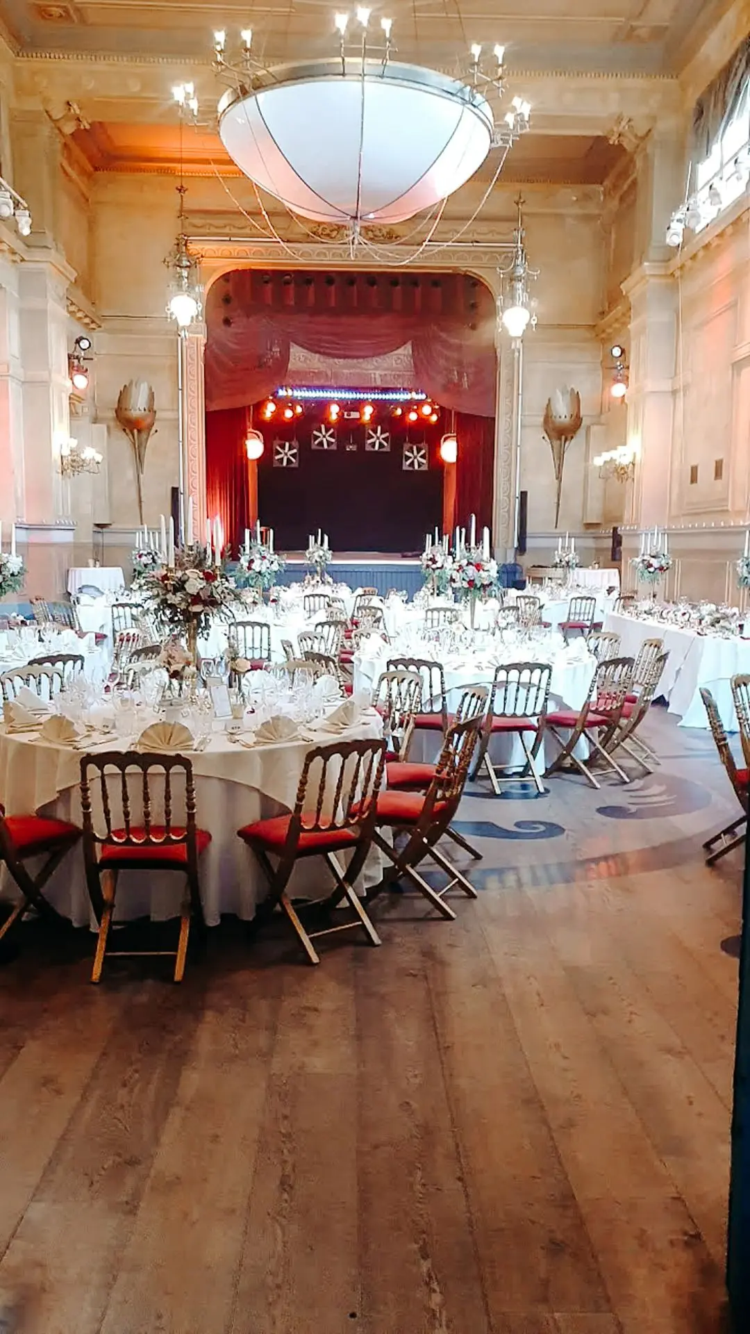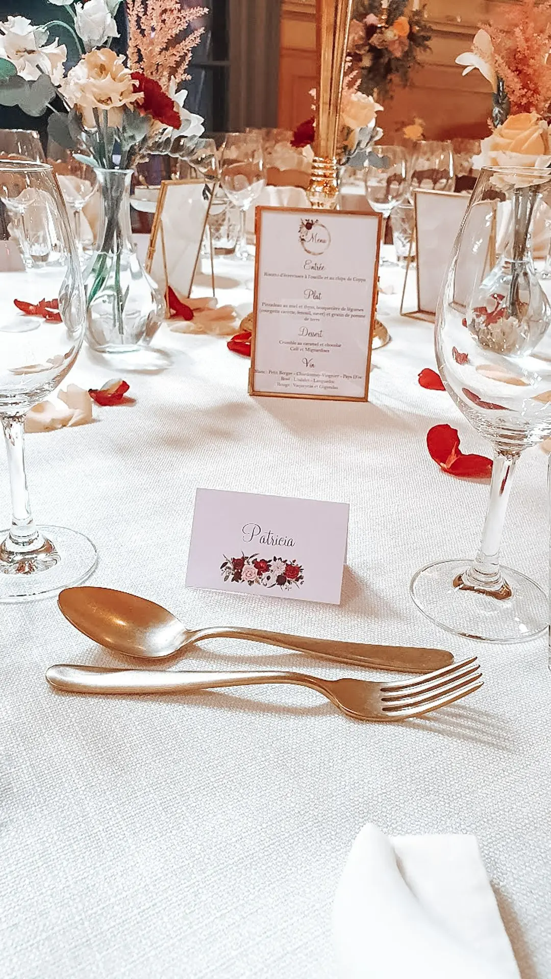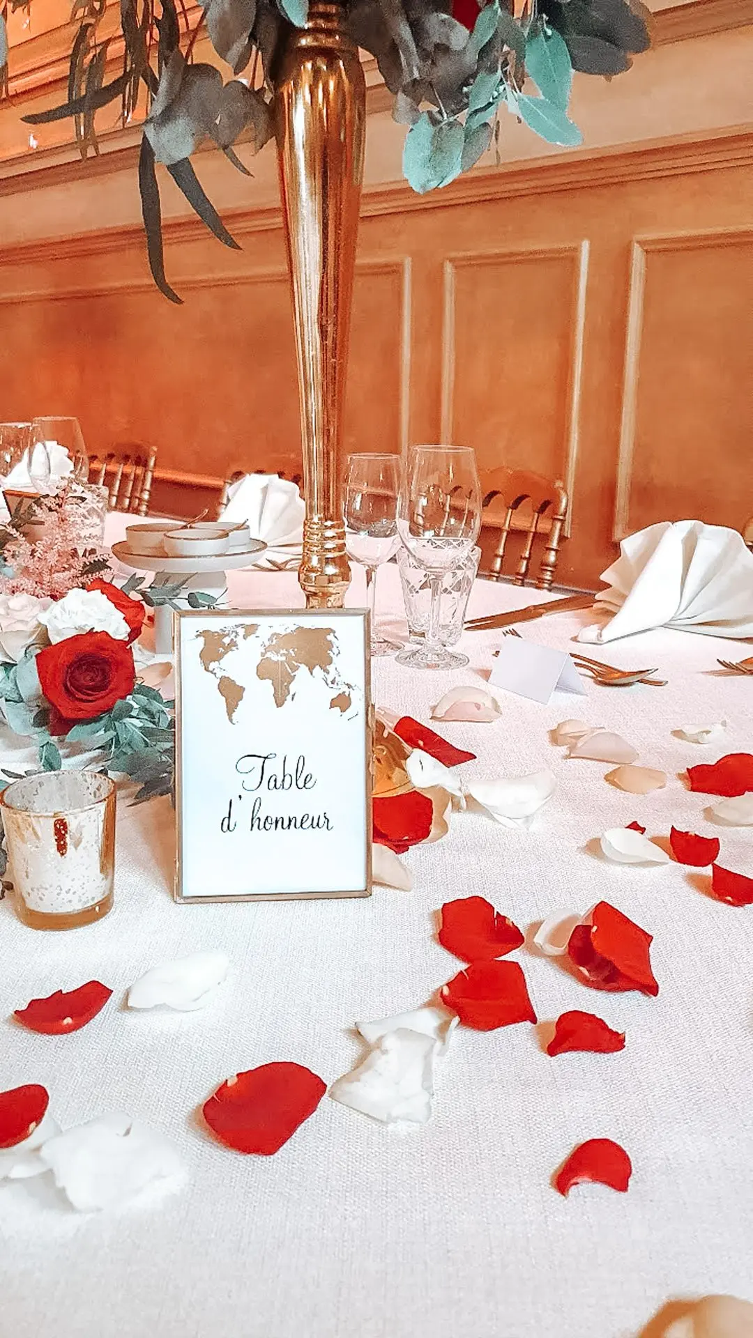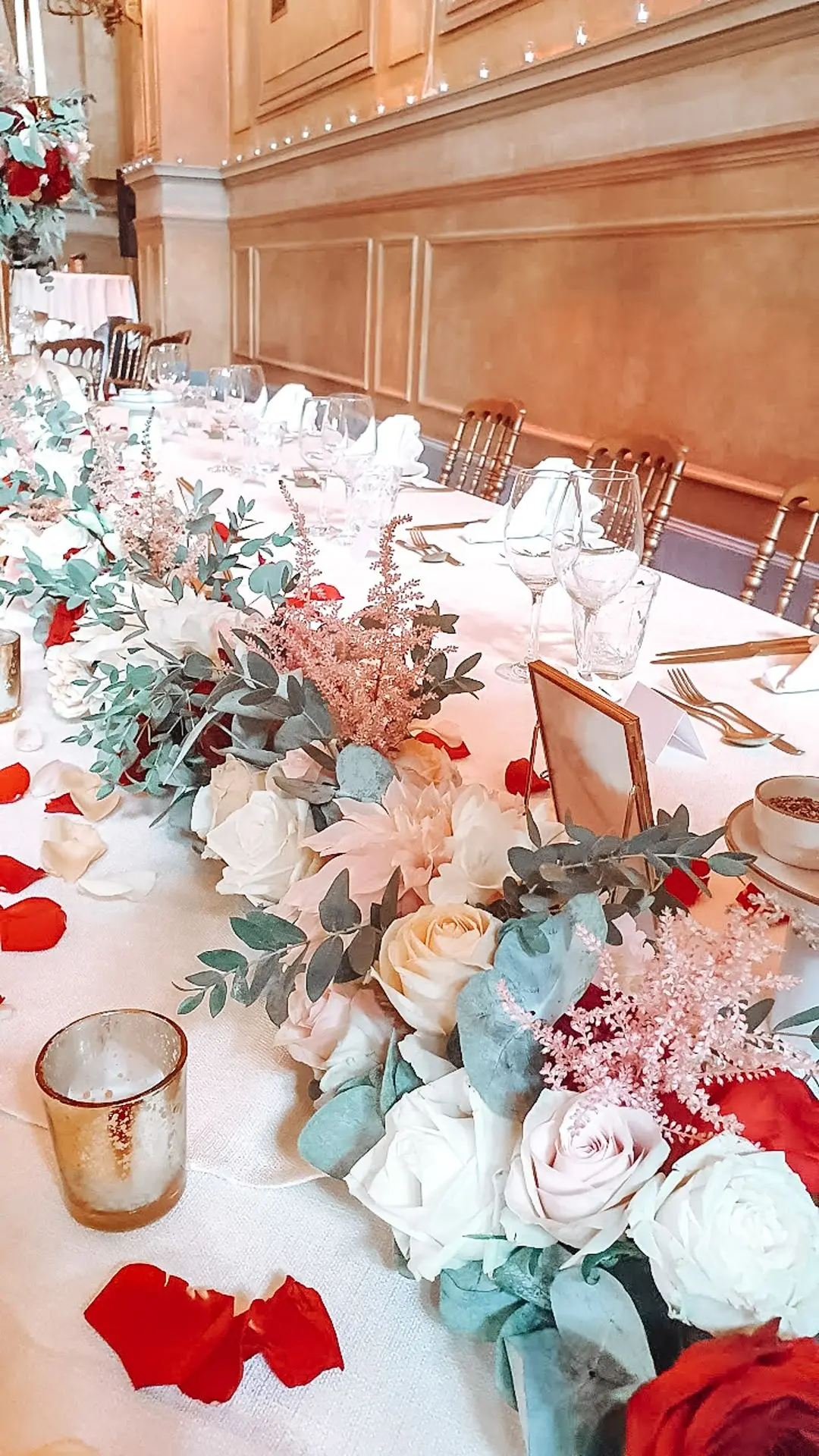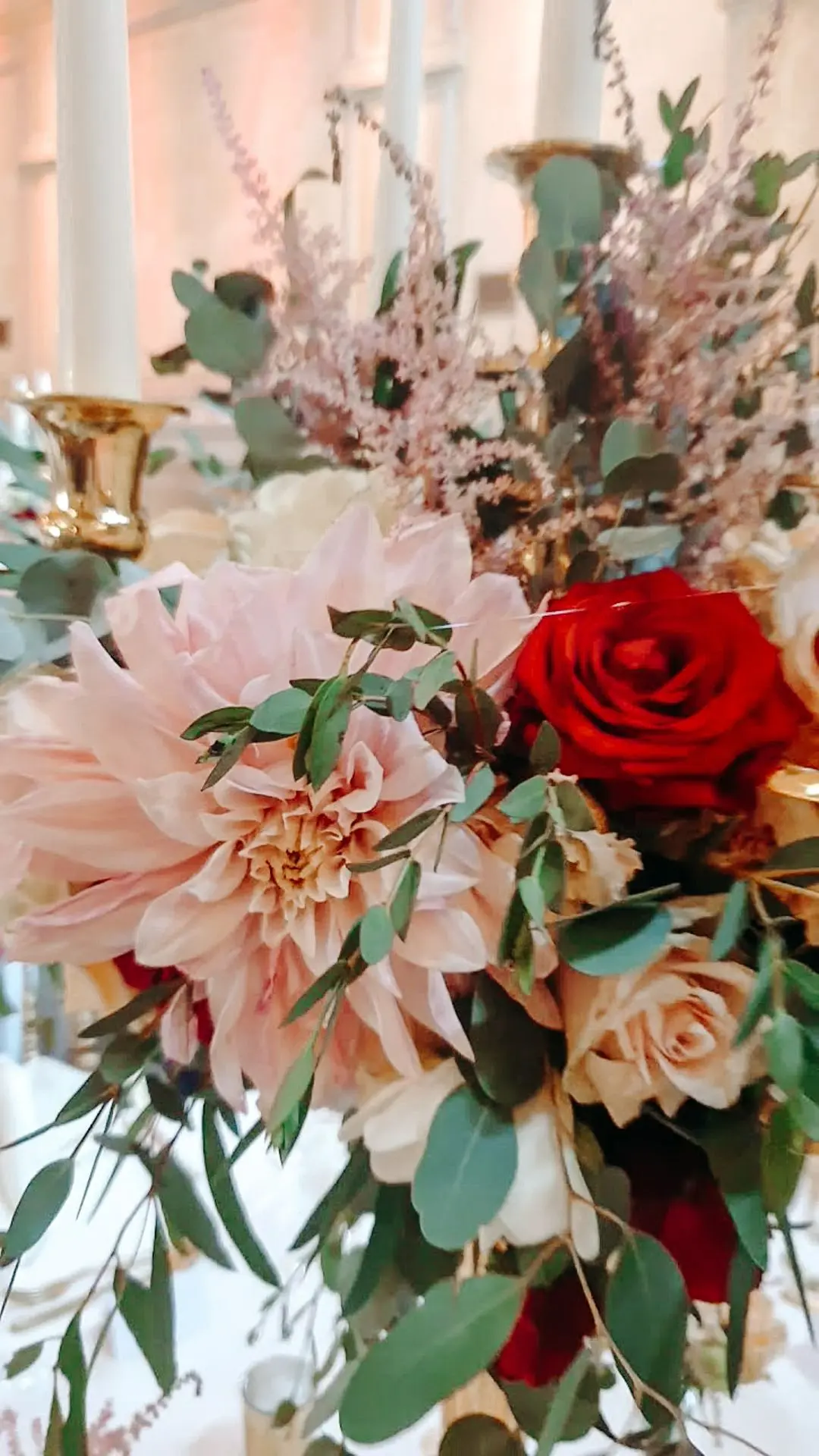 Les chandeliers fleuris, véritables pièces maîtresses, ont illuminé la salle tout en ajoutant une touche de romantisme. Les touches de rouge, subtilement intégrées dans la décoration, ont souligné l’intensité et l’émotion de cette journée exceptionnelle.
