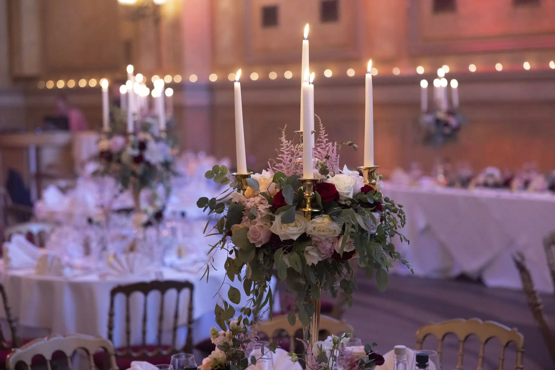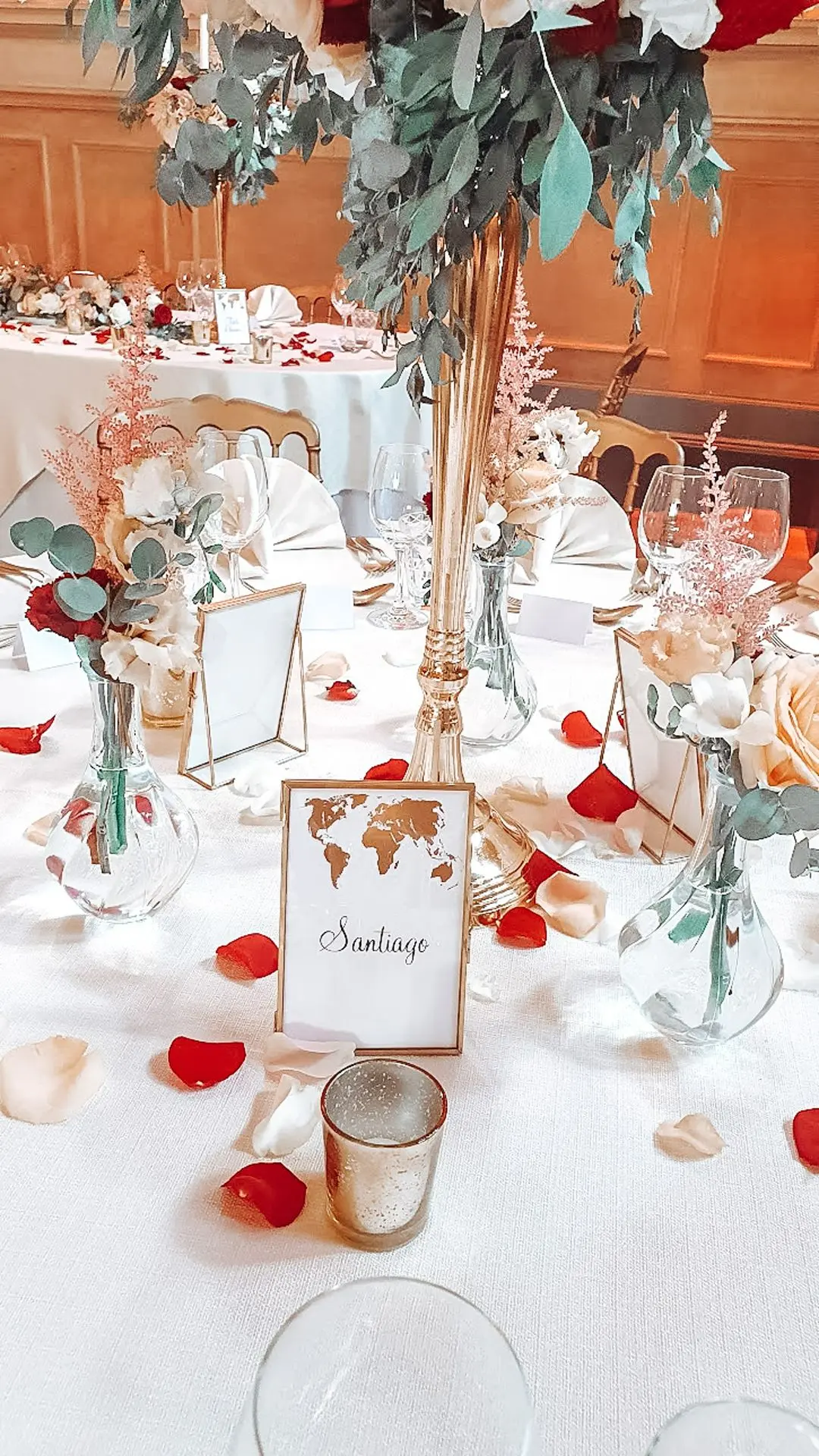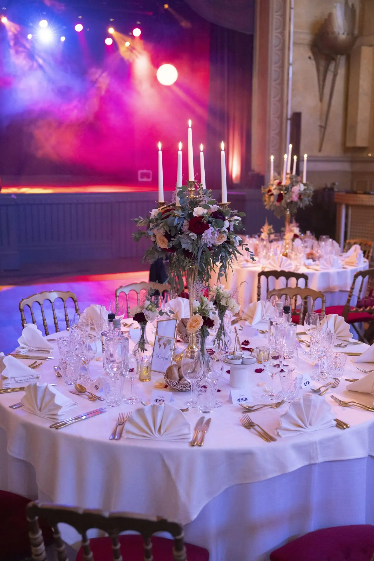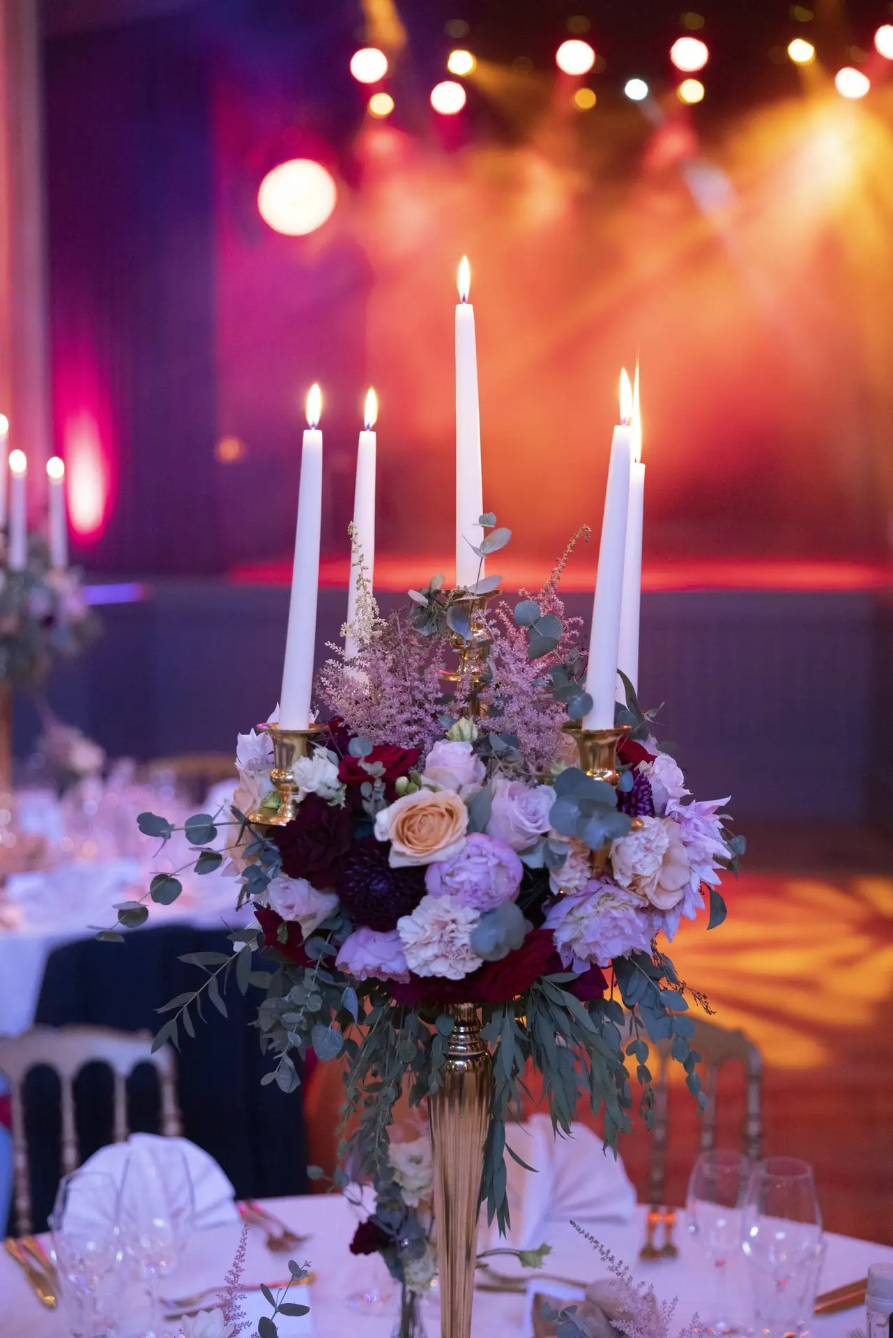 Les chandeliers fleuris, véritables pièces maîtresses, ont illuminé la salle tout en ajoutant une touche de romantisme. Les touches de rouge, subtilement intégrées dans la décoration, ont souligné l’intensité et l’émotion de cette journée exceptionnelle.