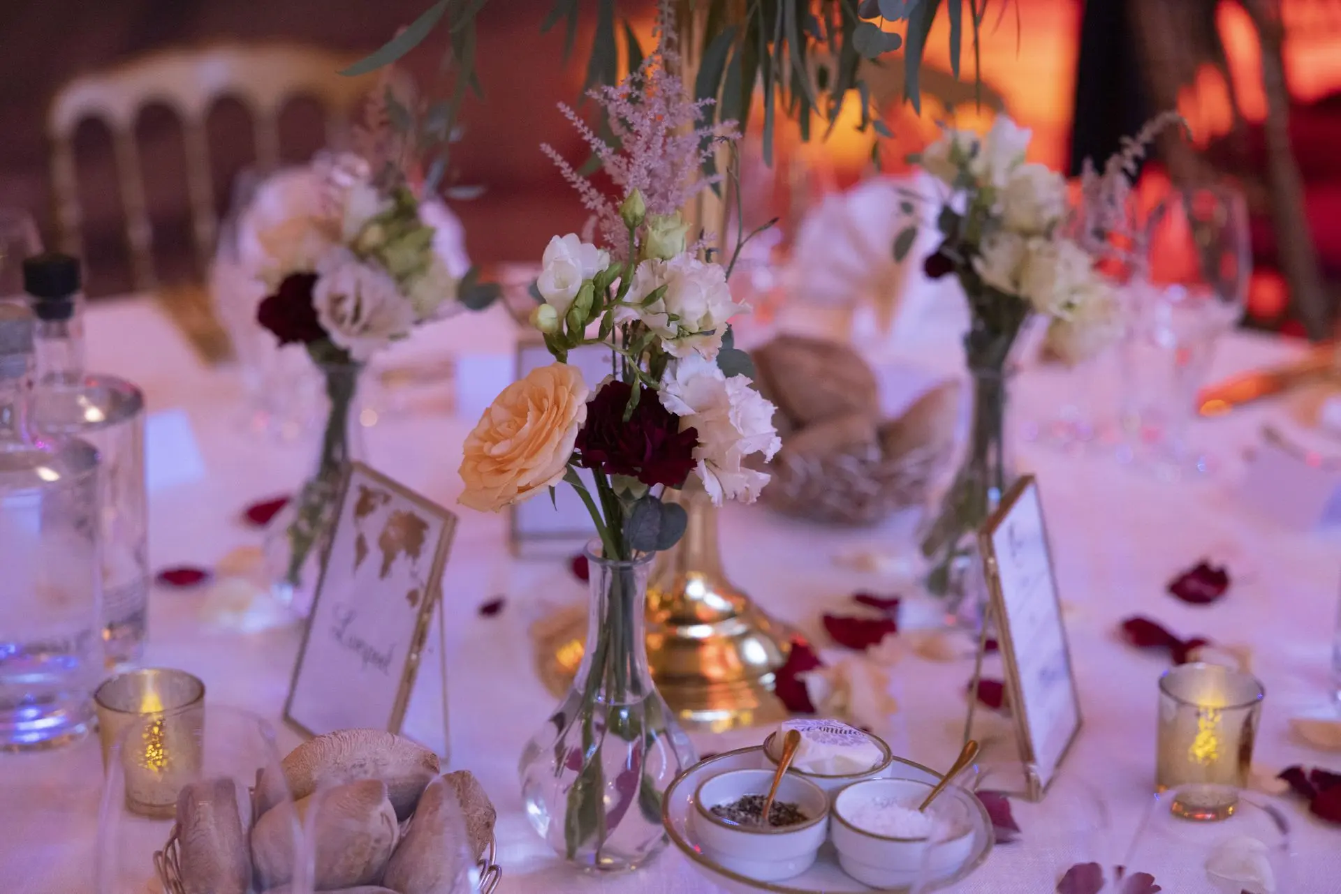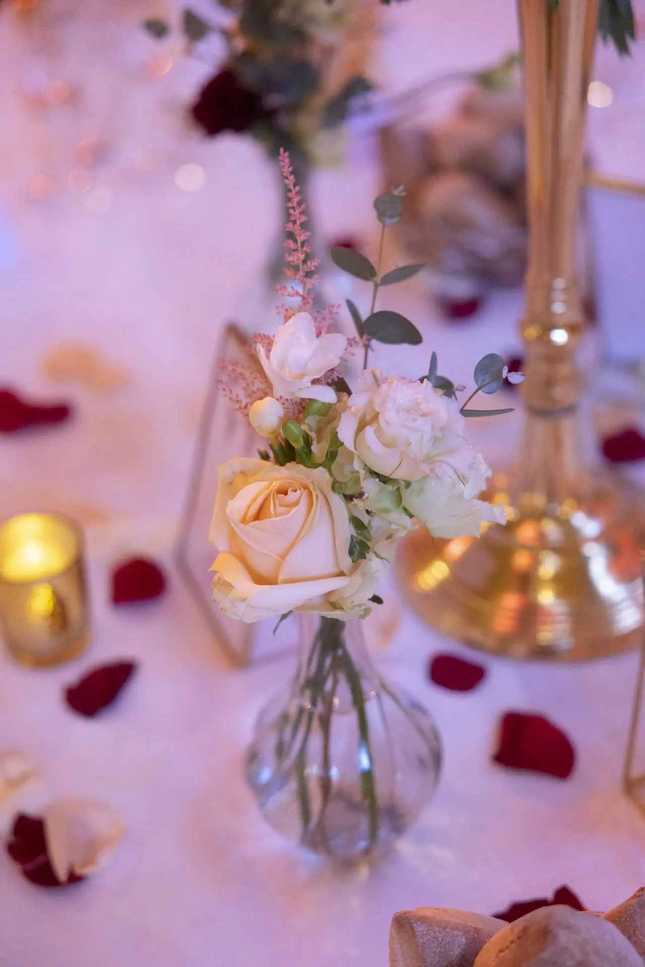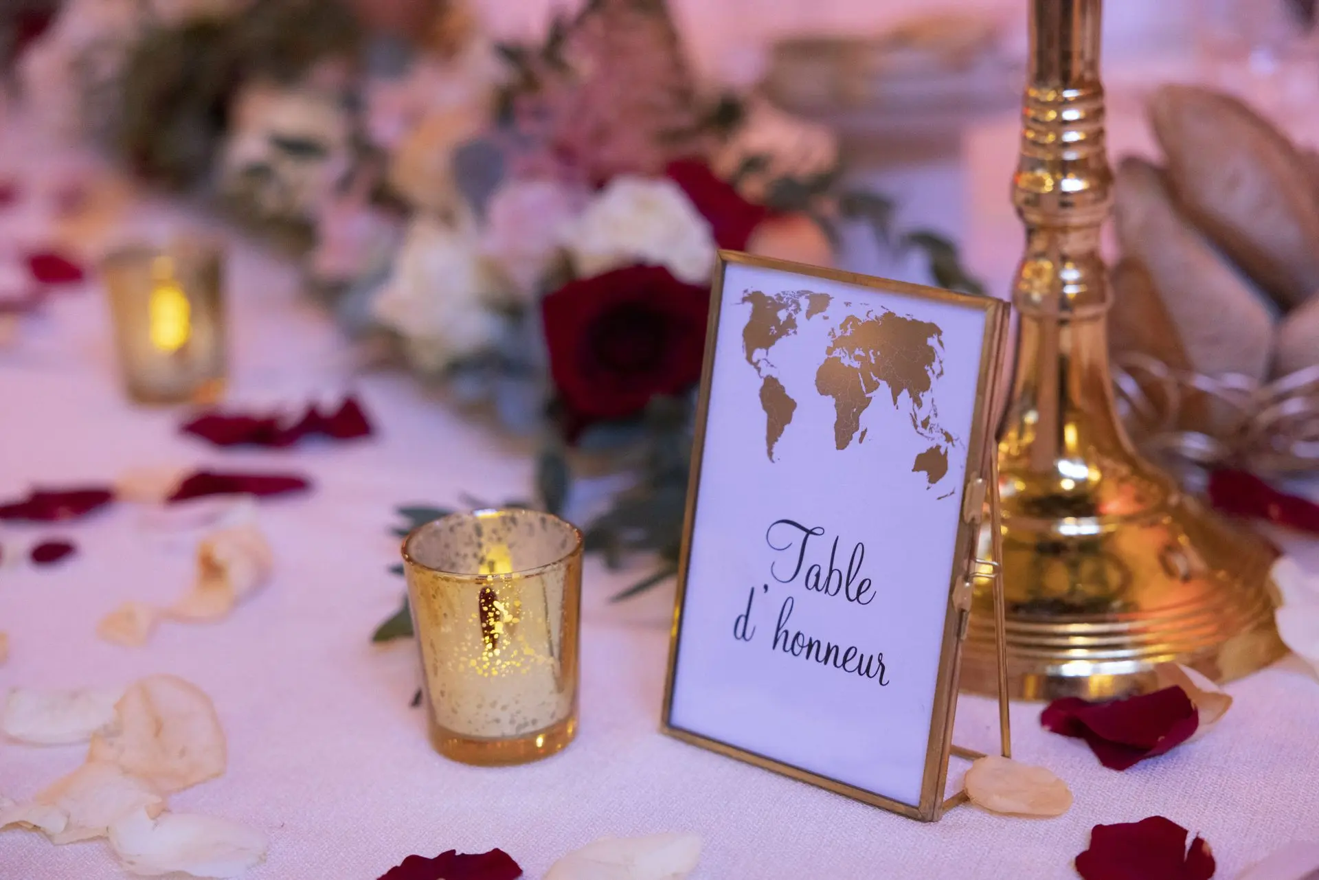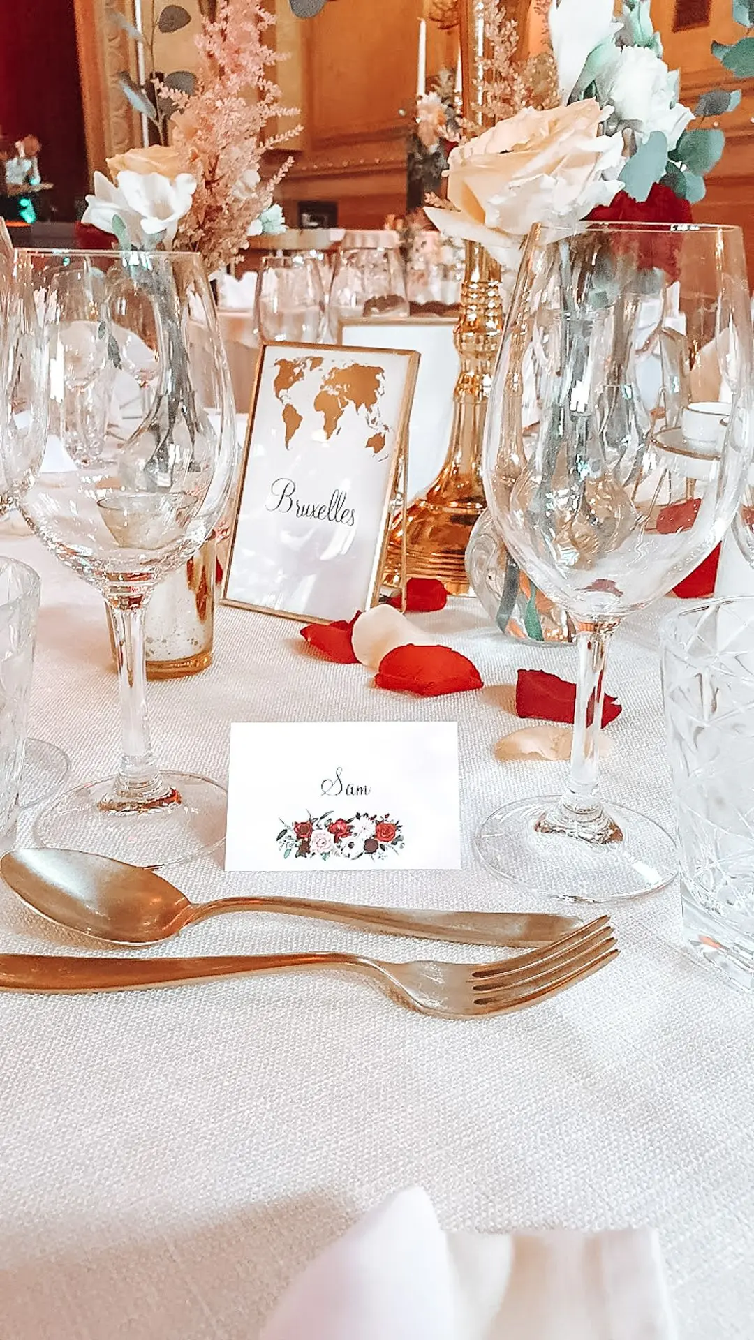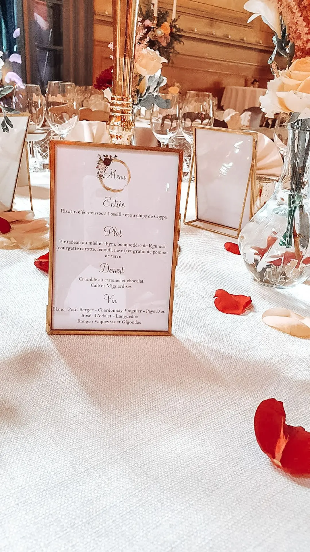 Les chandeliers fleuris, véritables pièces maîtresses, ont illuminé la salle tout en ajoutant une touche de romantisme. Les touches de rouge, subtilement intégrées dans la décoration, ont souligné l’intensité et l’émotion de cette journée exceptionnelle.