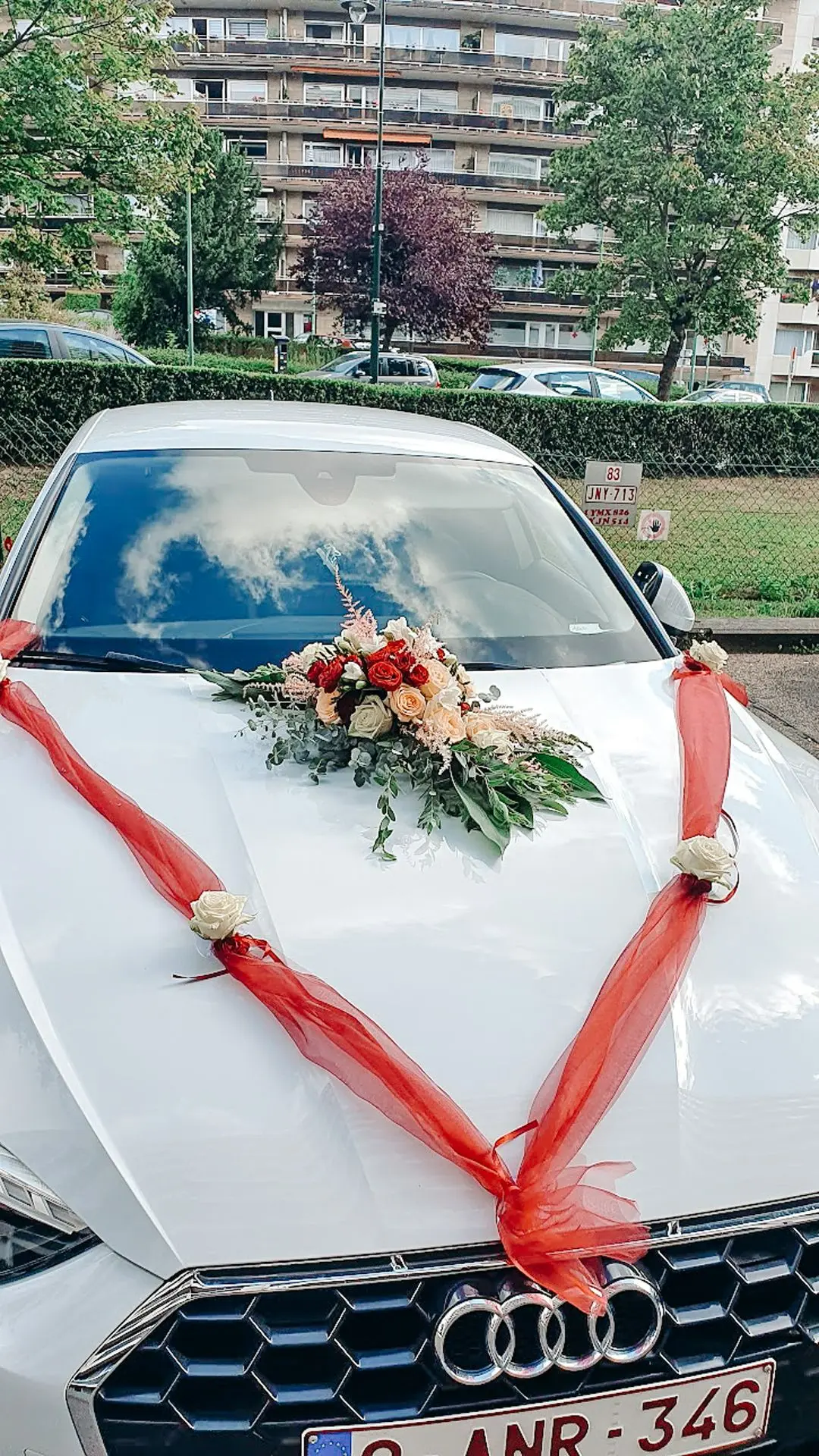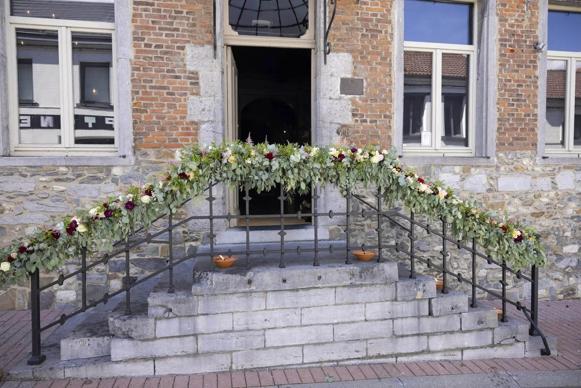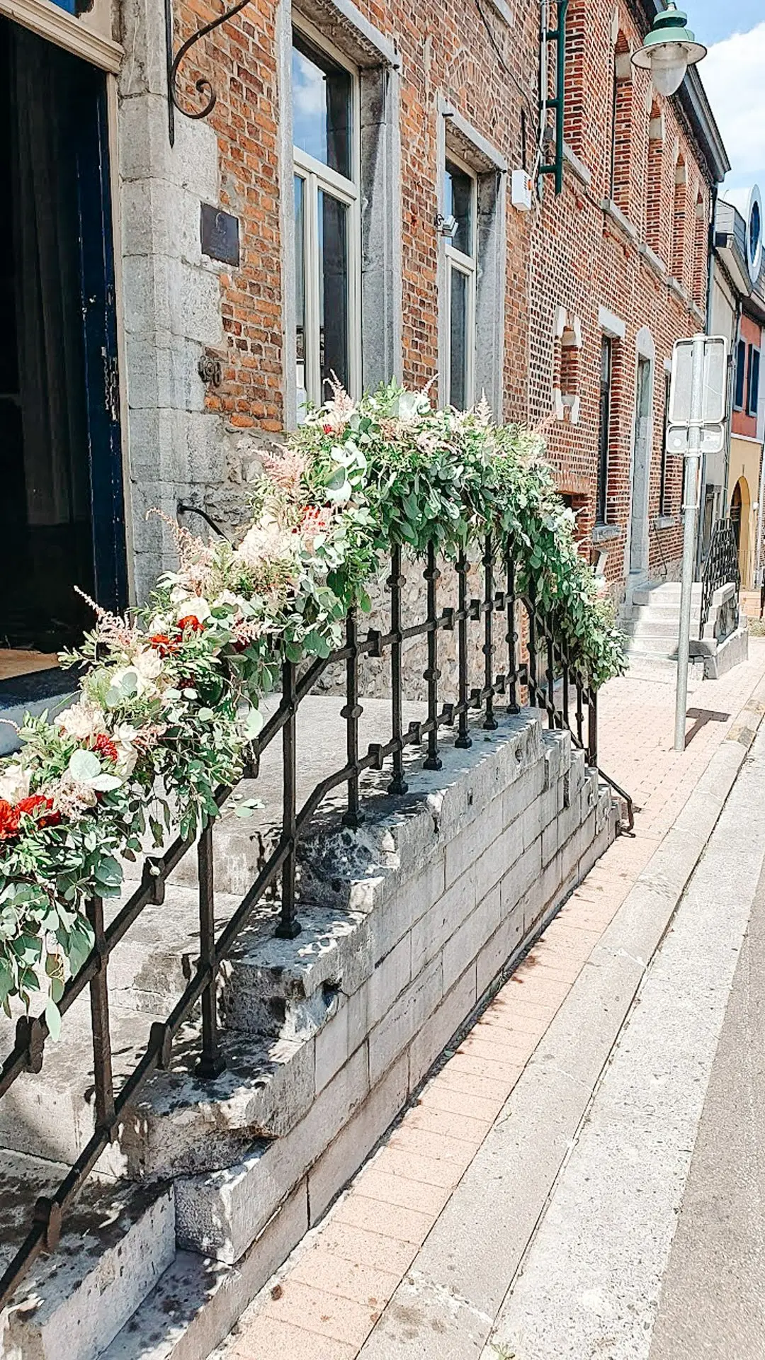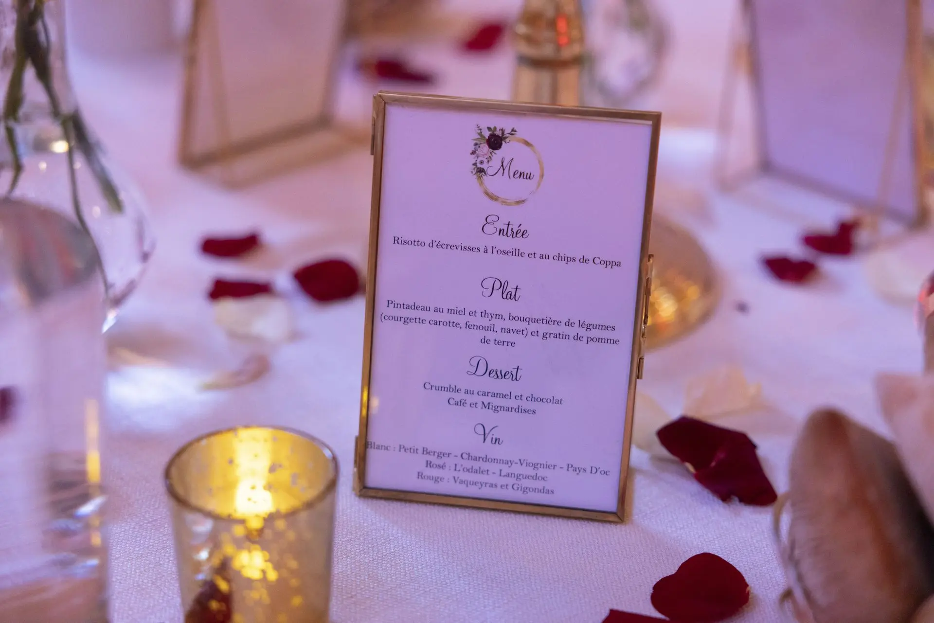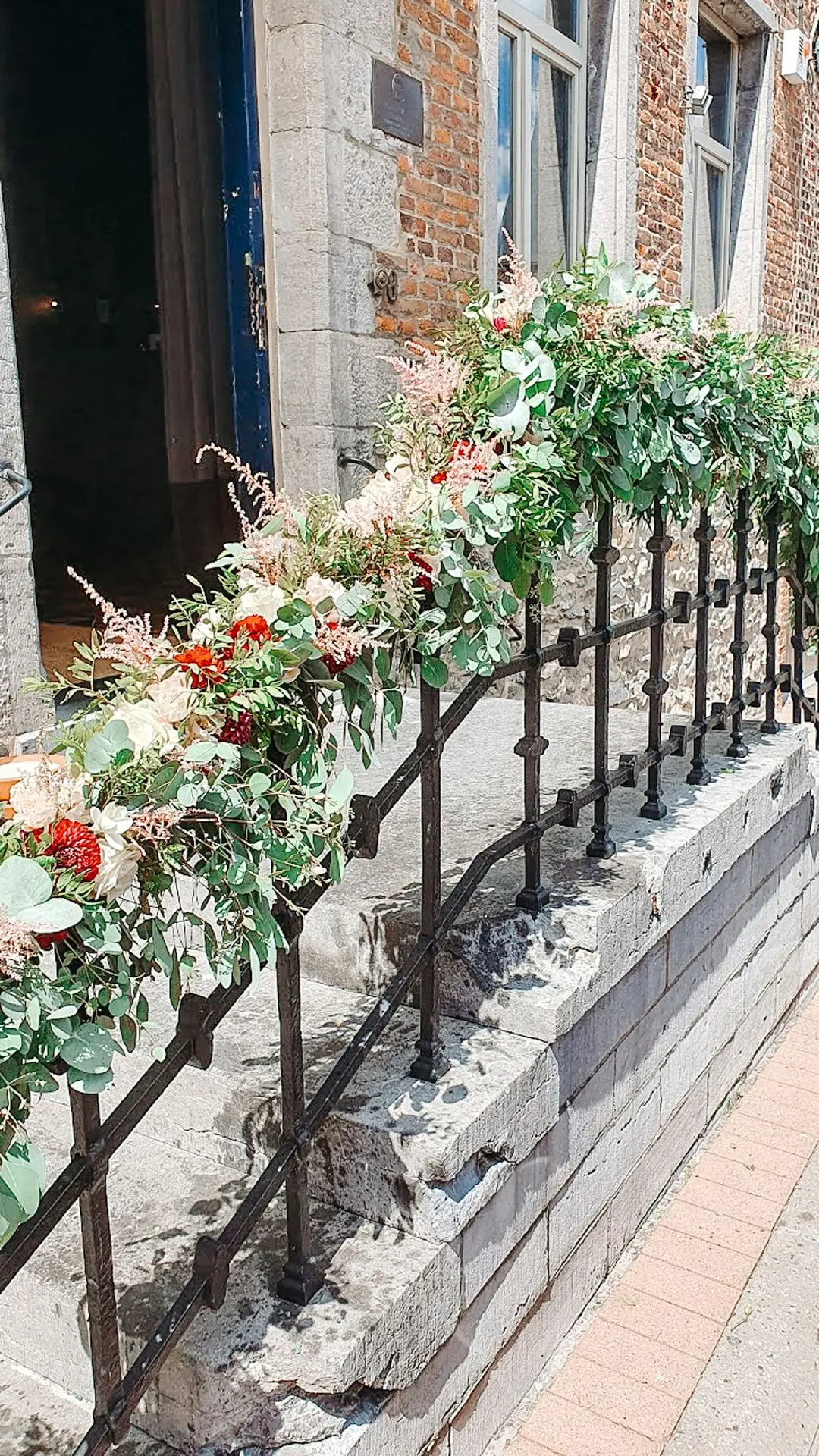 Les chandeliers fleuris, véritables pièces maîtresses, ont illuminé la salle tout en ajoutant une touche de romantisme. Les touches de rouge, subtilement intégrées dans la décoration, ont souligné l’intensité et l’émotion de cette journée exceptionnelle.