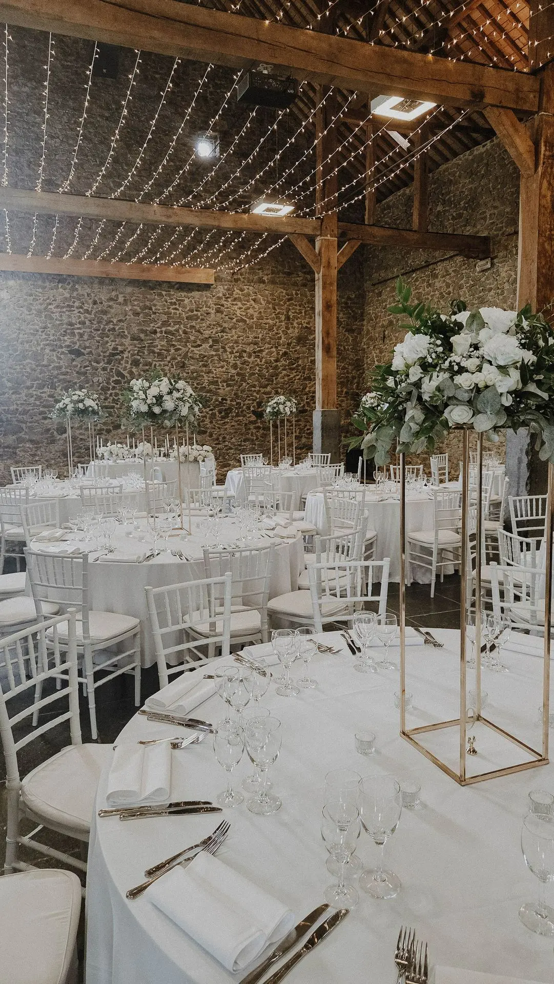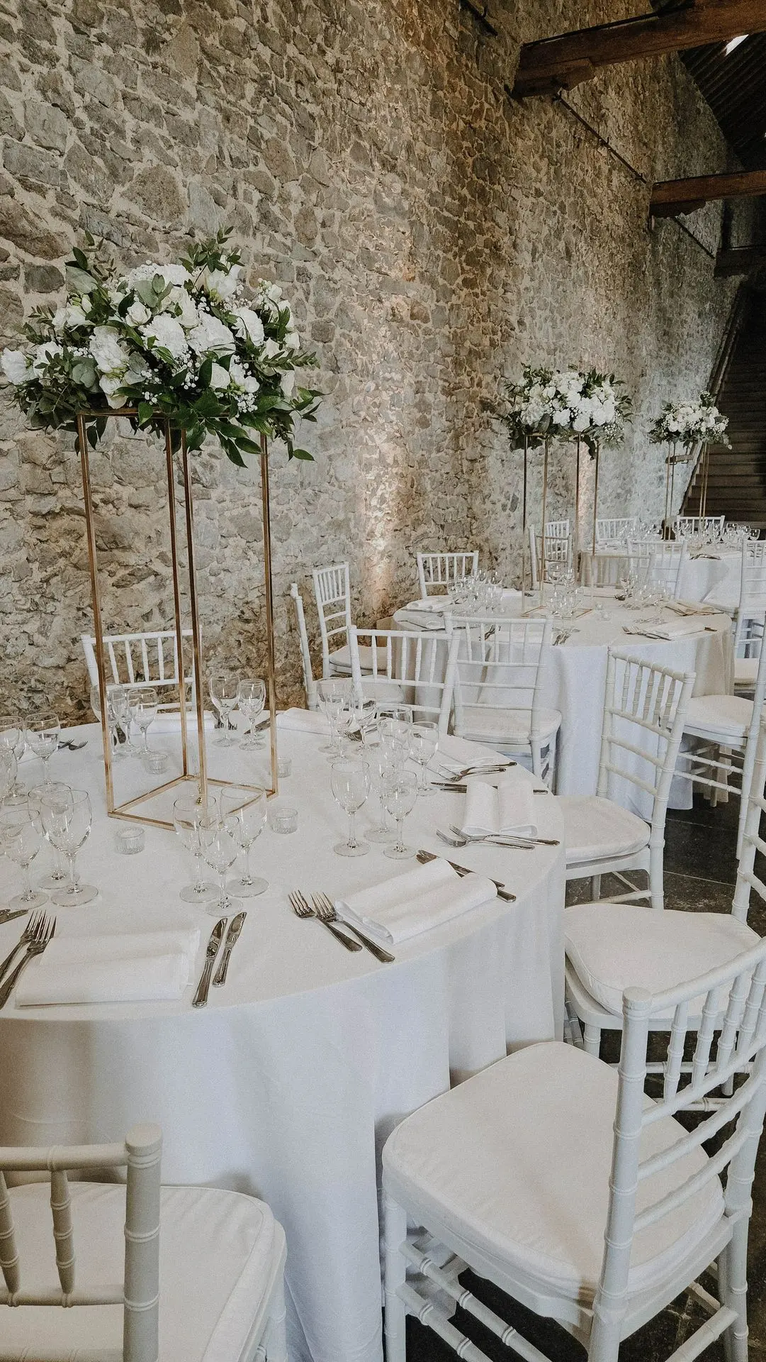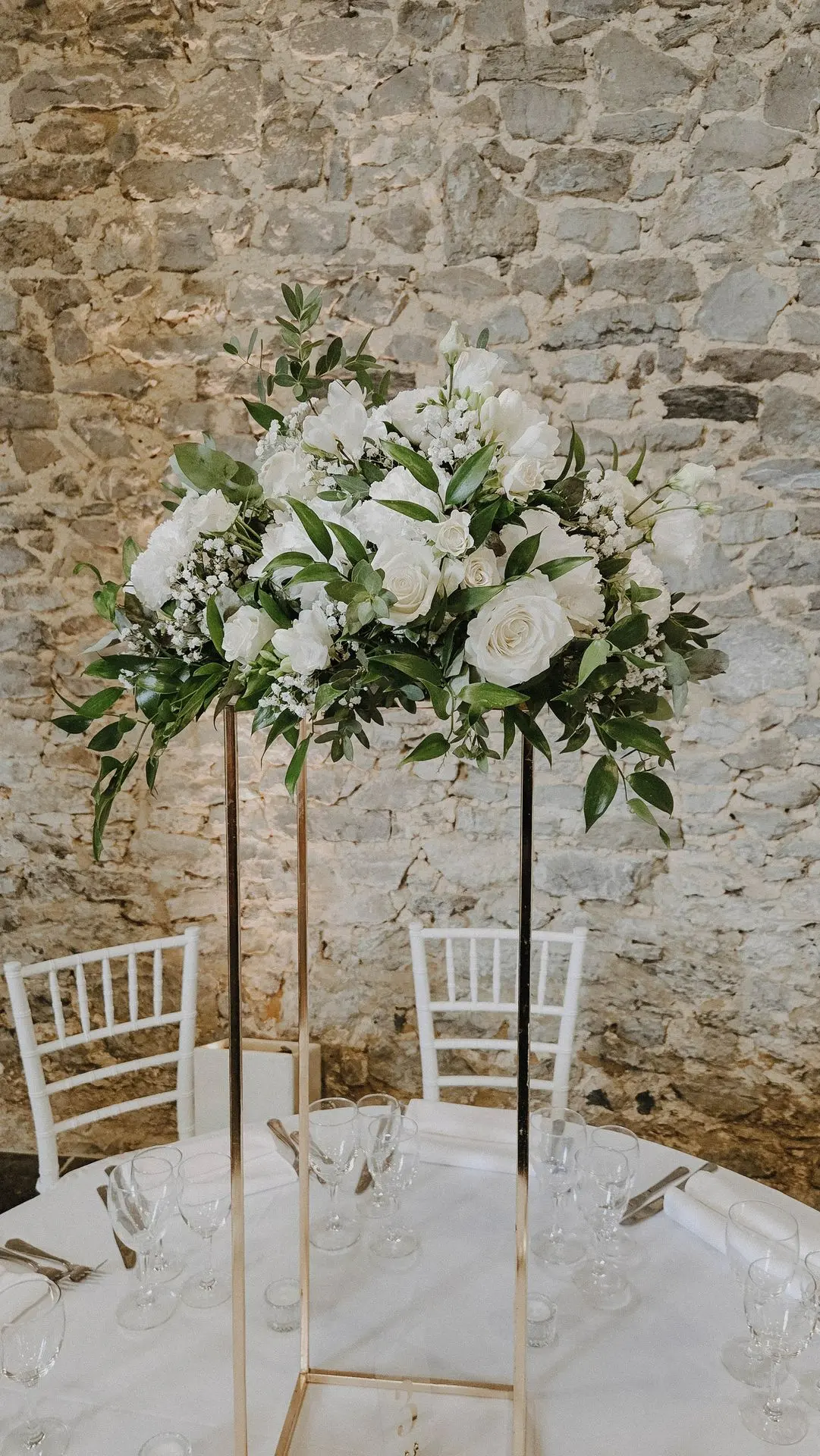 Les tables des invités étaient sublimées par une stèle fleurie de 80 cm, apportant hauteur et légèreté à la décoration florale.