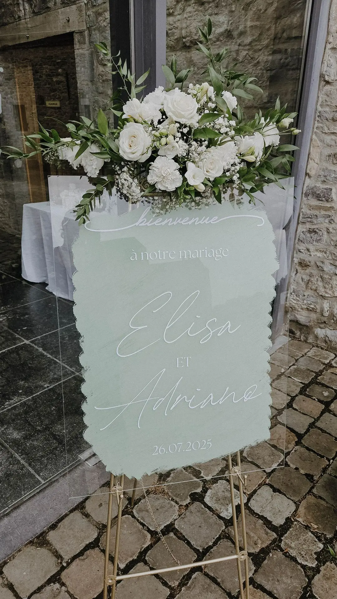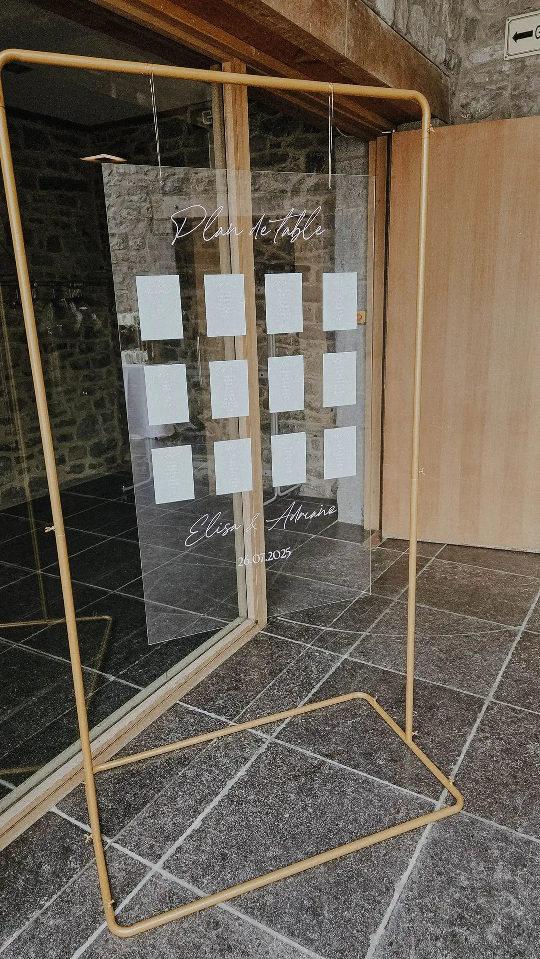 Le panneau de bienvenue ainsi que le plan de table en plexi accueillaient les invités avec modernité et transparence, annonçant l’univers raffiné de la journée.