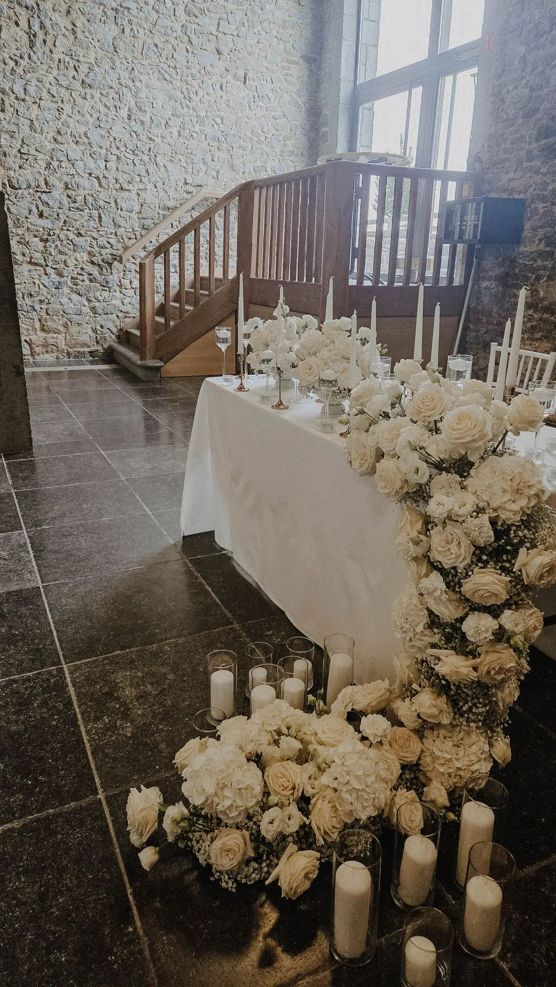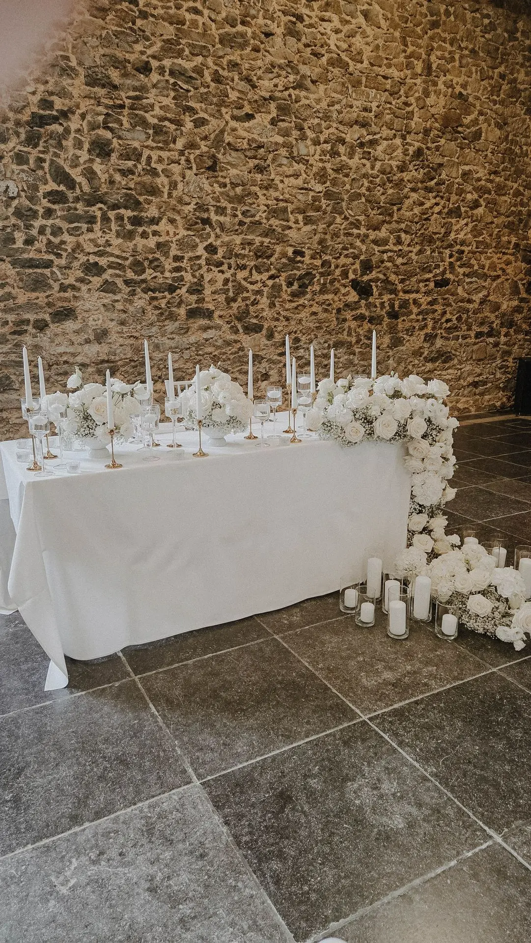 Pour la table d’honneur, un long chemin de gypsophile et de fleurs blanches créait une ligne délicate et raffinée, parfaitement en accord avec l’esprit du mariage.