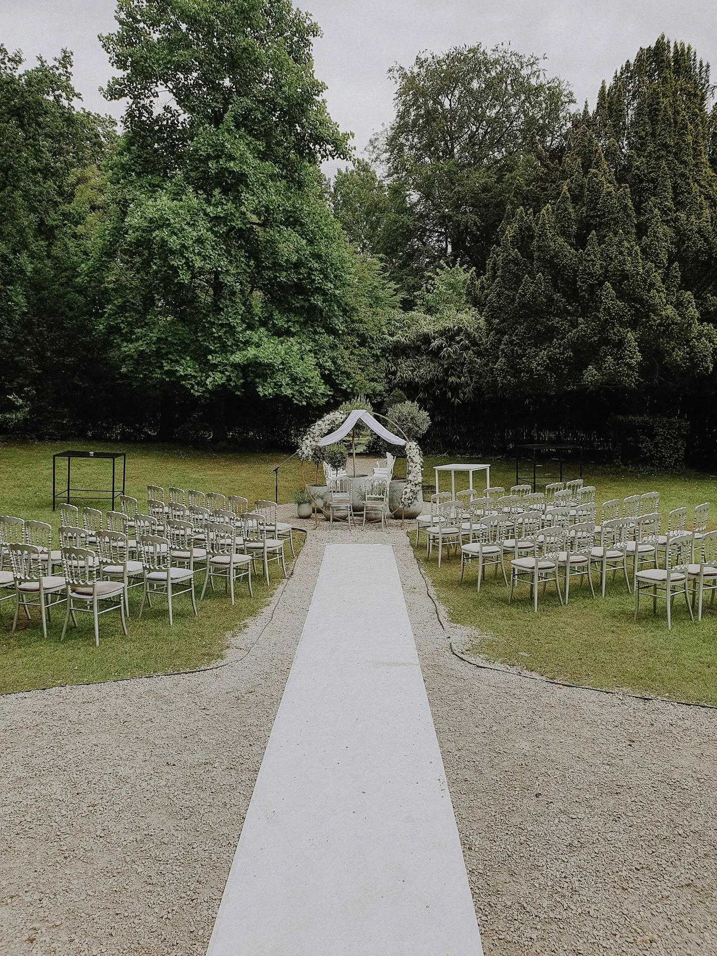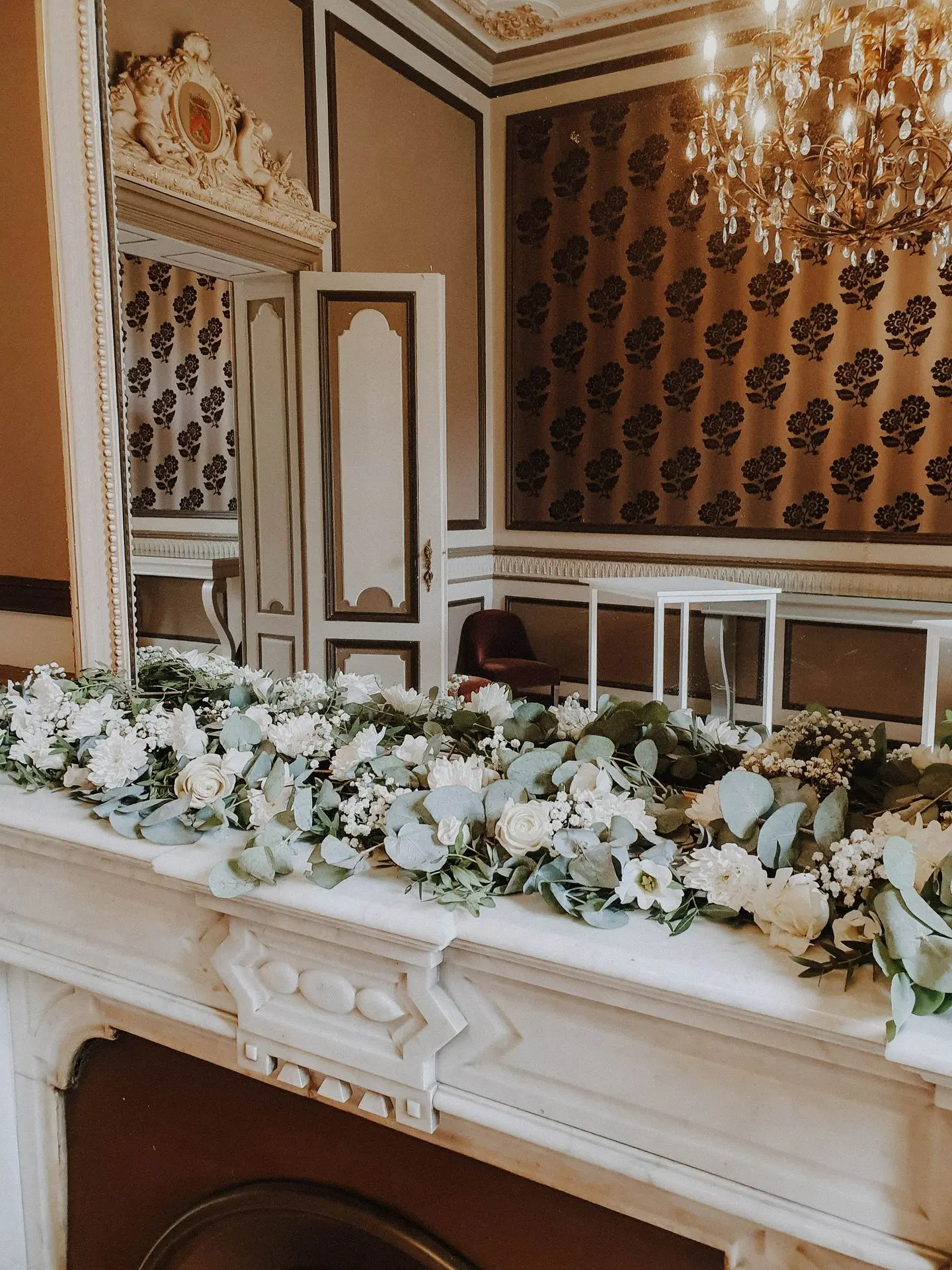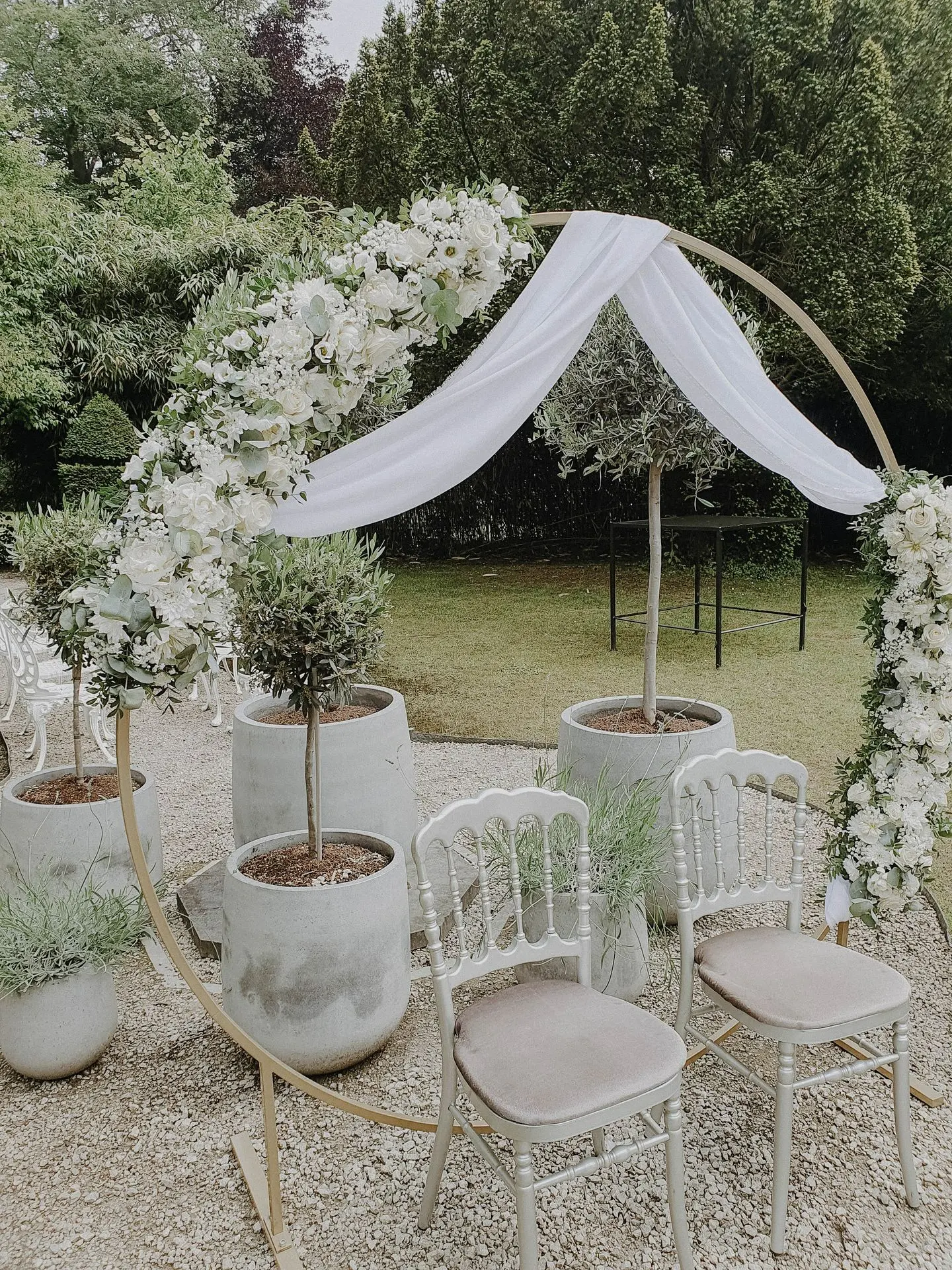 Je me suis occupée du bouquet de la mariée et de l’arche pour la cérémonie, dans des tons blanc et vert, pour une décoration élégante et naturelle, en parfaite harmonie avec le cadre du château.