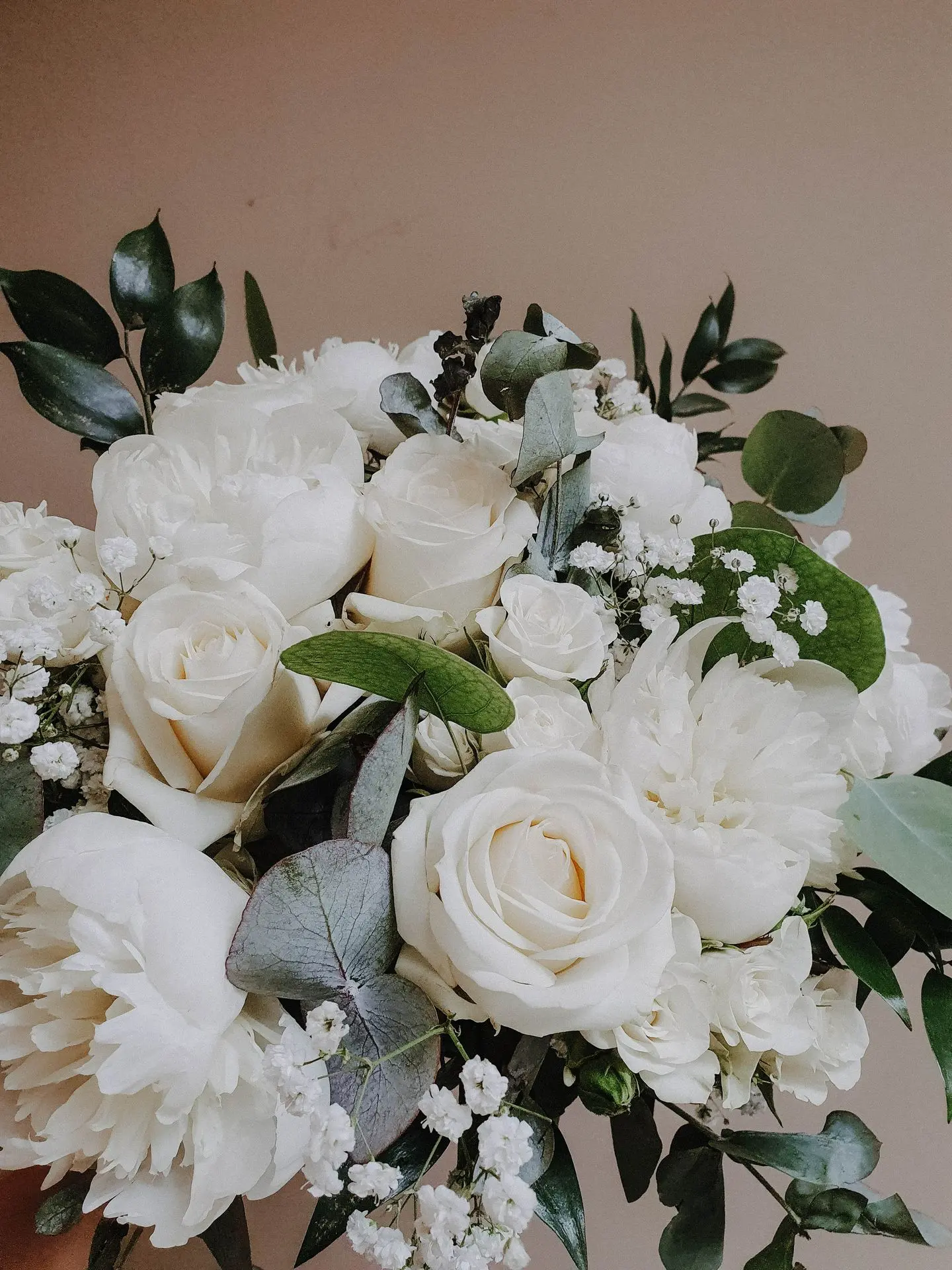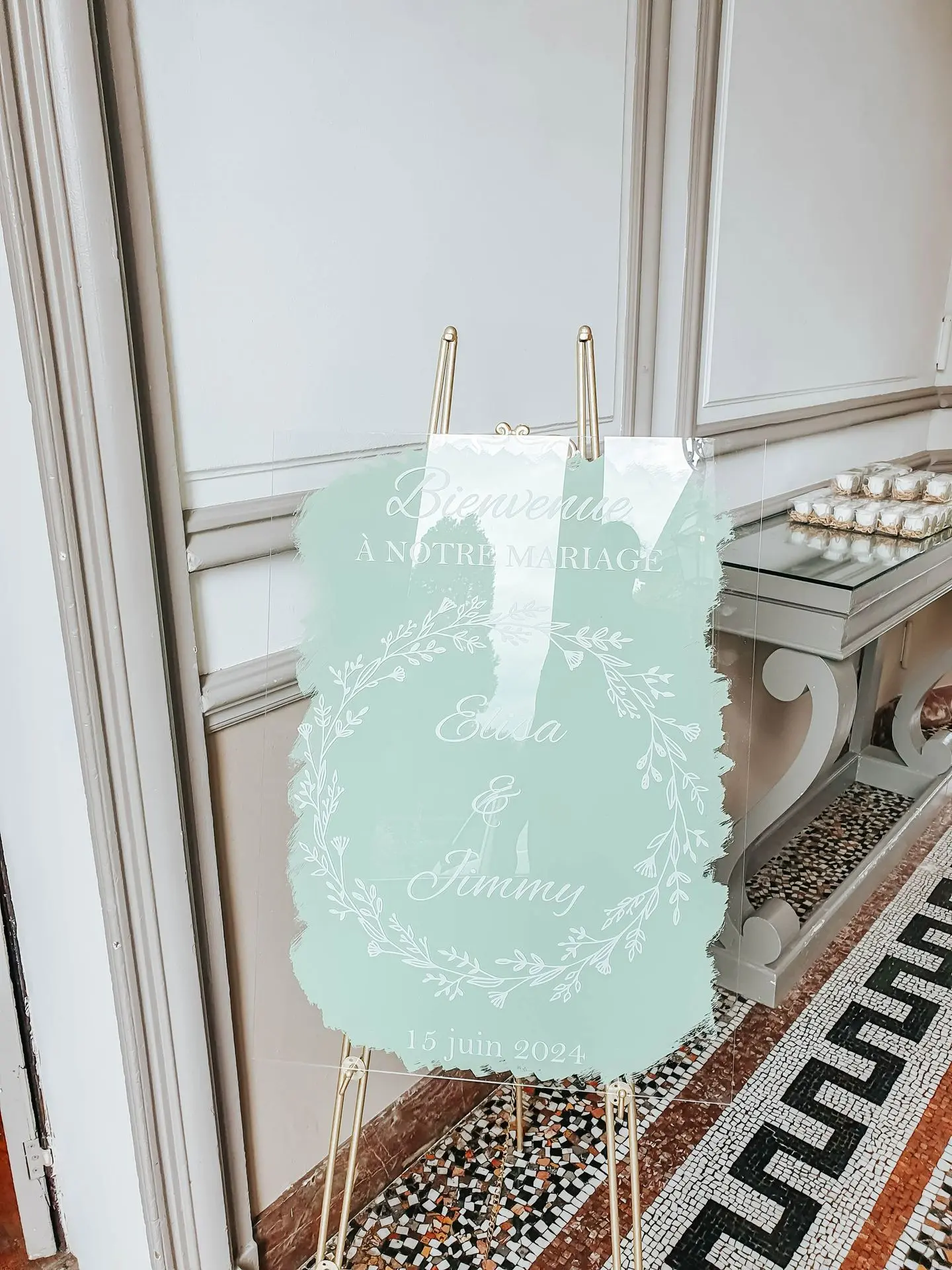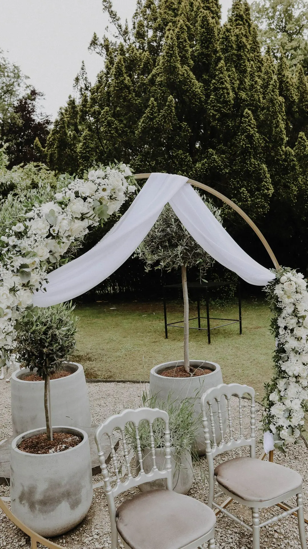 Je me suis occupée du bouquet de la mariée et de l’arche pour la cérémonie, dans des tons blanc et vert, pour une décoration élégante et naturelle, en parfaite harmonie avec le cadre du château.