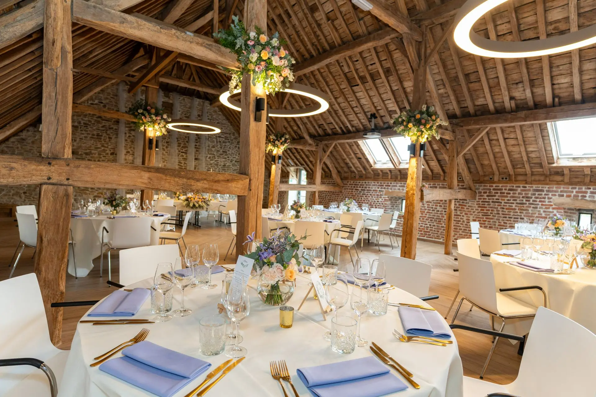 Les tables des invités étaient décorées de bouquets au centre, accompagnés de photophores dorés apportant chaleur et lumière, tandis que la table d’honneur était mise en valeur par un montage floral avec chute florale, chandeliers et photophores dorés, pour une scénographie harmonieuse et inoubliable.