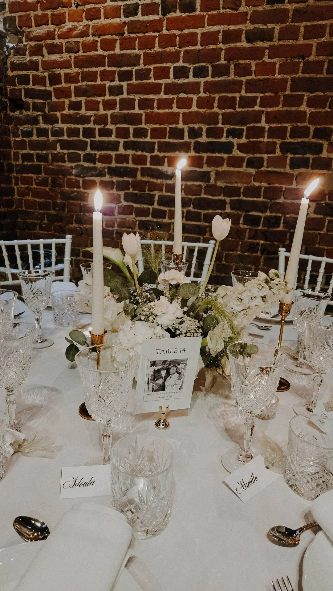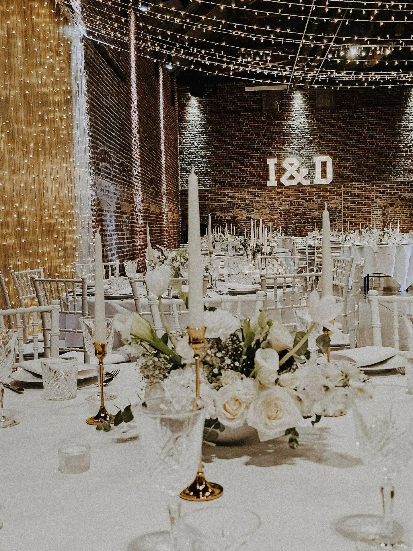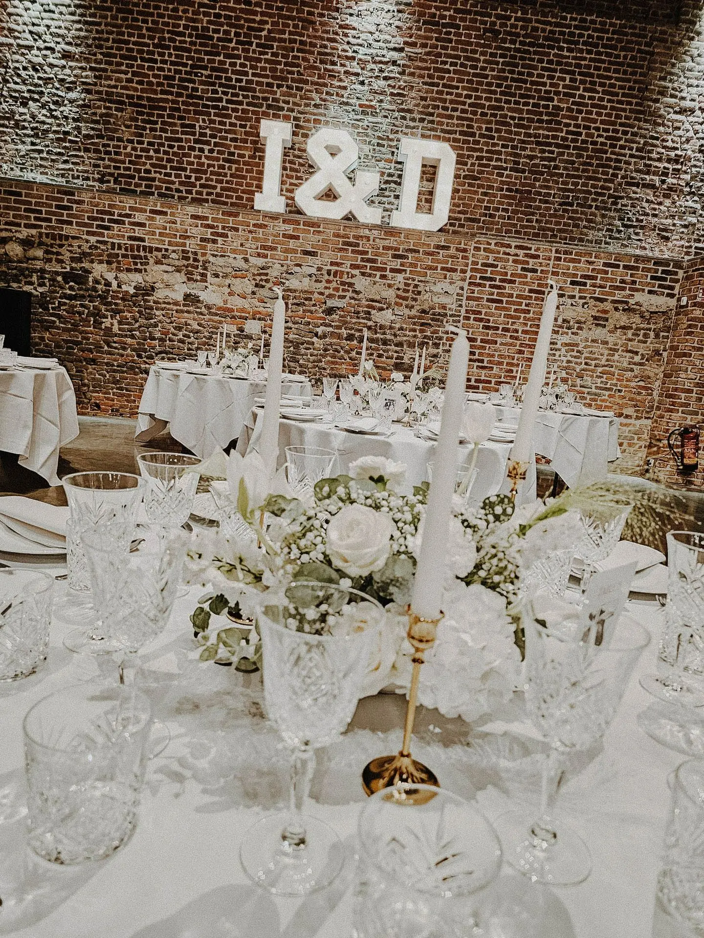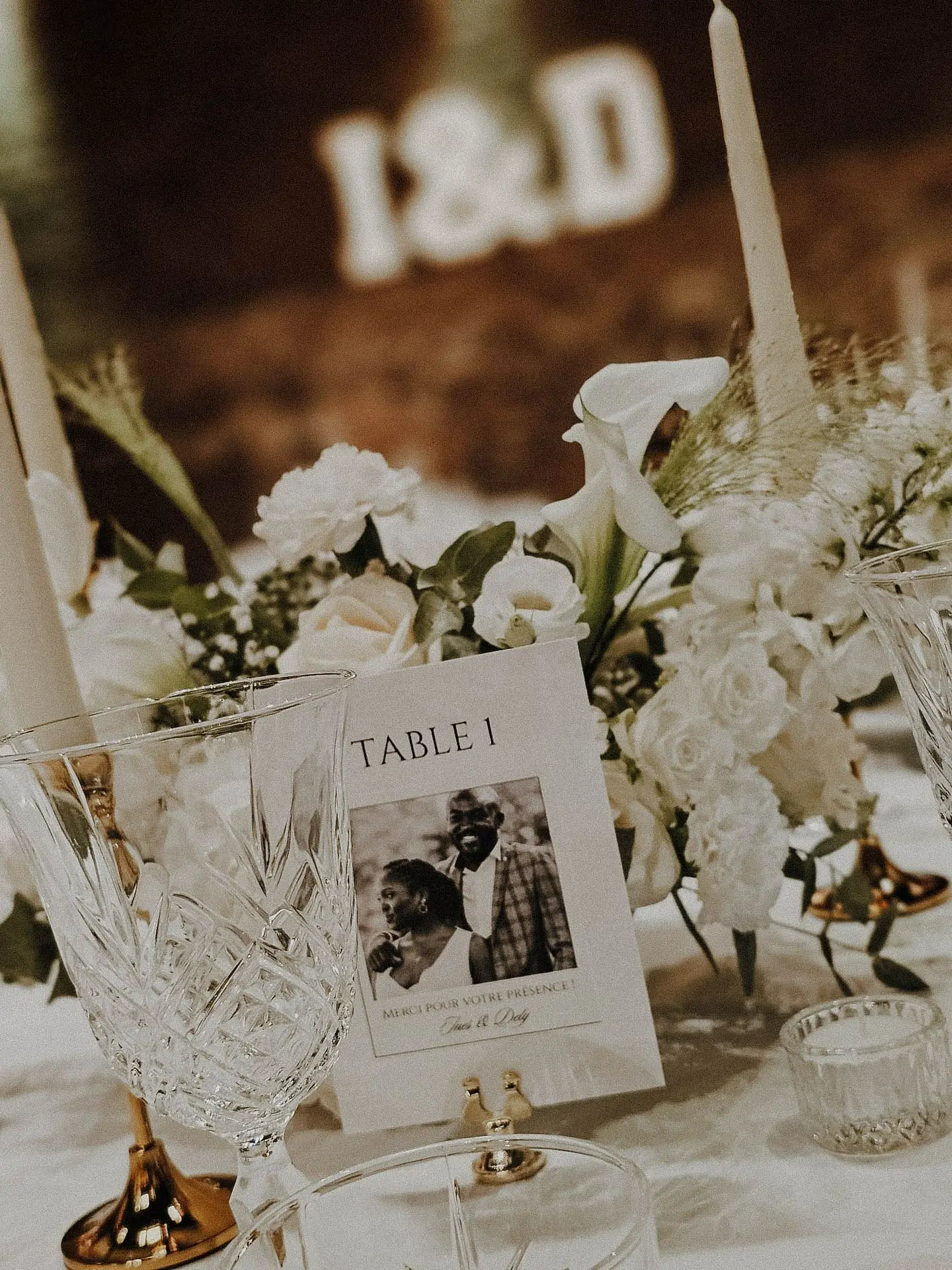 Les tables des invités étaient décorées de coupes fleuries et de bougies disposées sur des photophores dorés, apportant chaleur et élégance à l’ensemble.