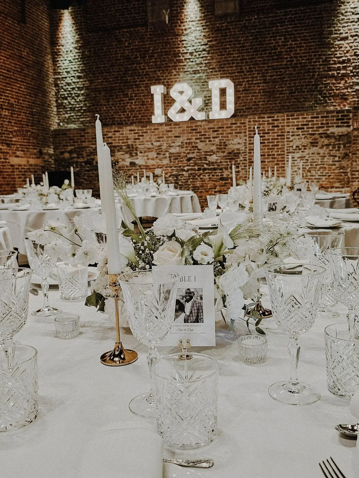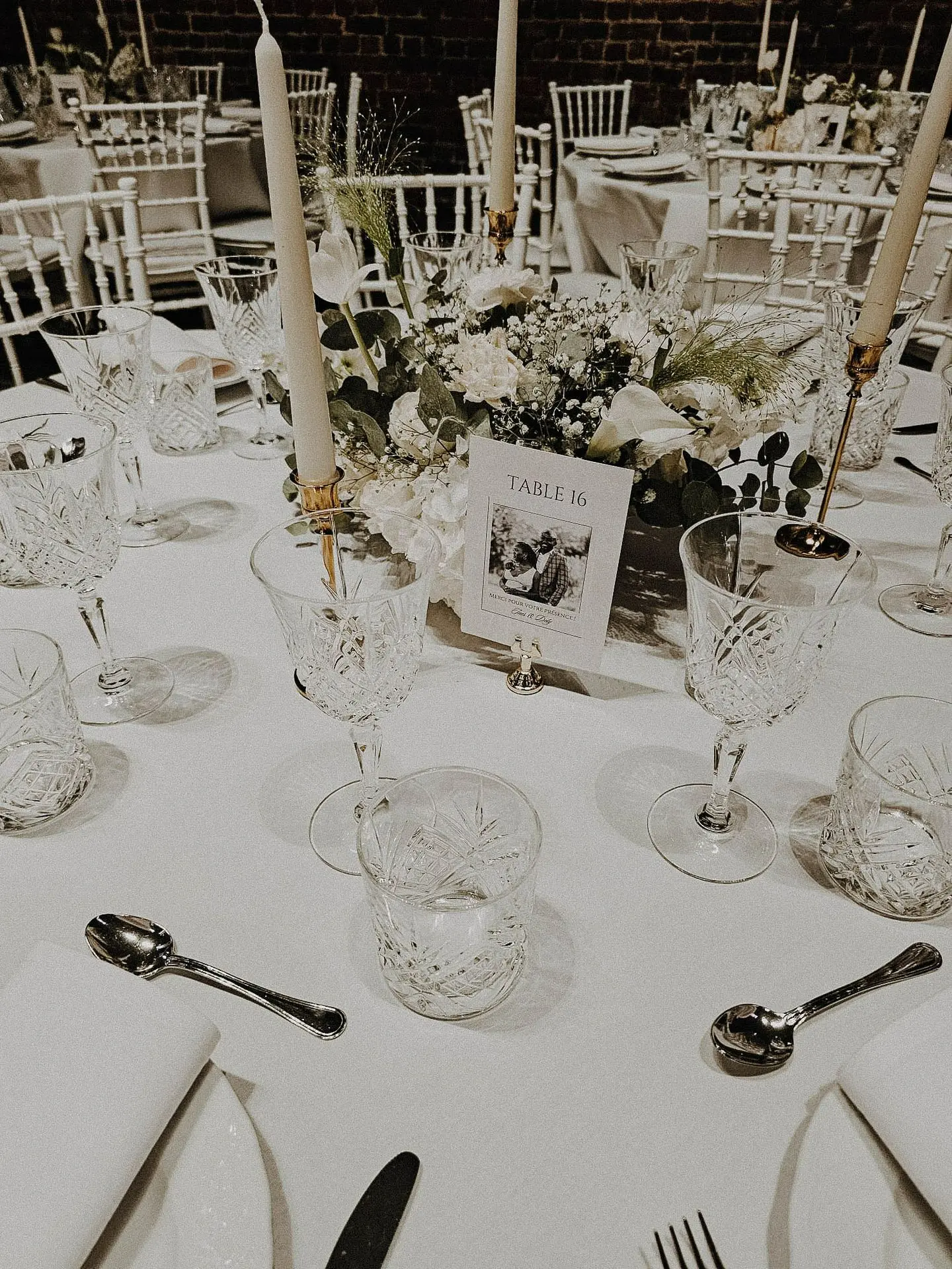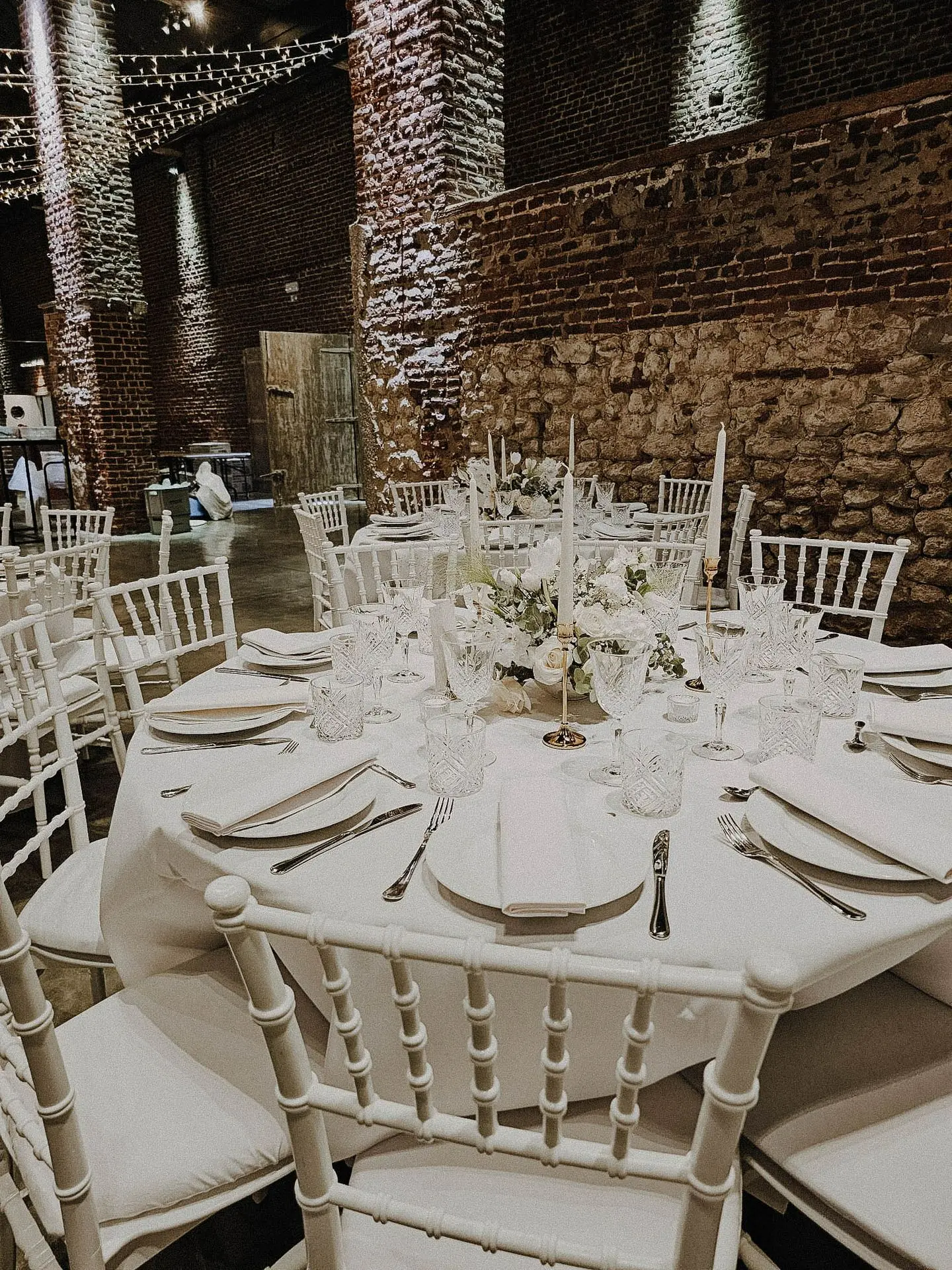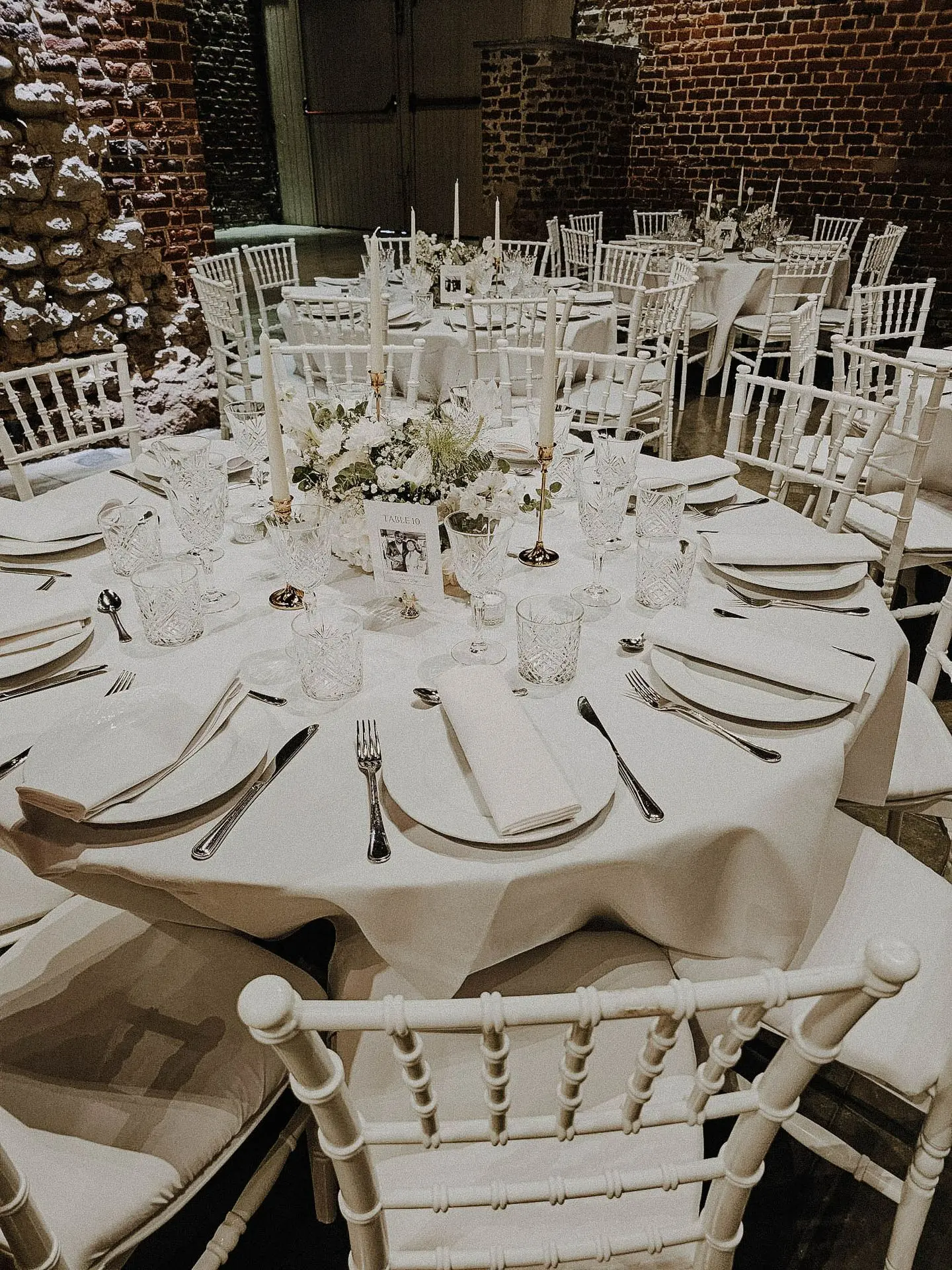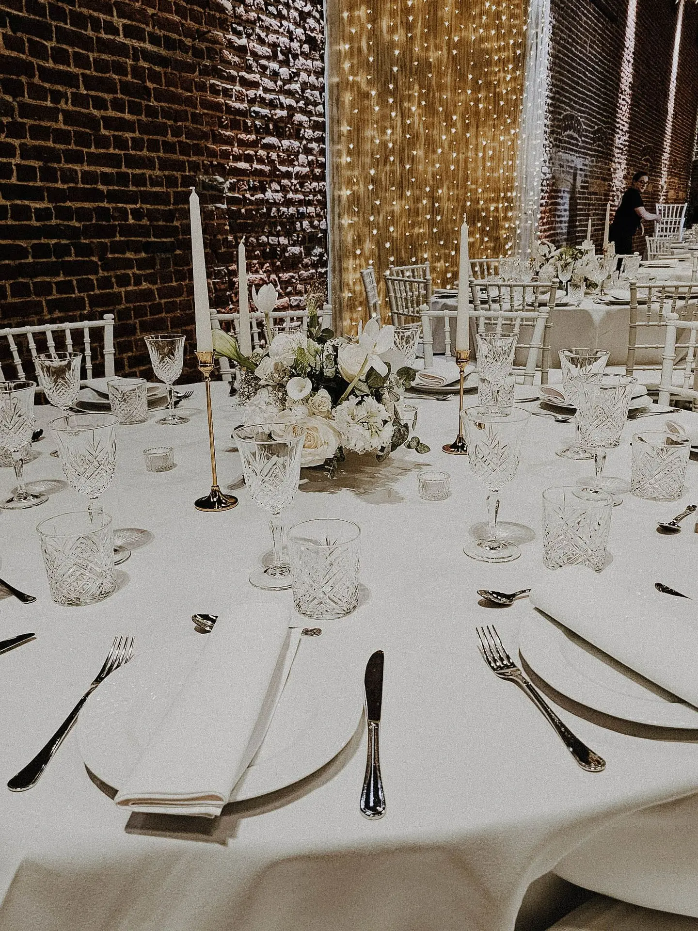 Les tables des invités étaient décorées de coupes fleuries et de bougies disposées sur des photophores dorés, apportant chaleur et élégance à l’ensemble.