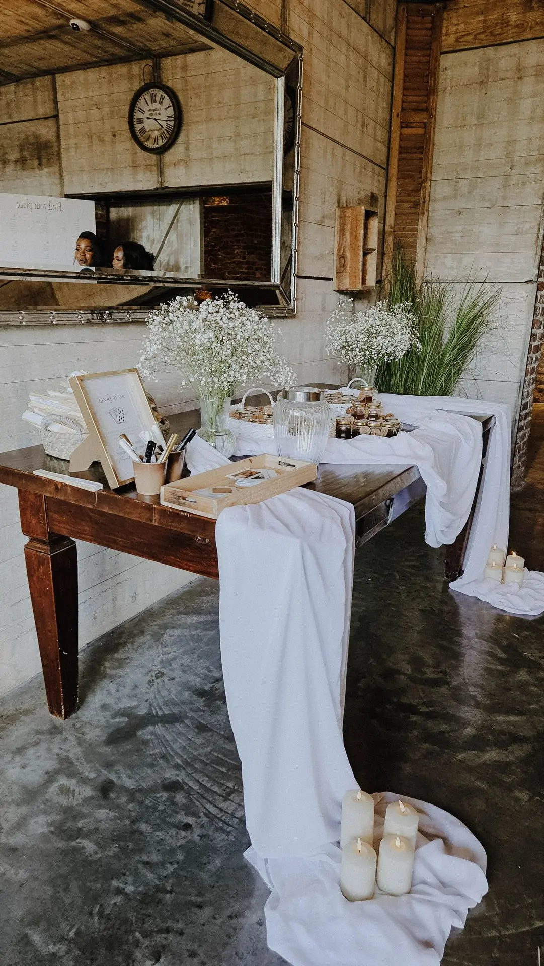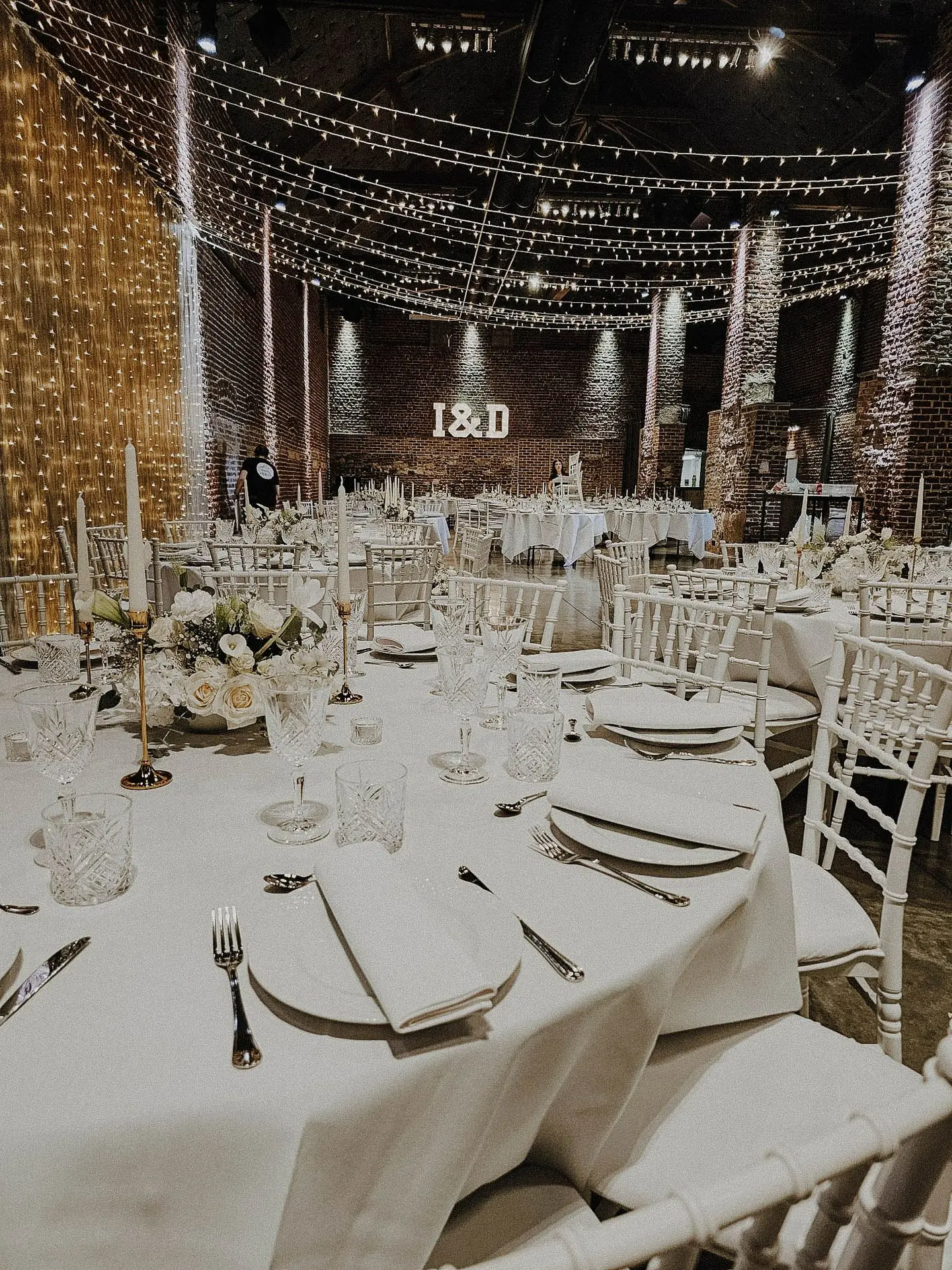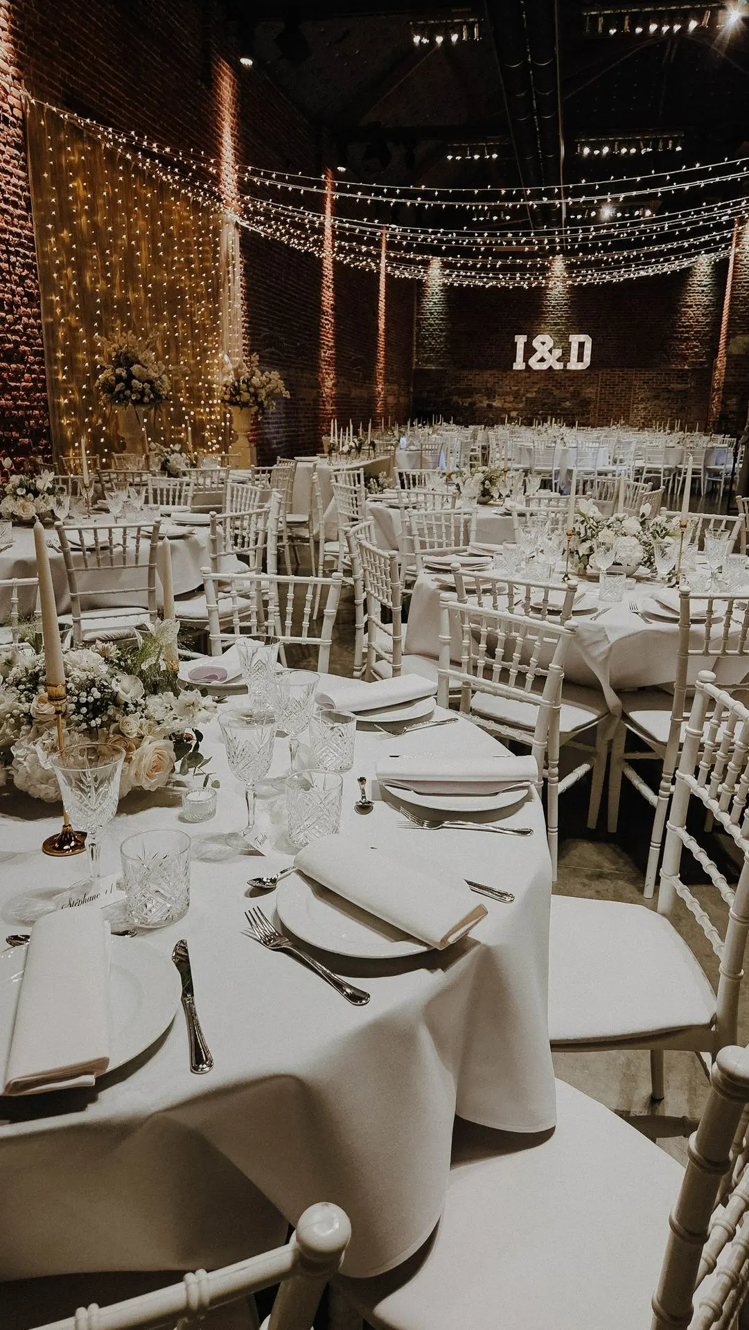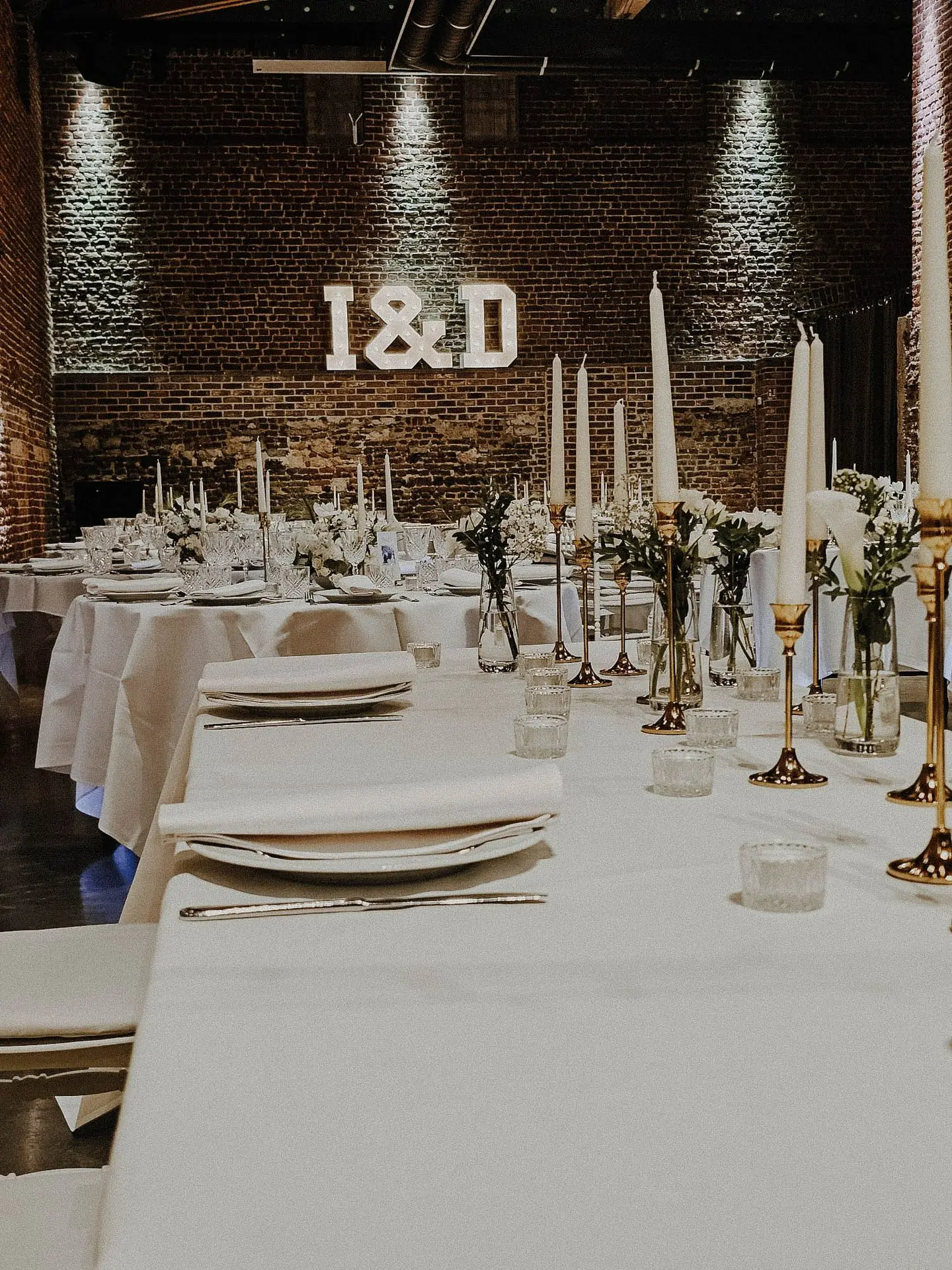 Les tables des invités étaient décorées de coupes fleuries et de bougies disposées sur des photophores dorés, apportant chaleur et élégance à l’ensemble.