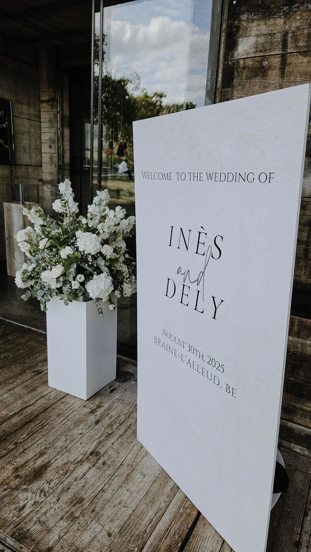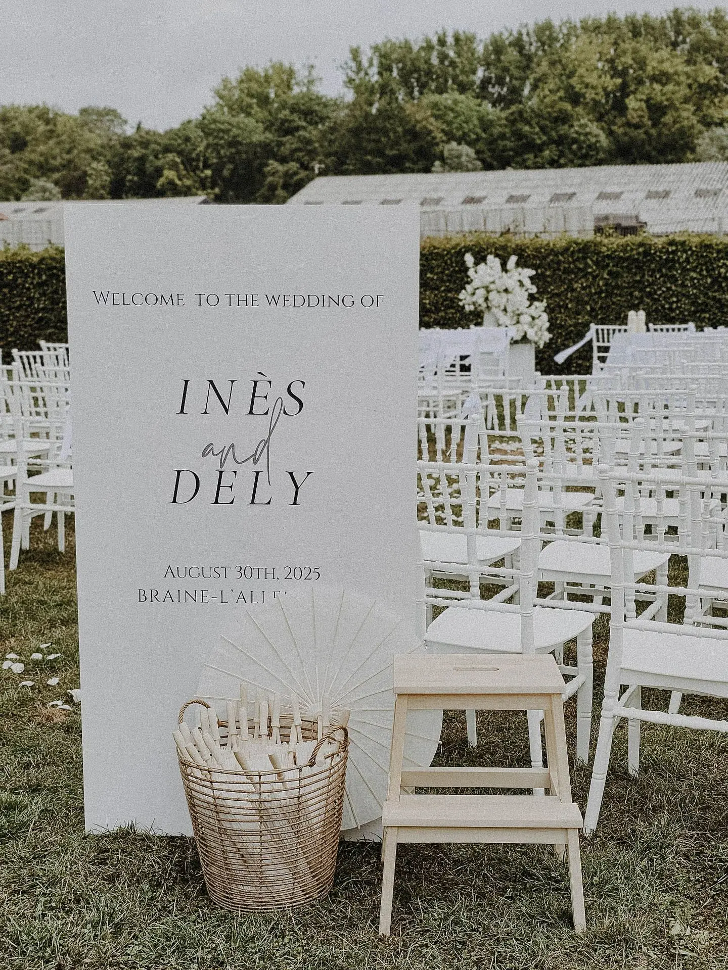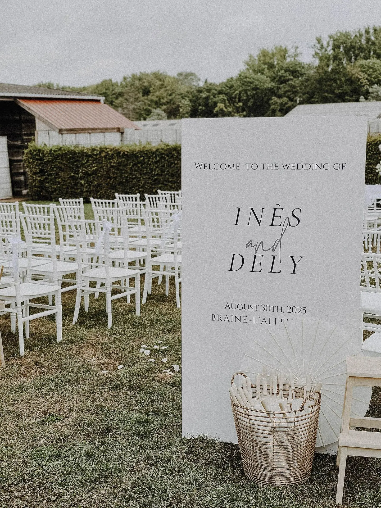 Un grand panneau accueillait les invités, regroupant le panneau de bienvenue et le plan de table, pour une entrée élégante et structurée.