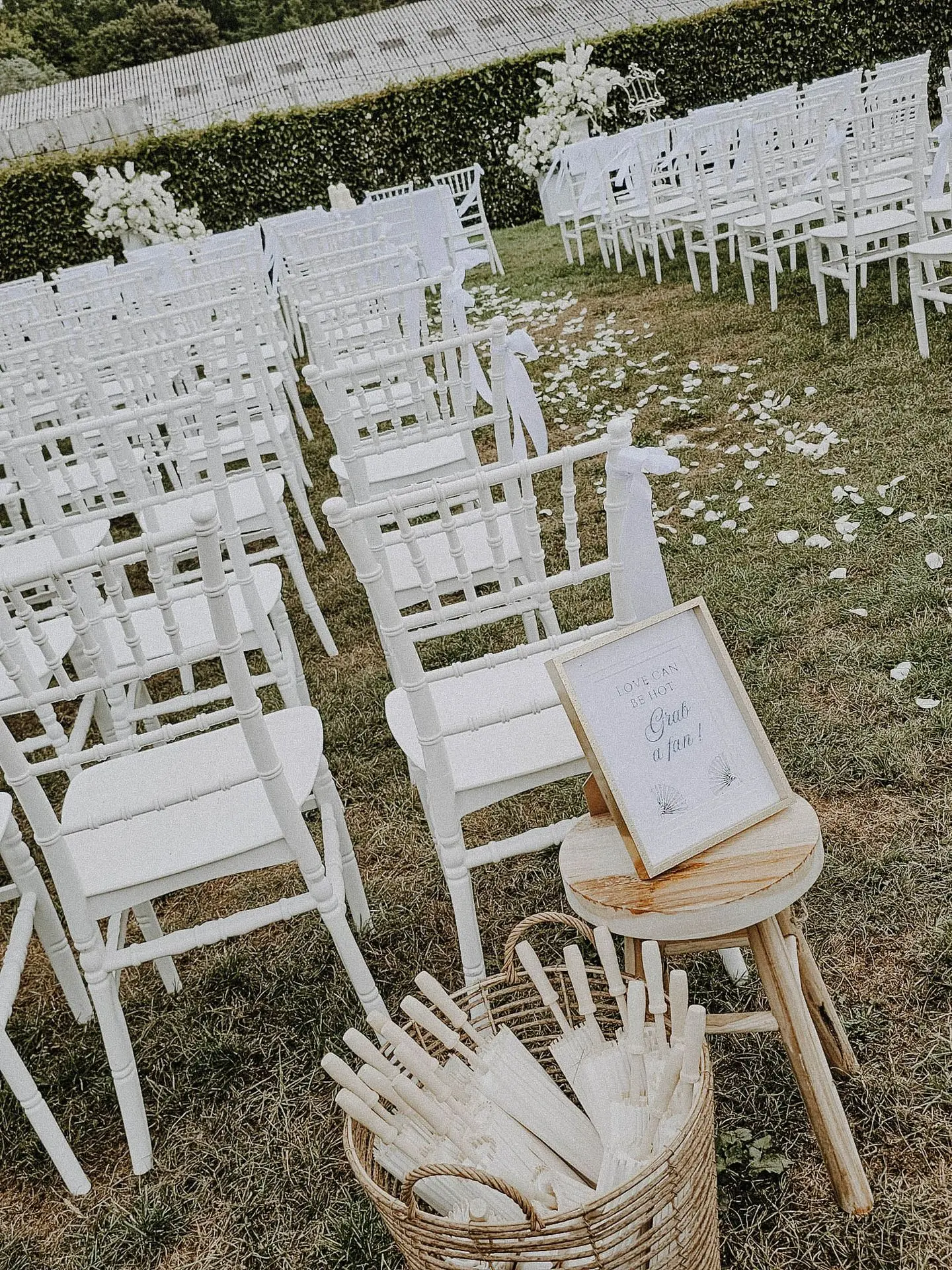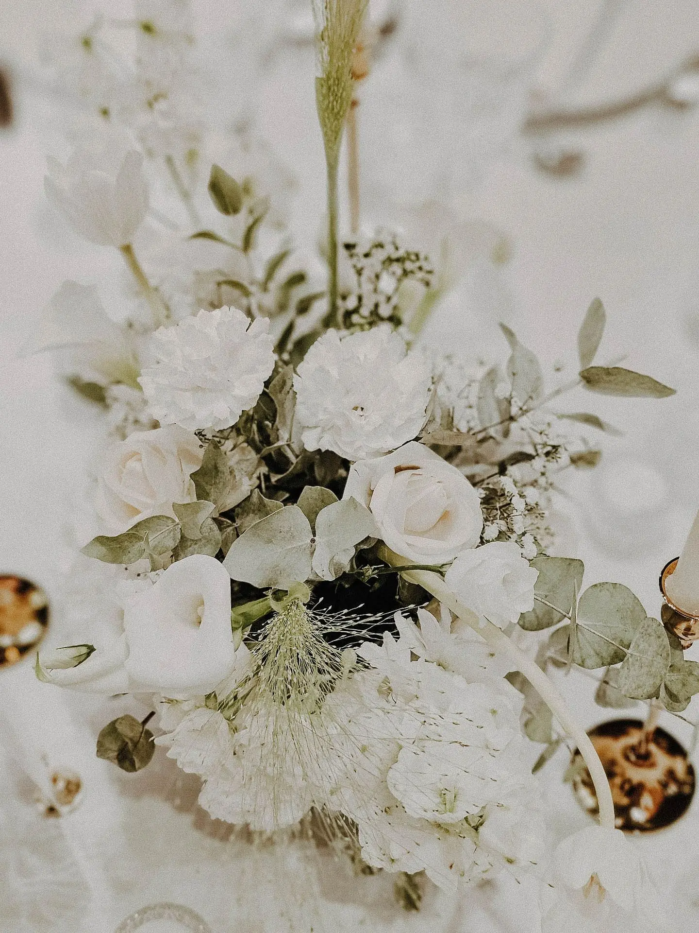 Un mariage élégant décliné en blanc, rehaussé d’une touche dorée pour un rendu raffiné et lumineux, imaginé par Mariage Sur Mesure, décoratrice de mariage et fleuriste de mariage.