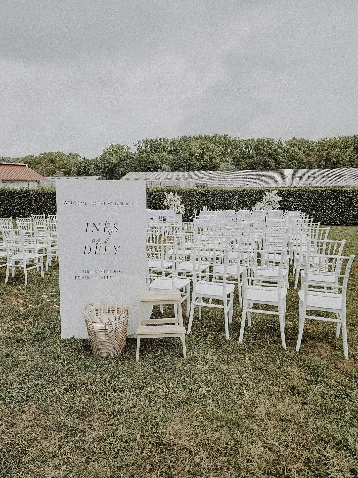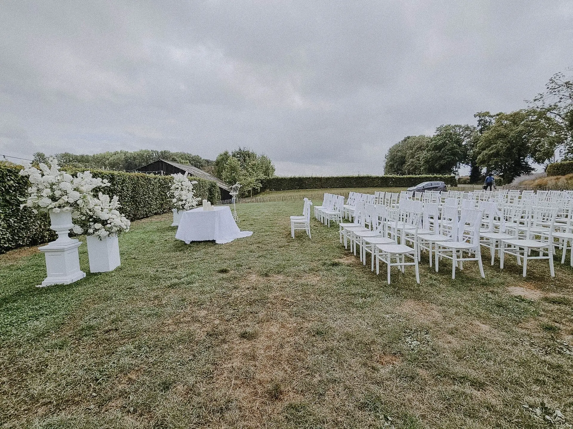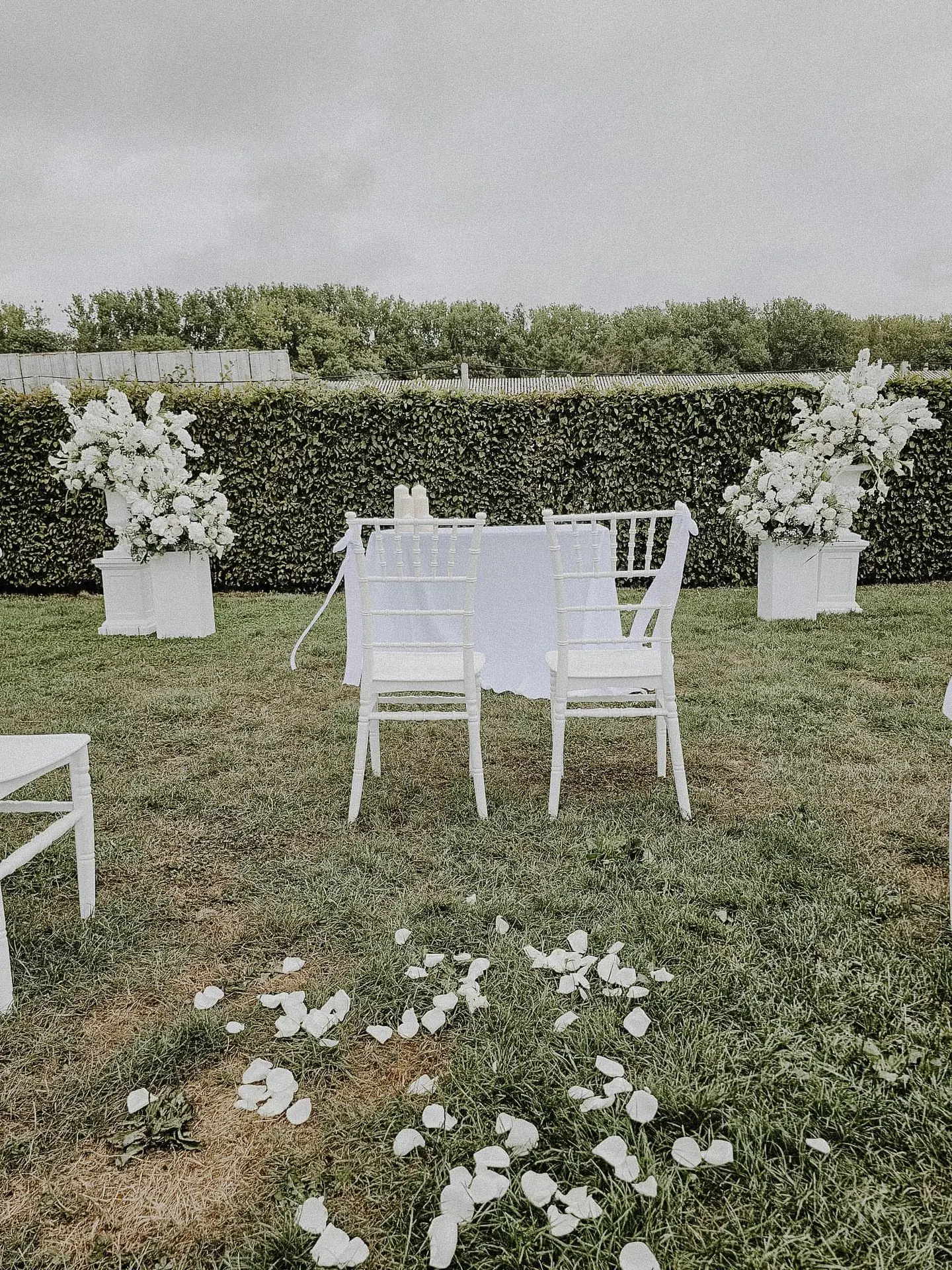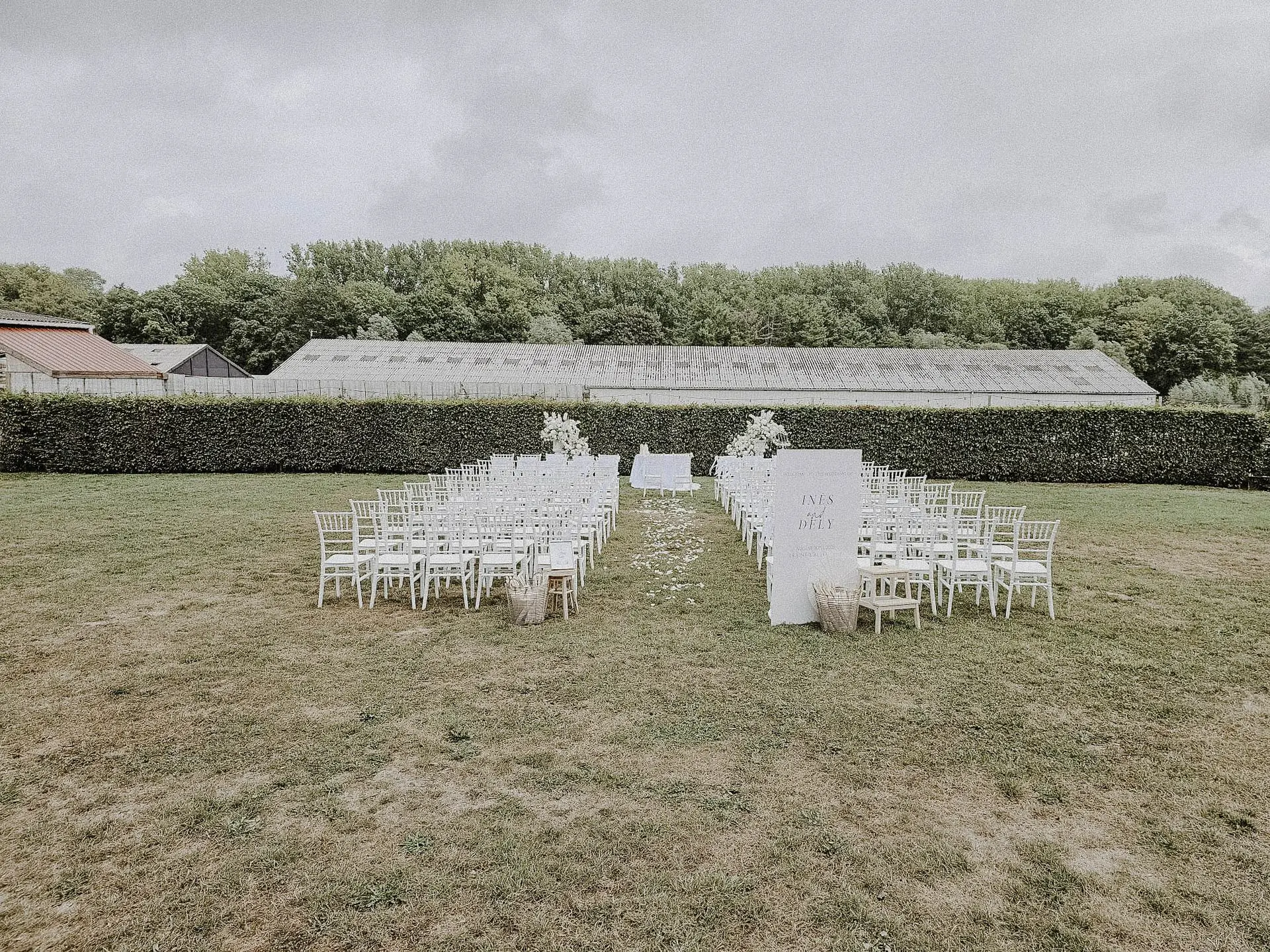 La cérémonie en plein air était sublimée par des stèles fleuries, créant un cadre naturel et poétique.