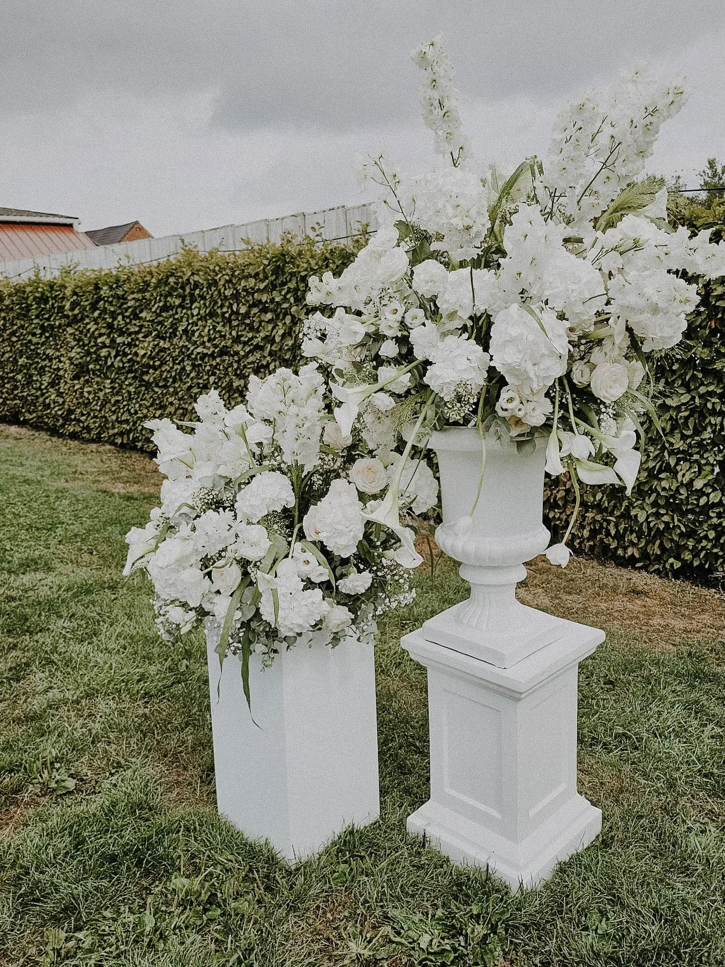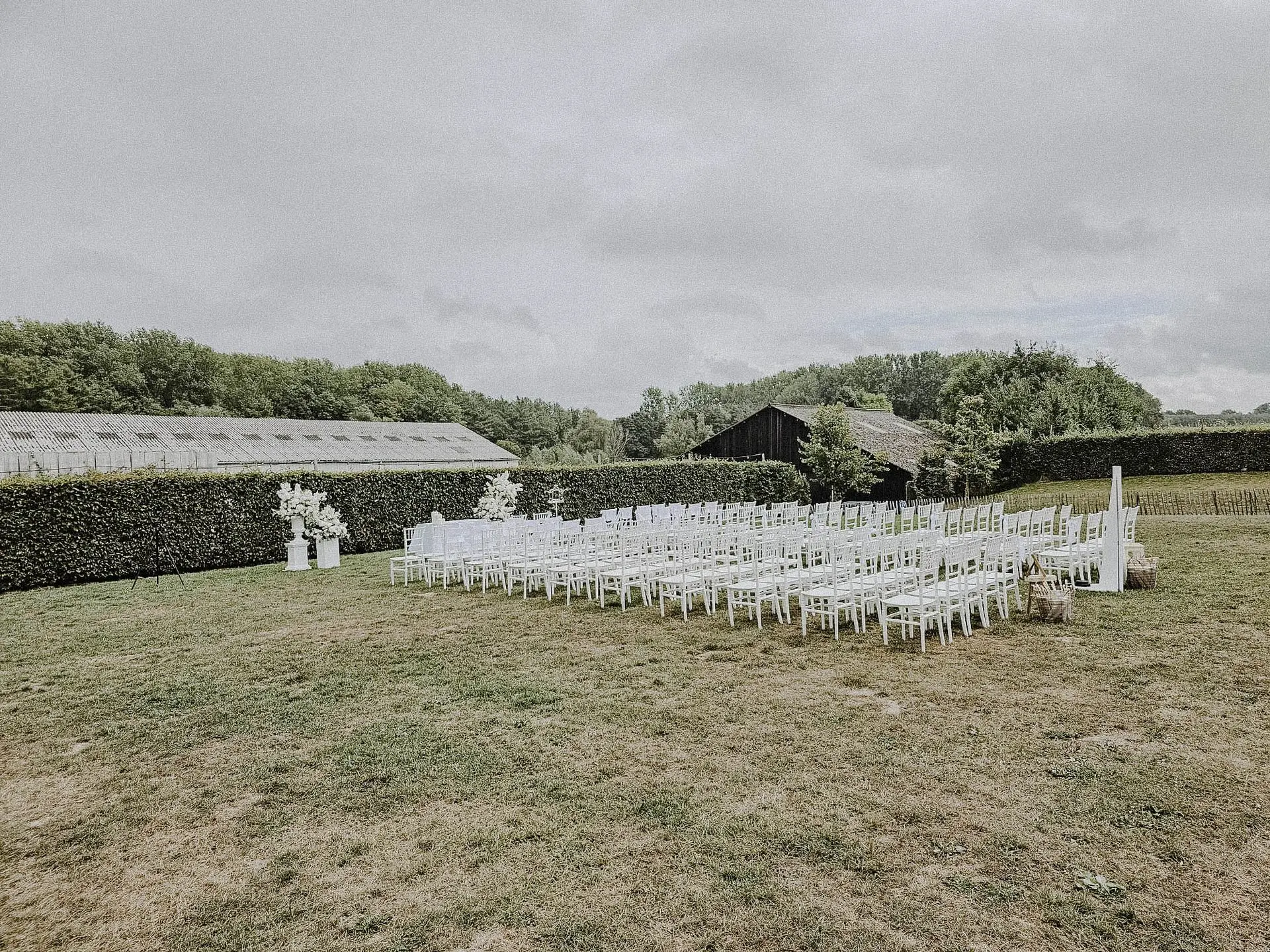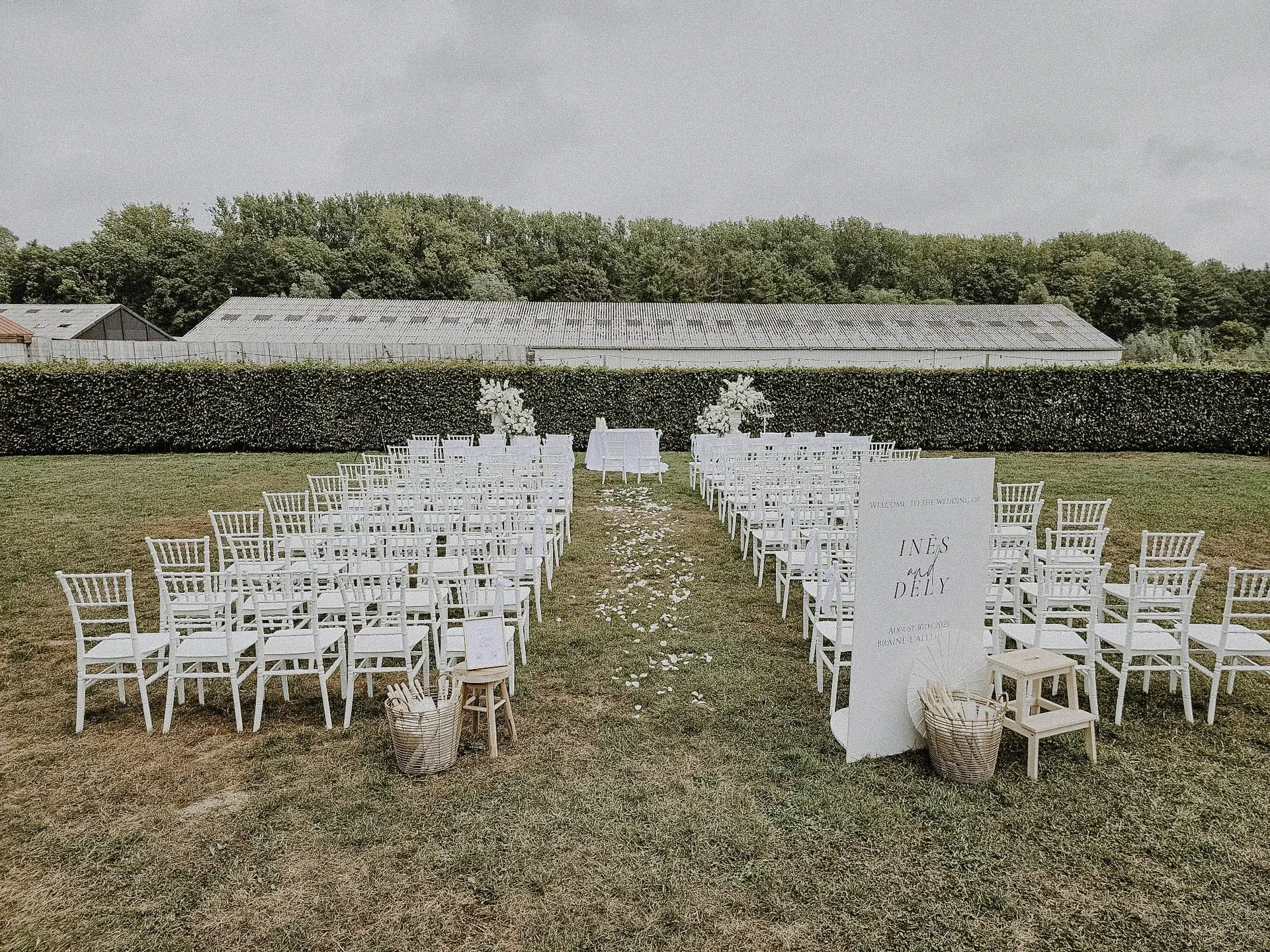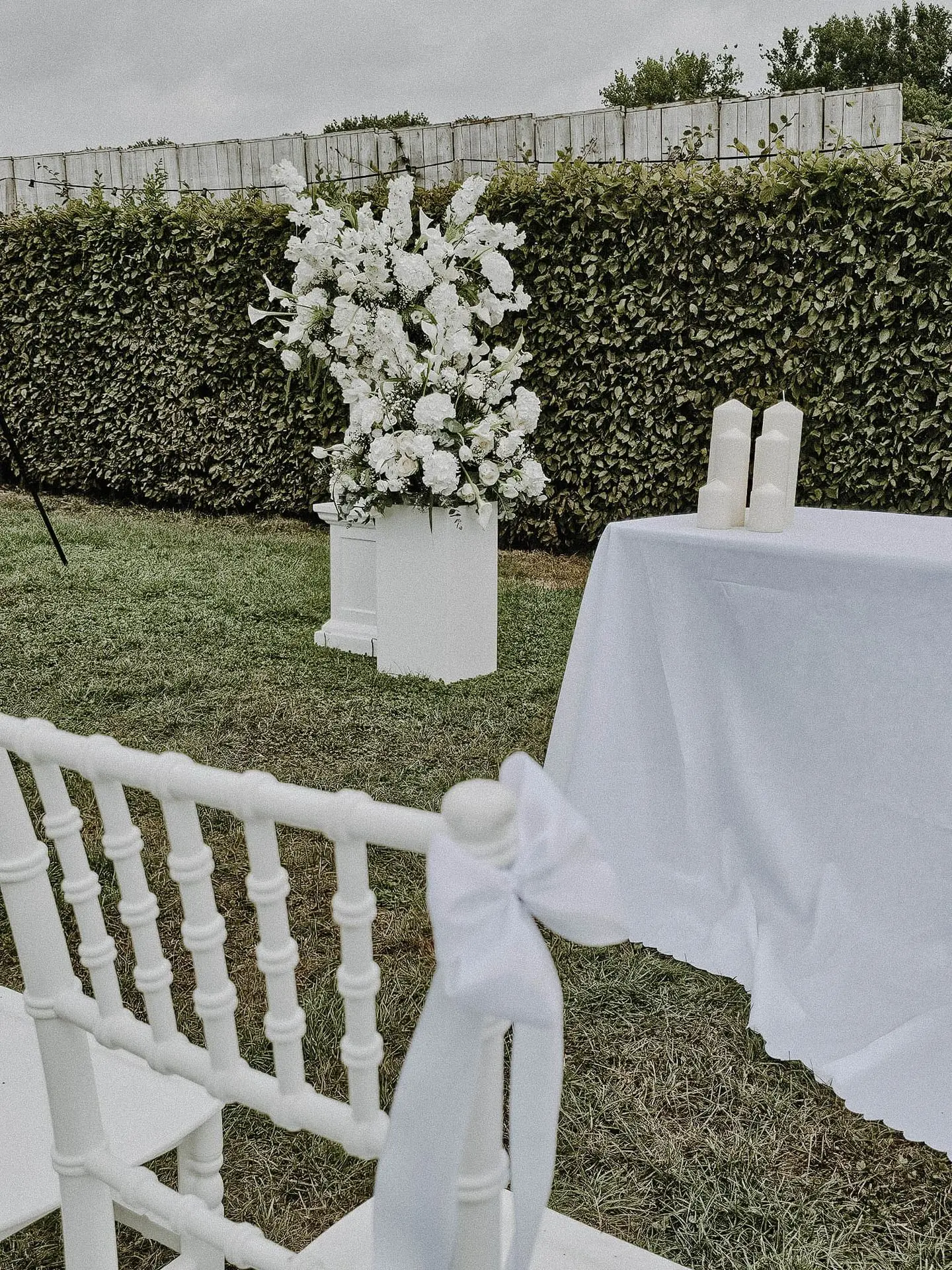 La cérémonie en plein air était sublimée par des stèles fleuries, créant un cadre naturel et poétique.
