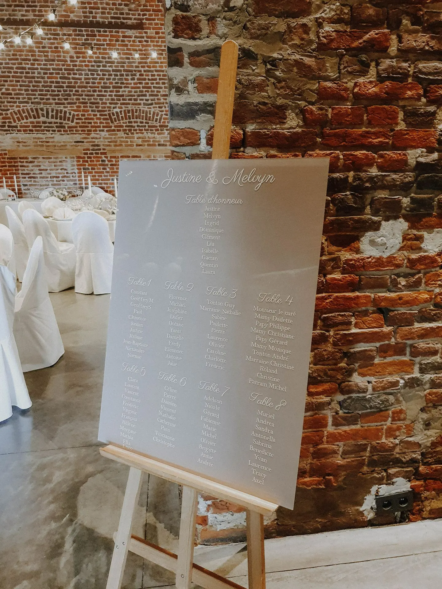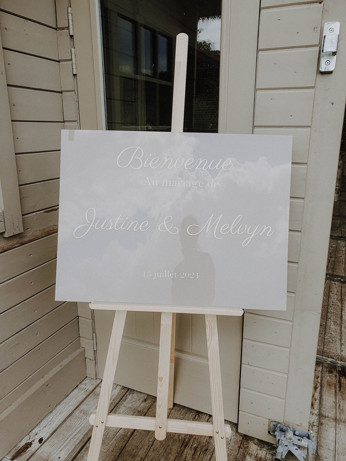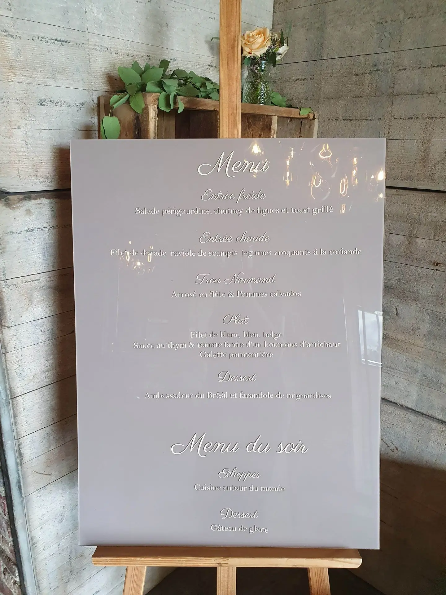 L’accueil des invités était soigné avec un panneau de bienvenue, ainsi que le menu et le plan de table en plexi taupe, apportant une touche moderne et raffinée.