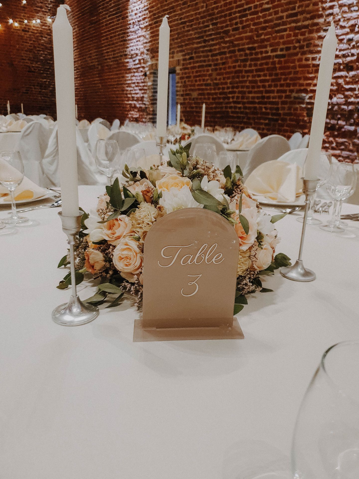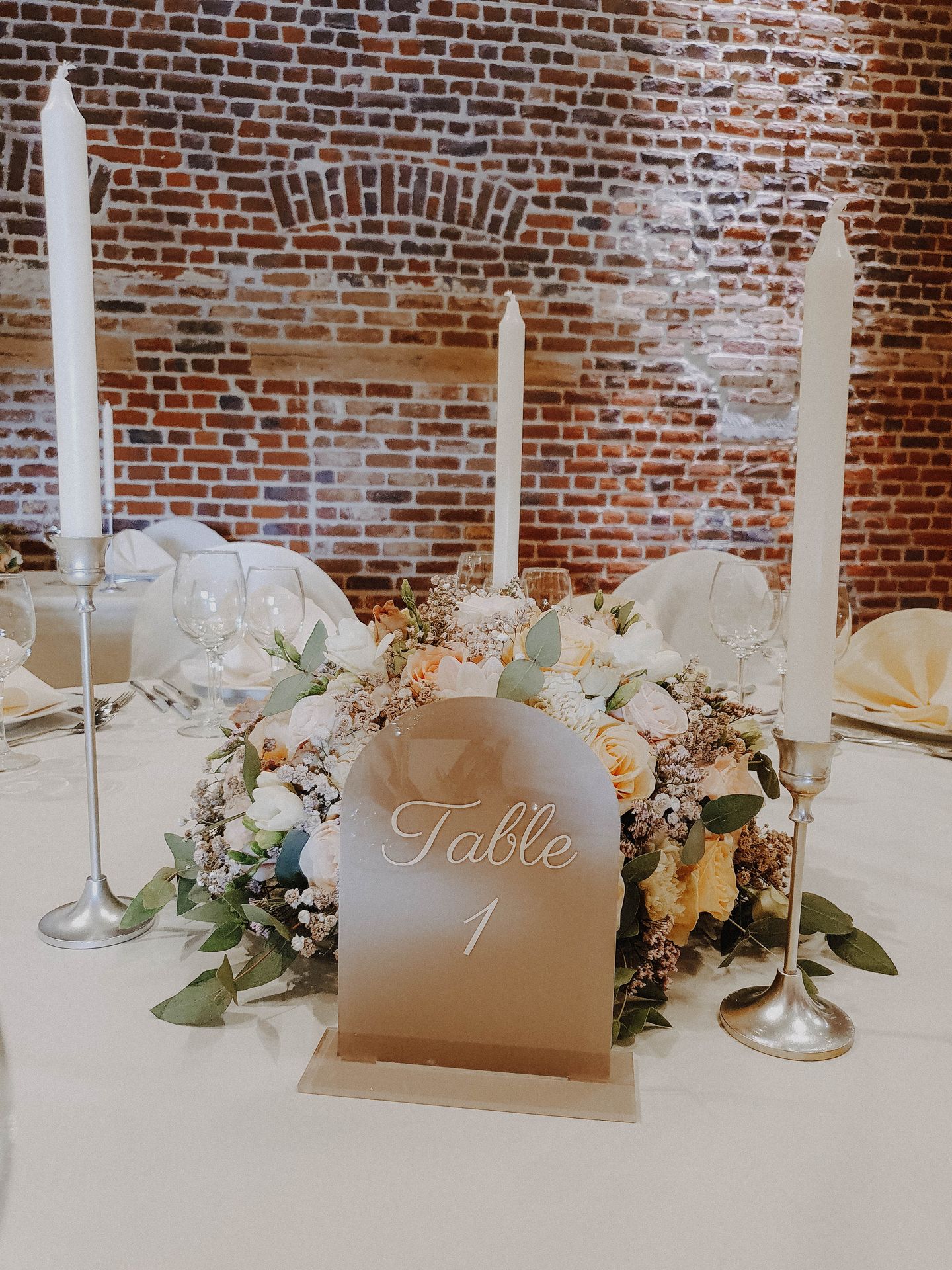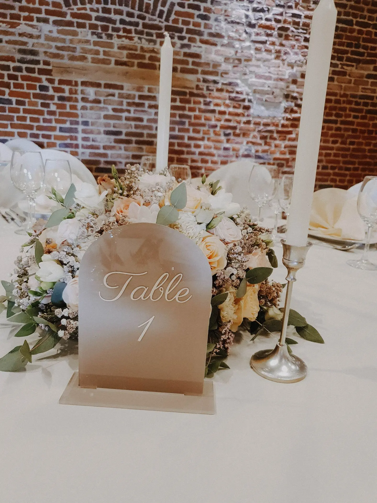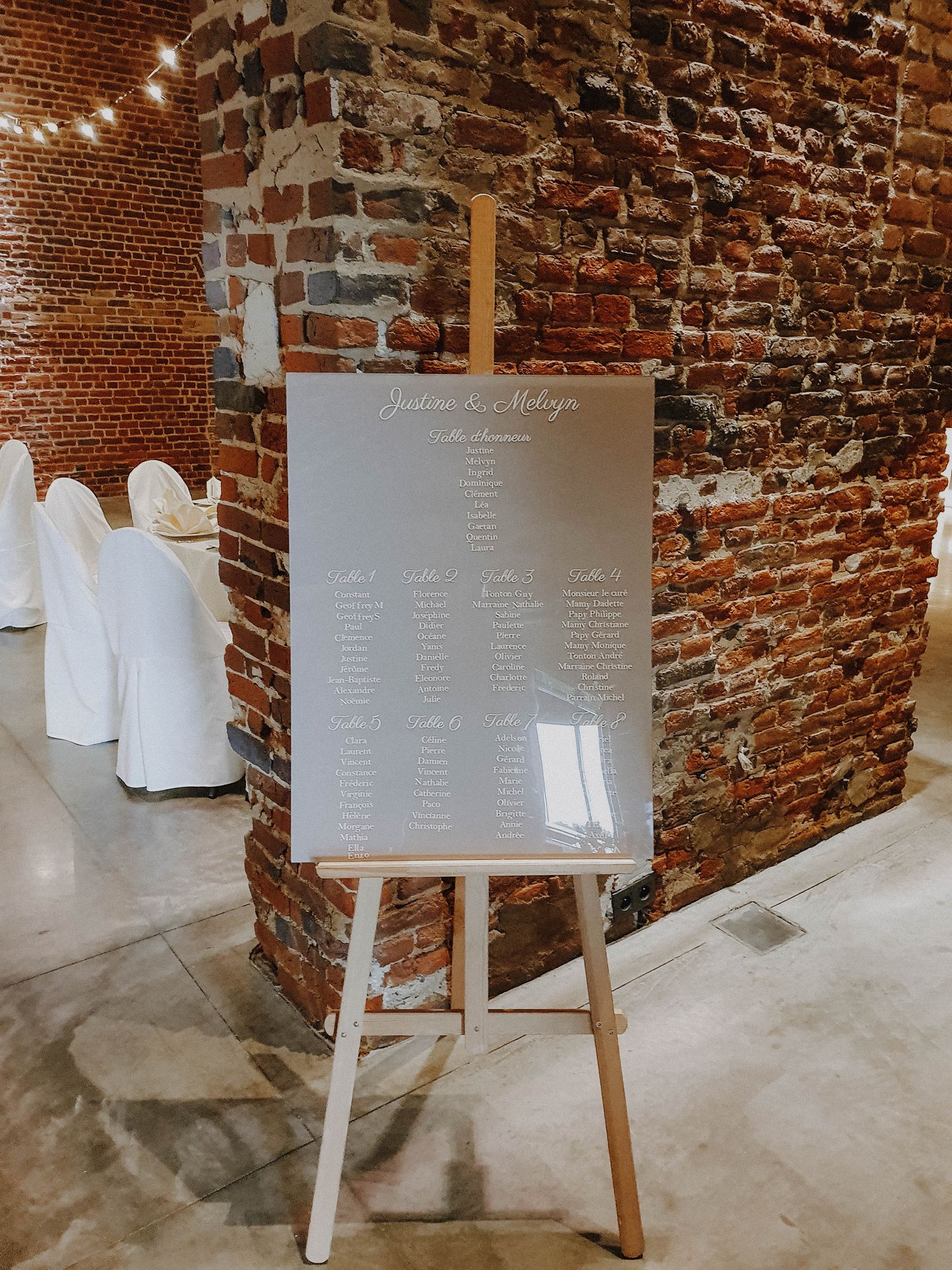 L’accueil des invités était soigné avec un panneau de bienvenue, ainsi que le menu et le plan de table en plexi taupe, apportant une touche moderne et raffinée.