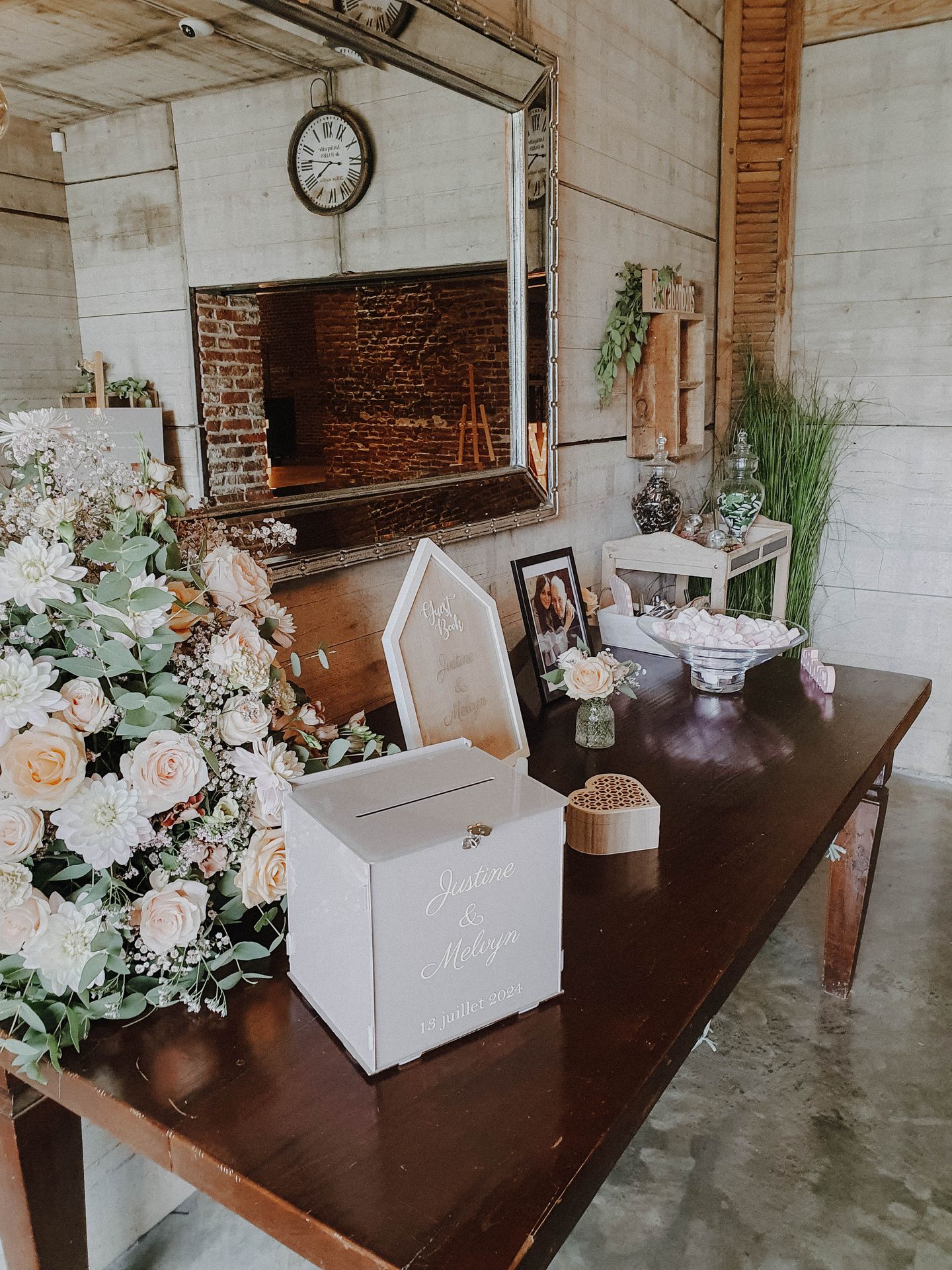 Pour le mariage de Justine et Melvyn à La Ferme de Bertinchamps, j’ai imaginé, en tant que décoratrice mariage et fleuriste mariage, une décoration florale moderne, élégante et raffinée, parfaitement adaptée au lieu et à l’ambiance choisie par les mariés.