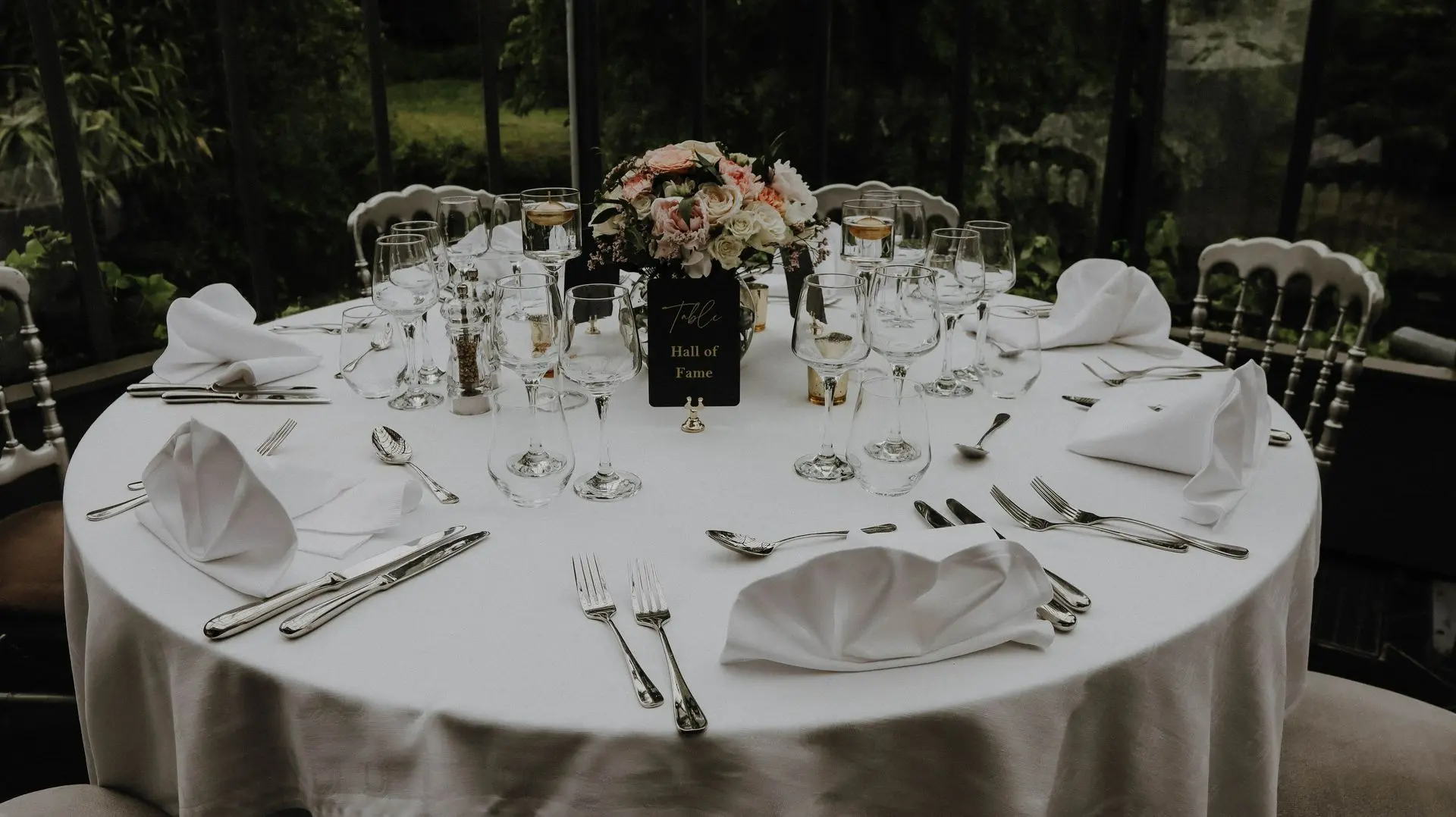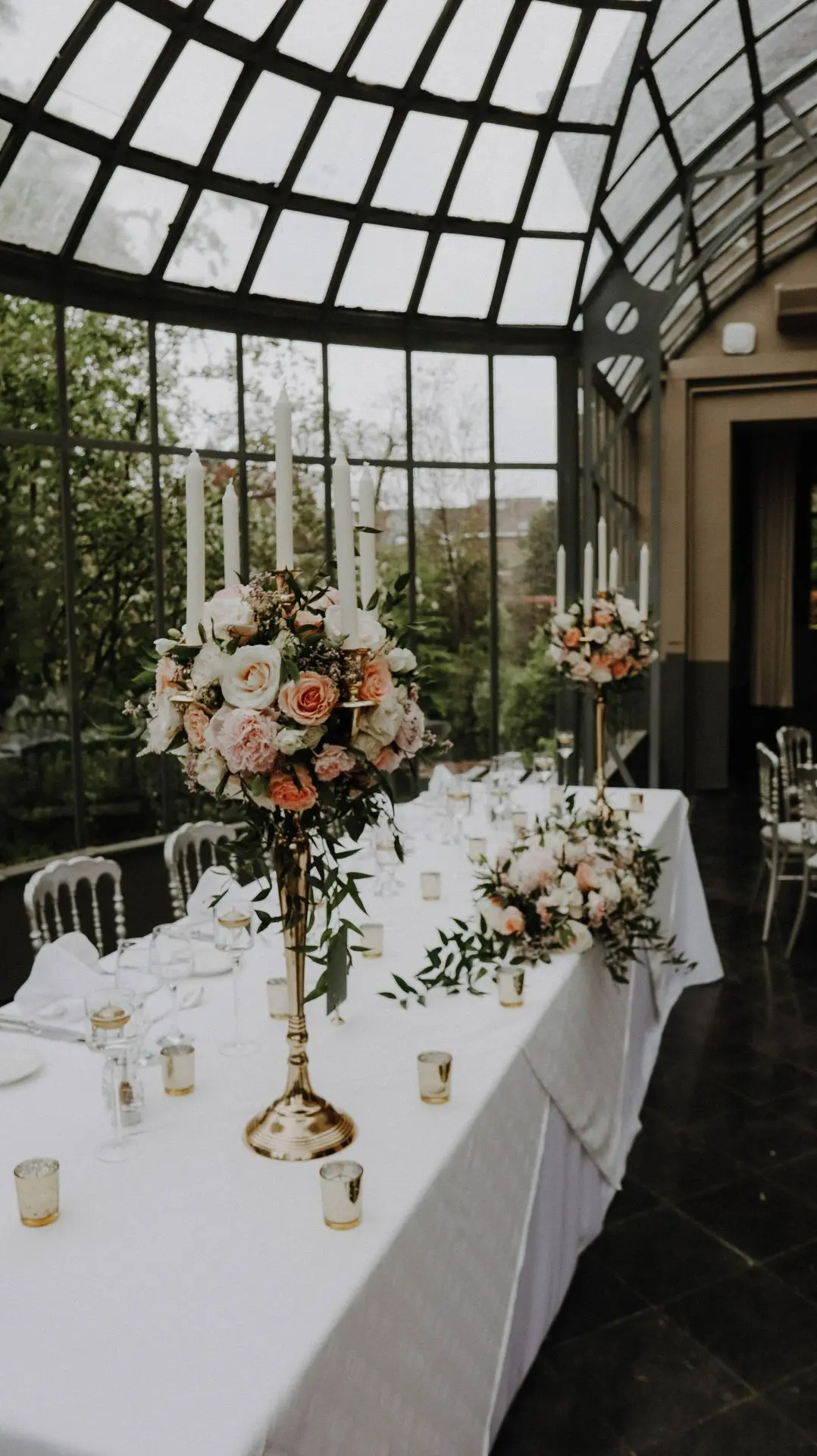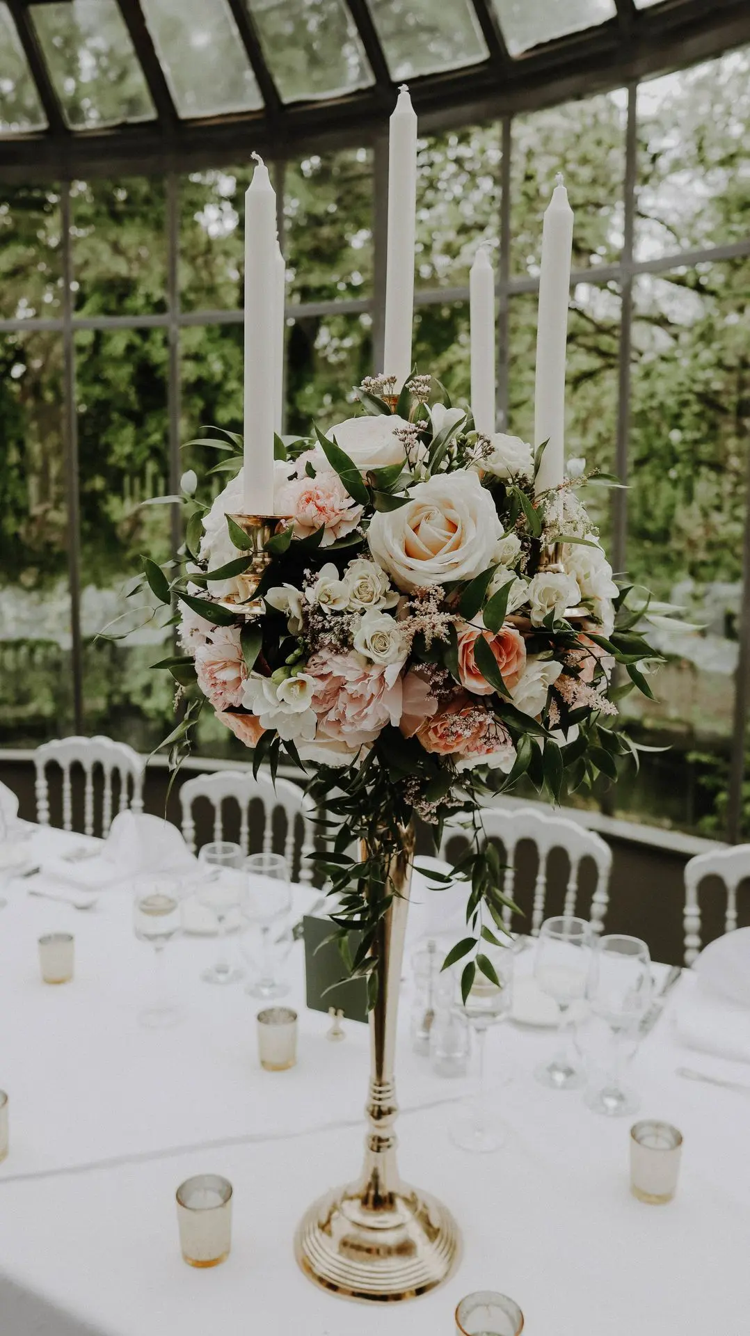 La table d’honneur se distinguait avec deux chandeliers raffinés et un montage fleuri majestueux placé devant les mariés, apportant une touche de sophistication à l’ensemble de la décoration.