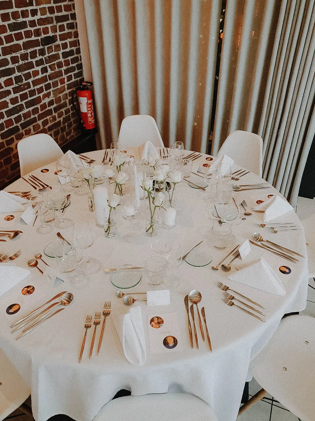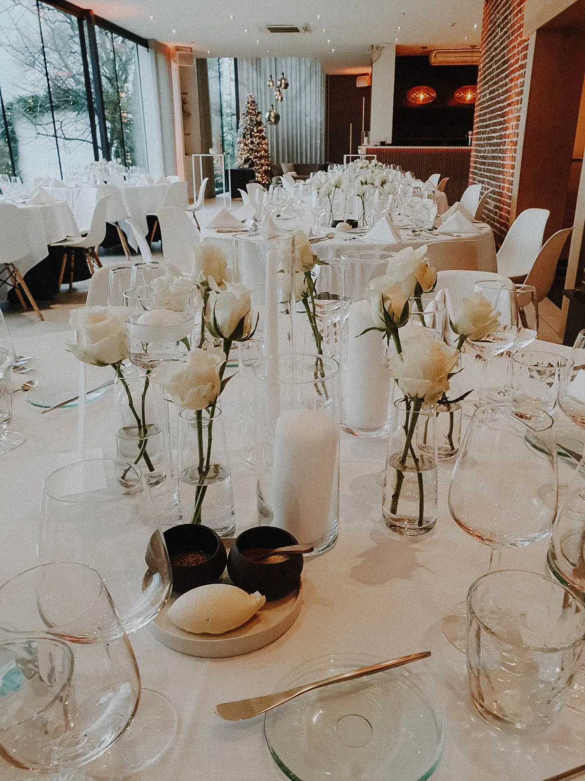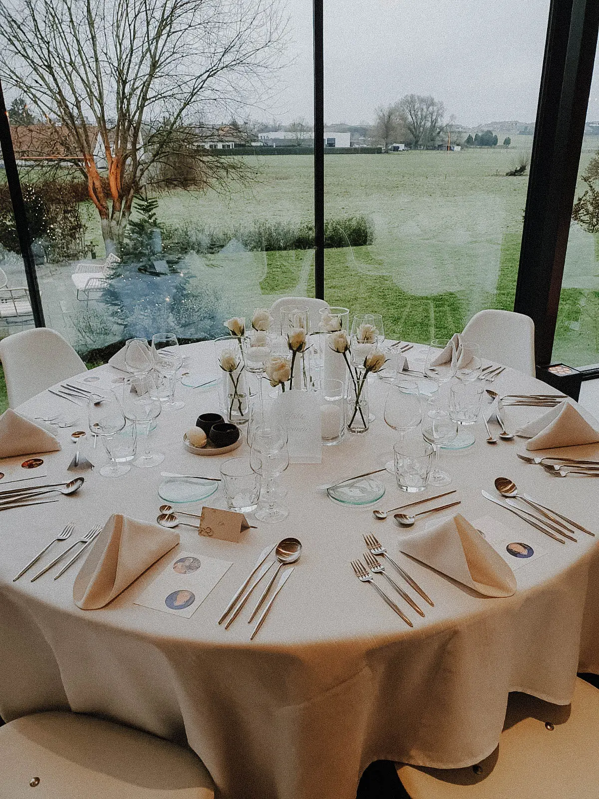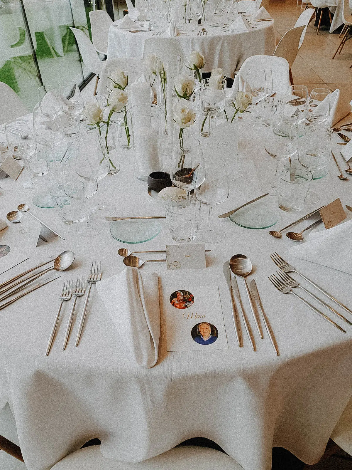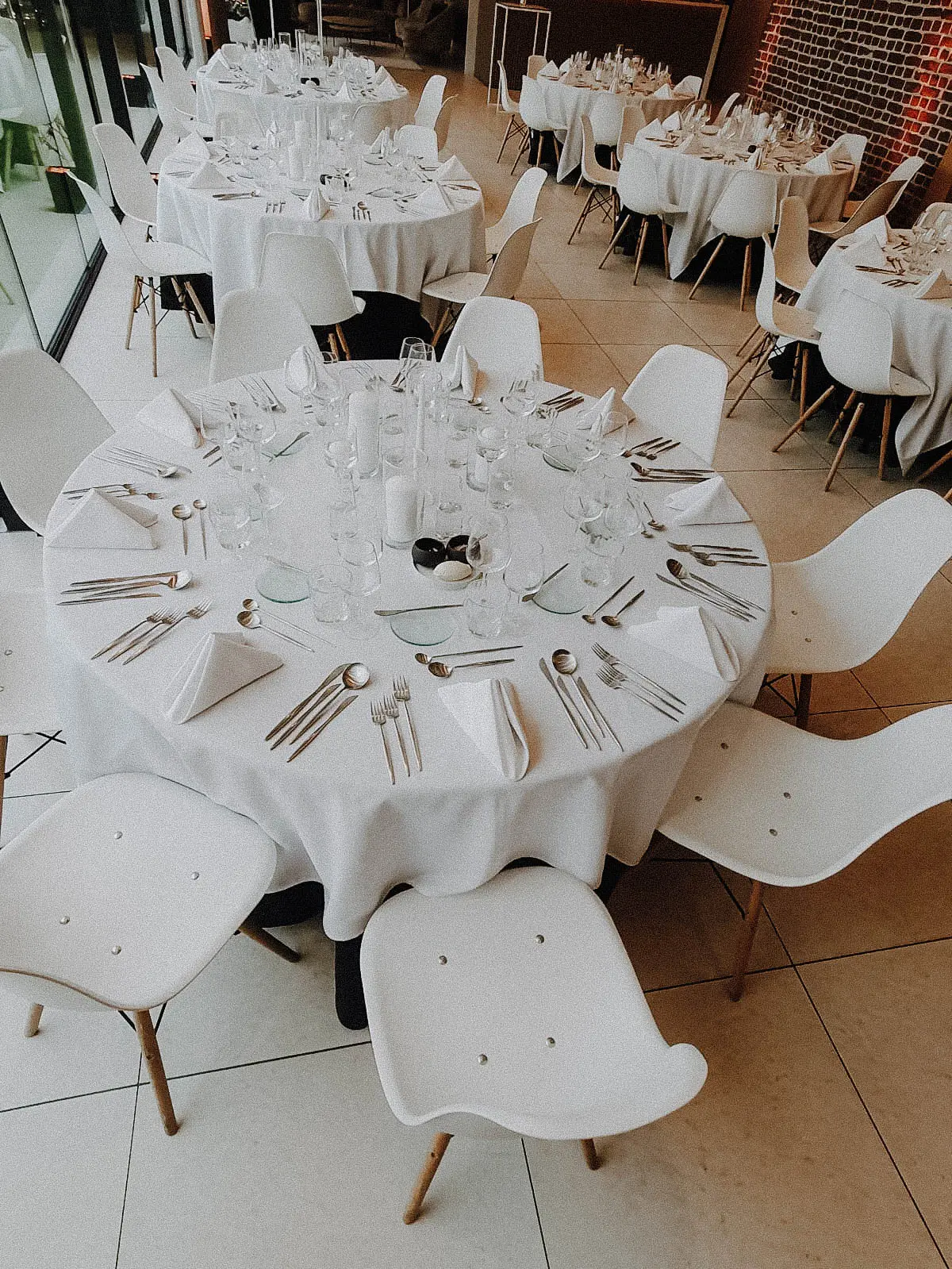 Un mariage tout en blanc, où chaque détail a été pensé avec élégance. Les tables étaient parées d’un ensemble de petits vases et de bougies délicates, apportant chaleur et intimité à l’espace. L’ambiance était douce et raffinée, reflétant parfaitement l’esprit romantique et lumineux de cette journée unique.