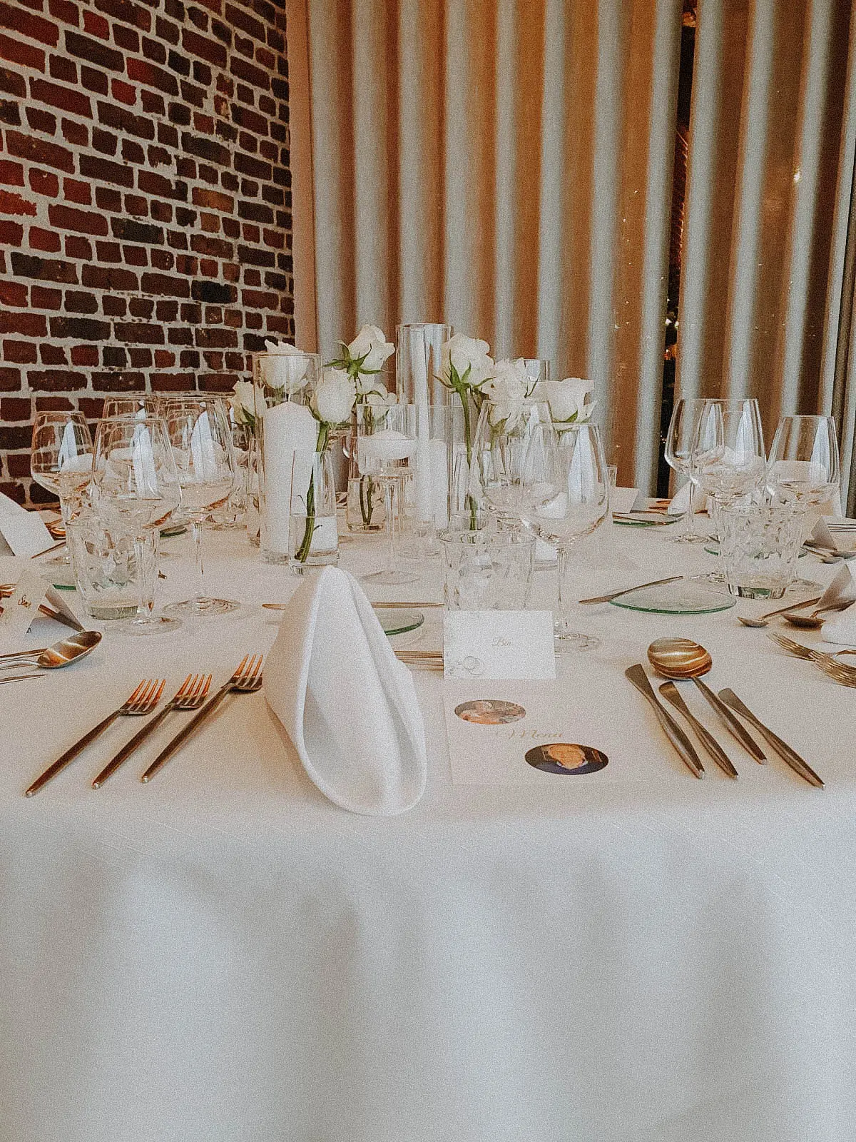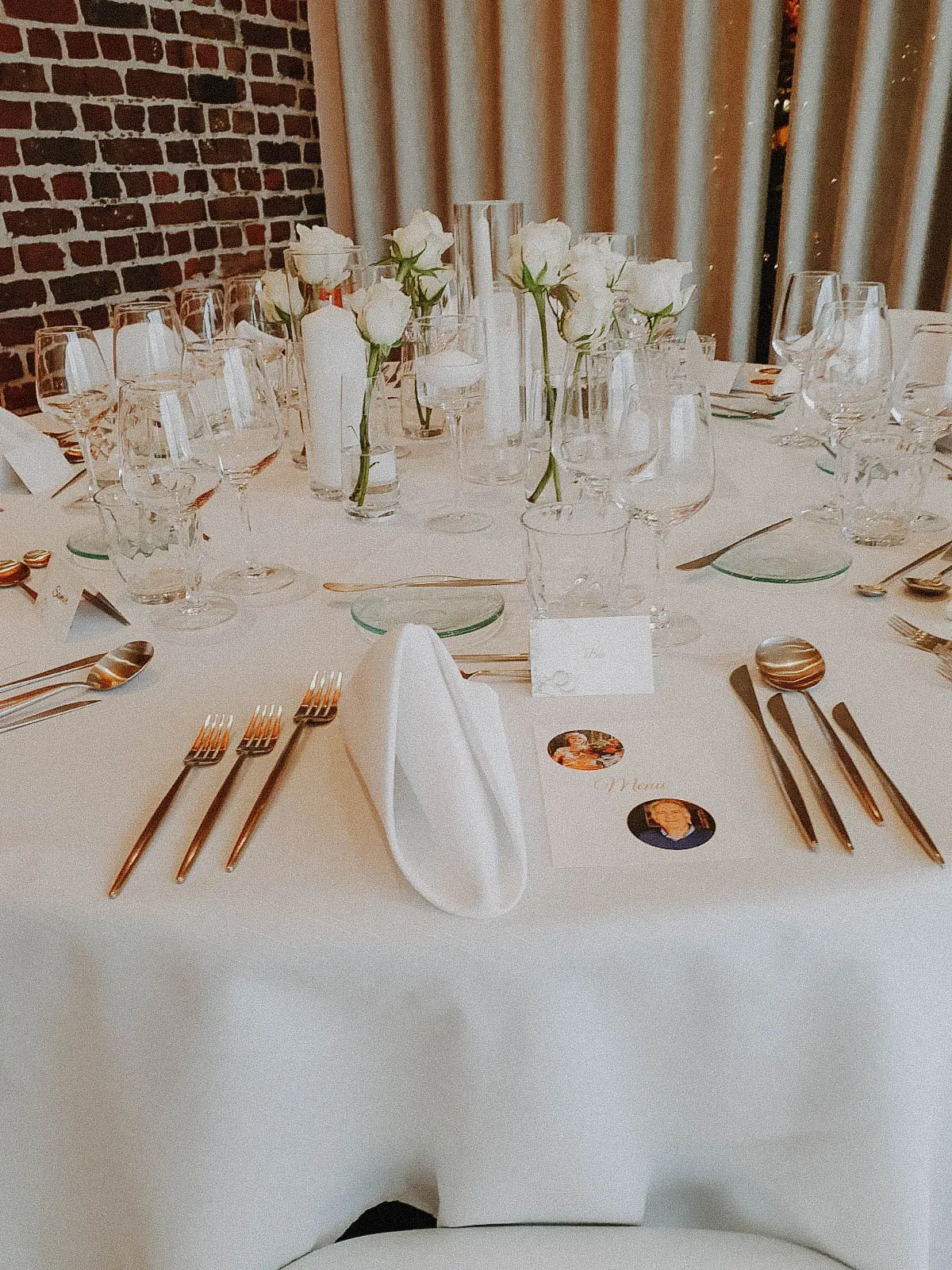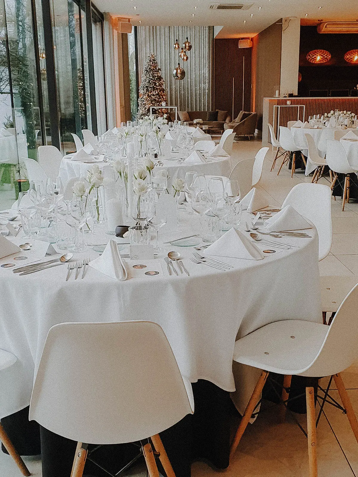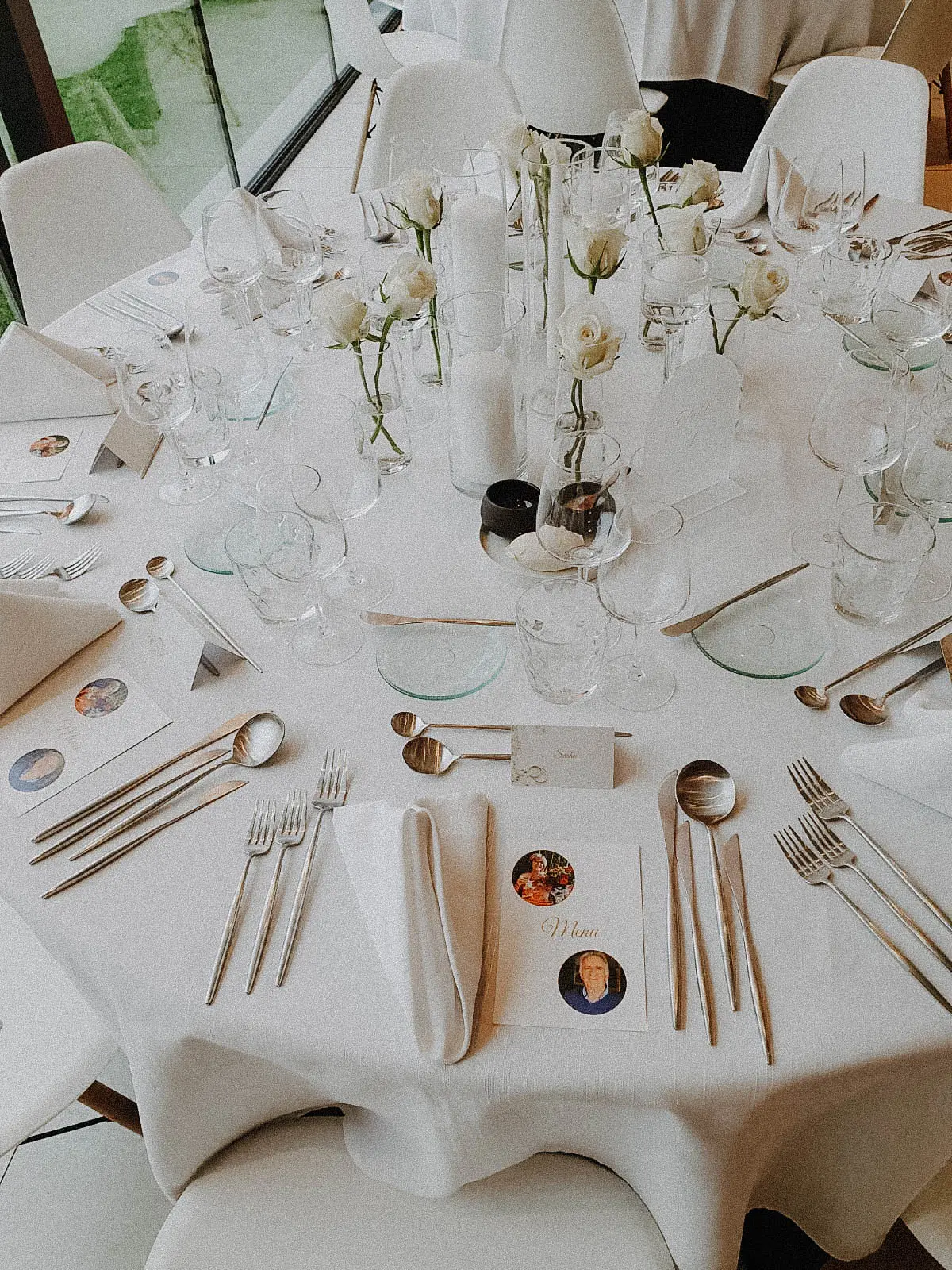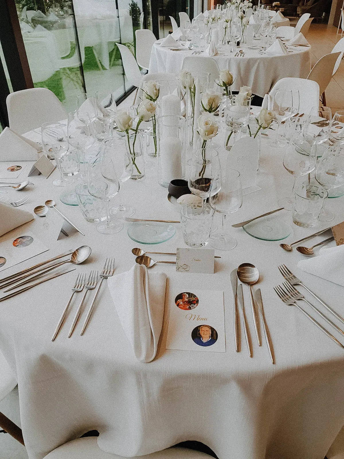 Un mariage tout en blanc, où chaque détail a été pensé avec élégance. Les tables étaient parées d’un ensemble de petits vases et de bougies délicates, apportant chaleur et intimité à l’espace. L’ambiance était douce et raffinée, reflétant parfaitement l’esprit romantique et lumineux de cette journée unique.
