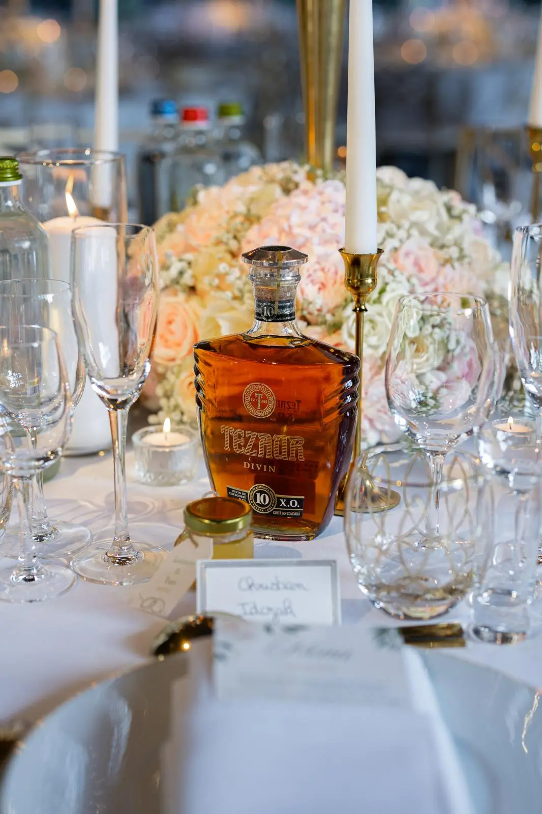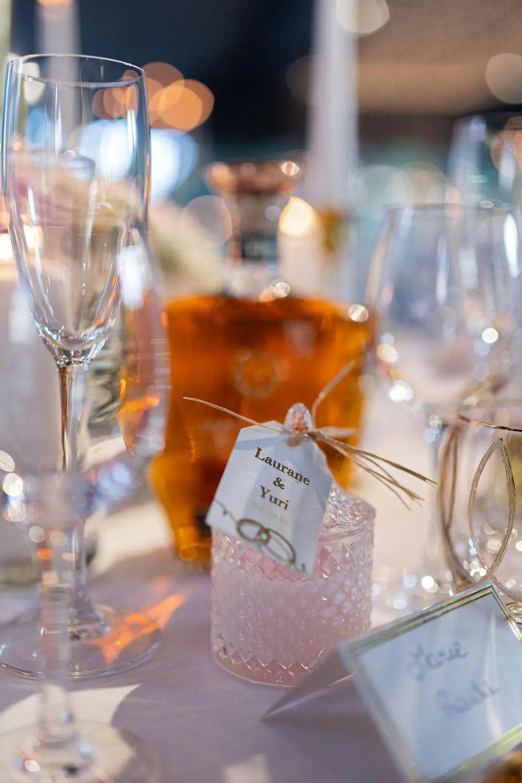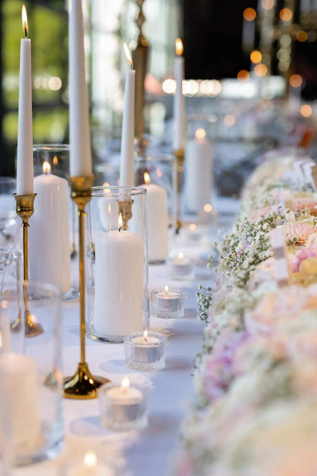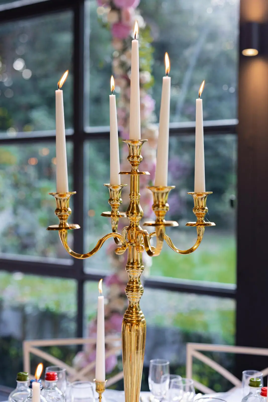 Sur les tables des invités, des chandeliers dorés étaient accompagnés d’une boule de fleurs à leur base, ajoutant sophistication et harmonie à la décoration.