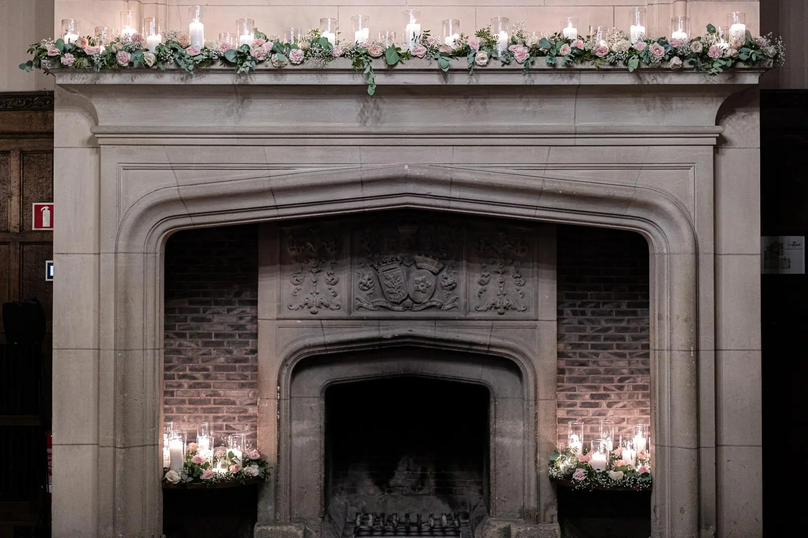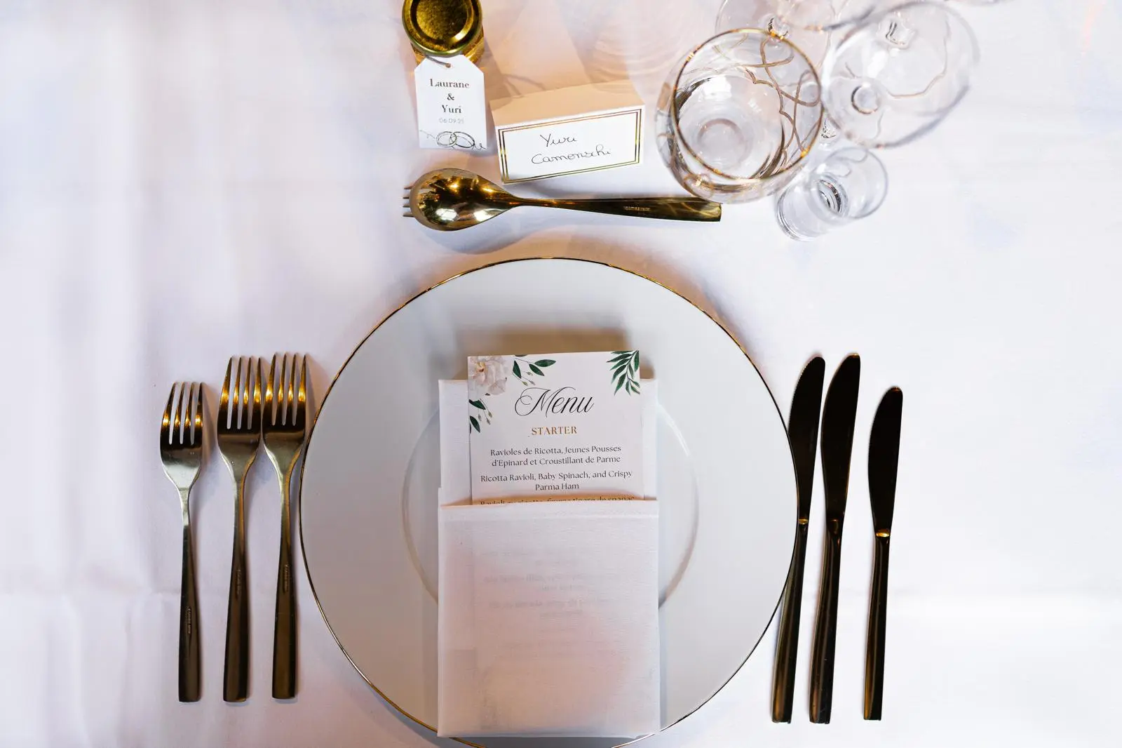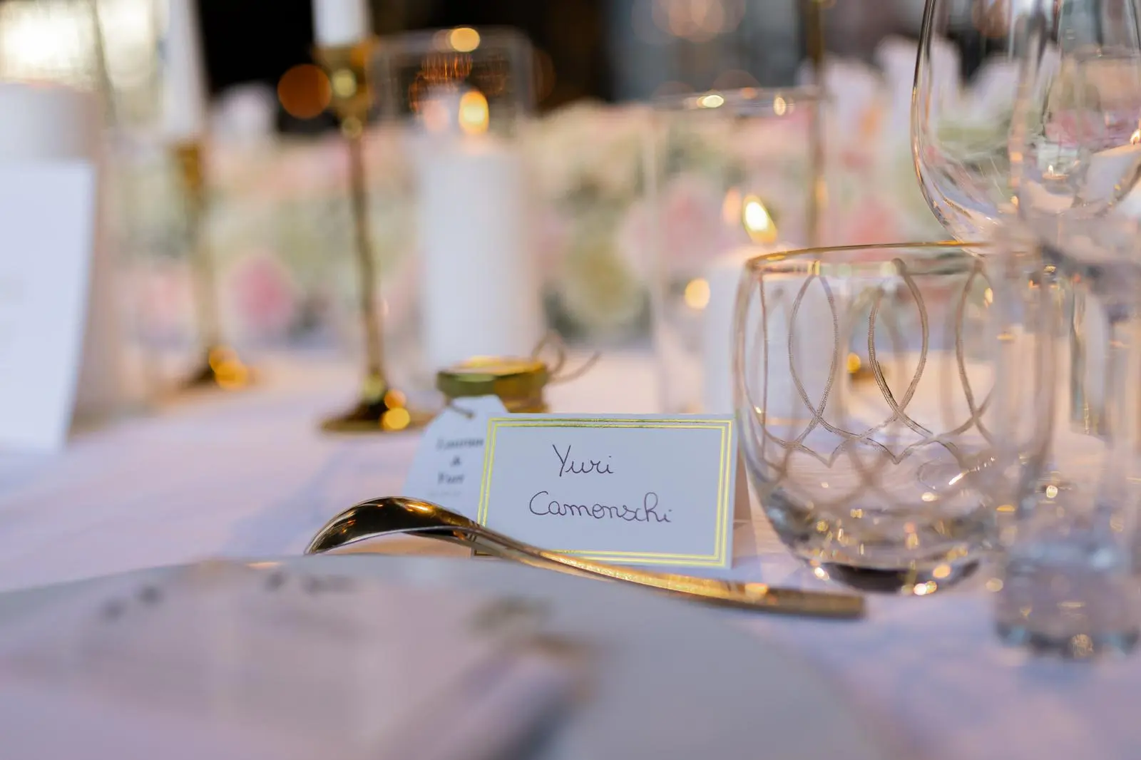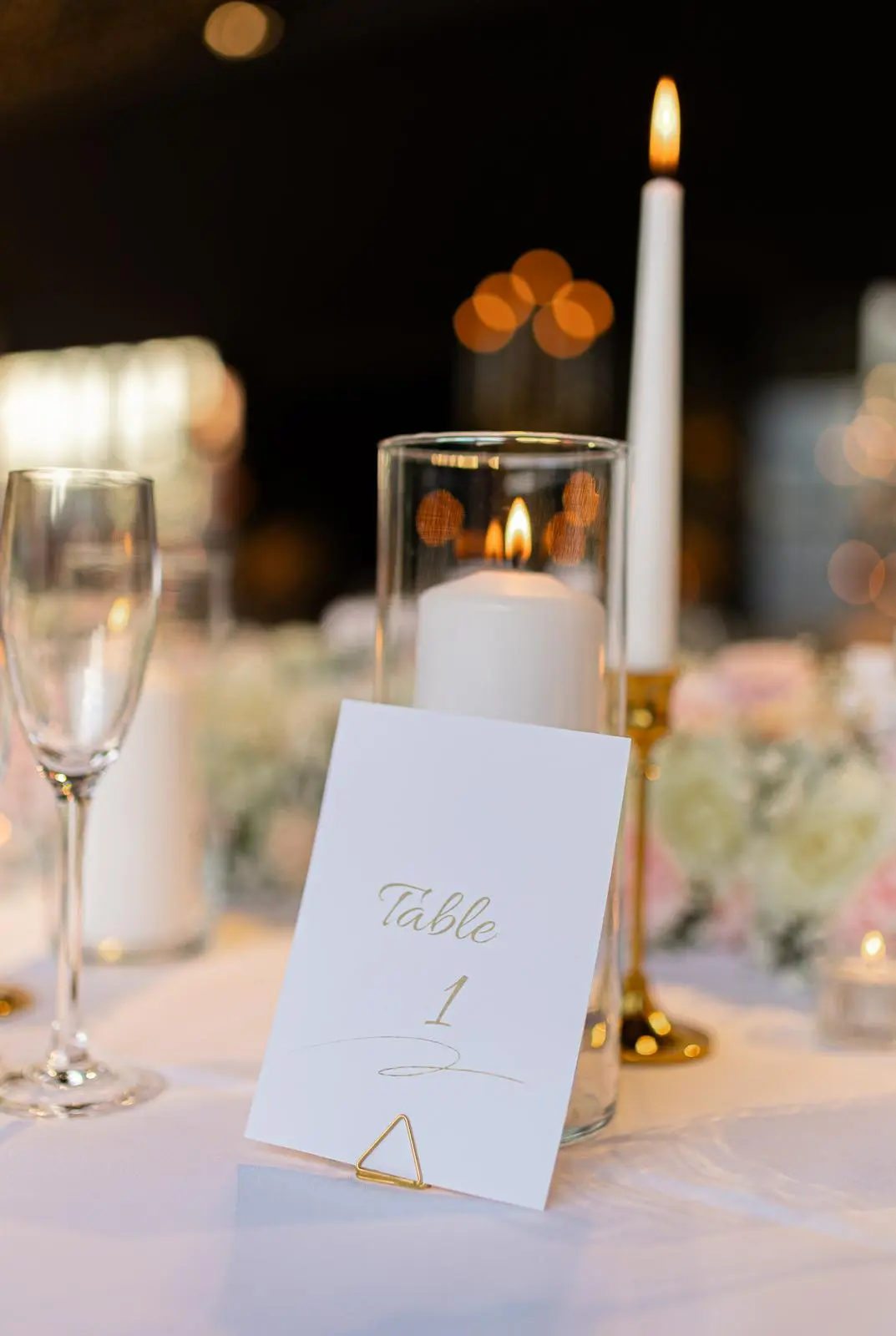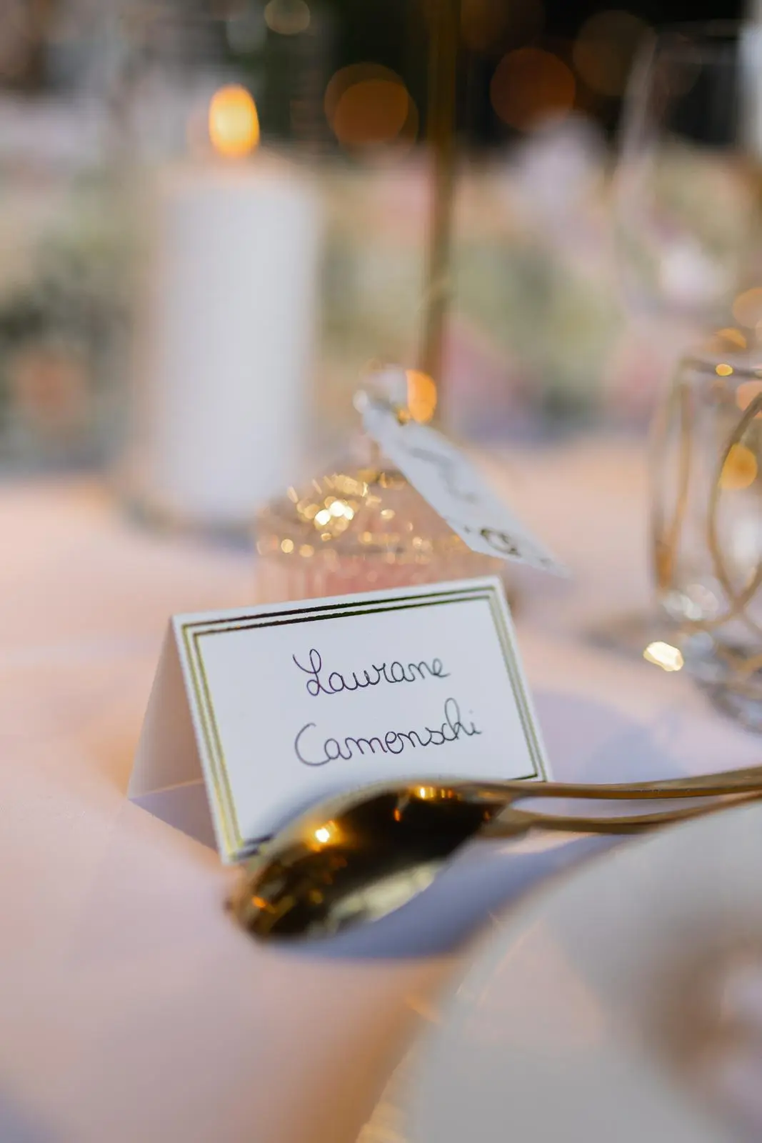 Sur les tables des invités, des chandeliers dorés étaient accompagnés d’une boule de fleurs à leur base, ajoutant sophistication et harmonie à la décoration.