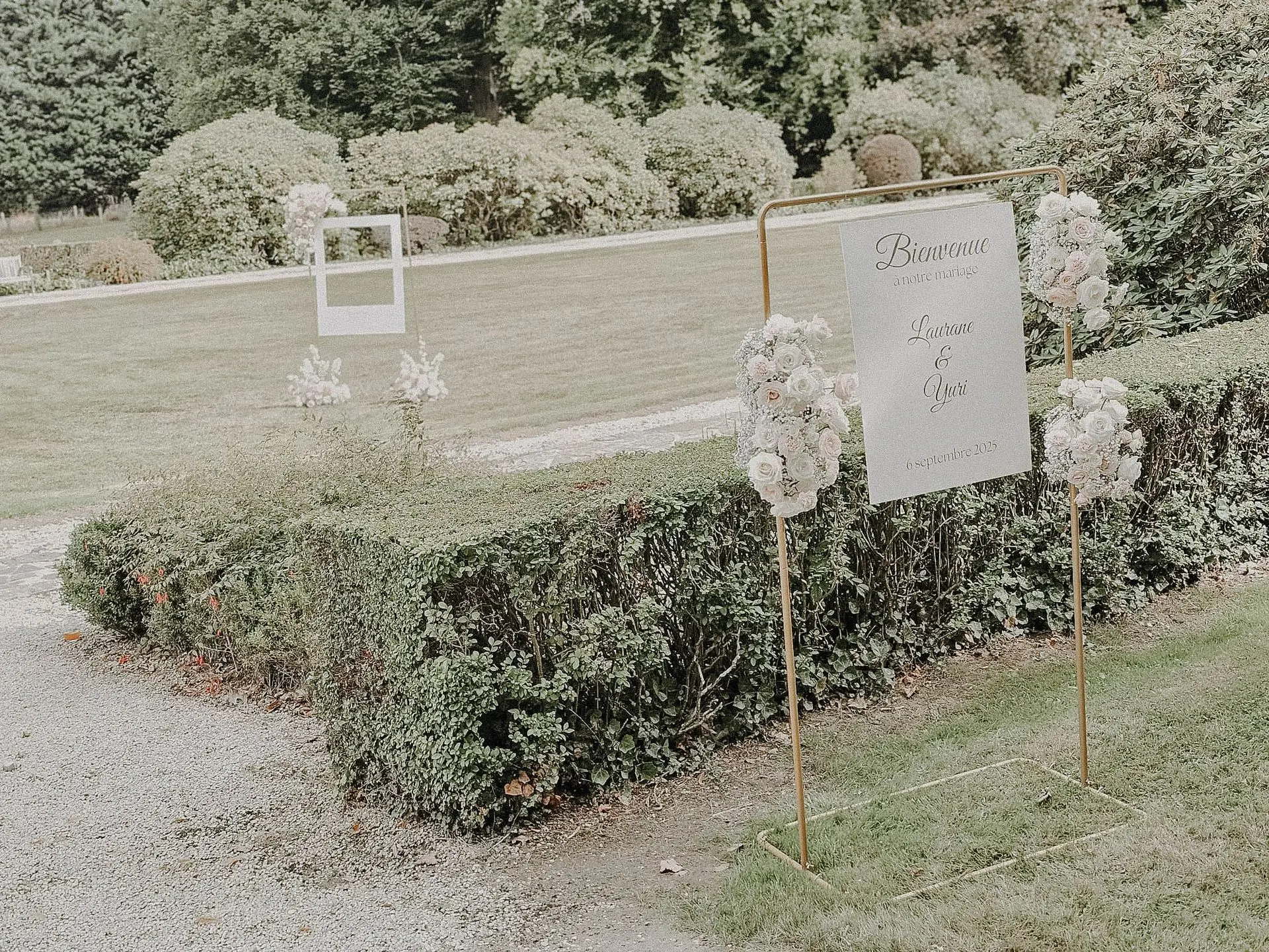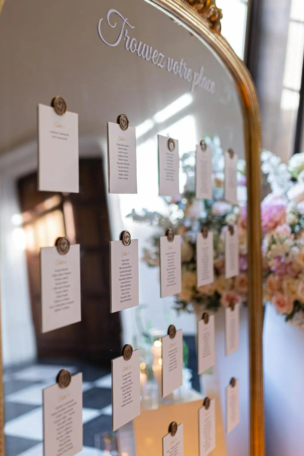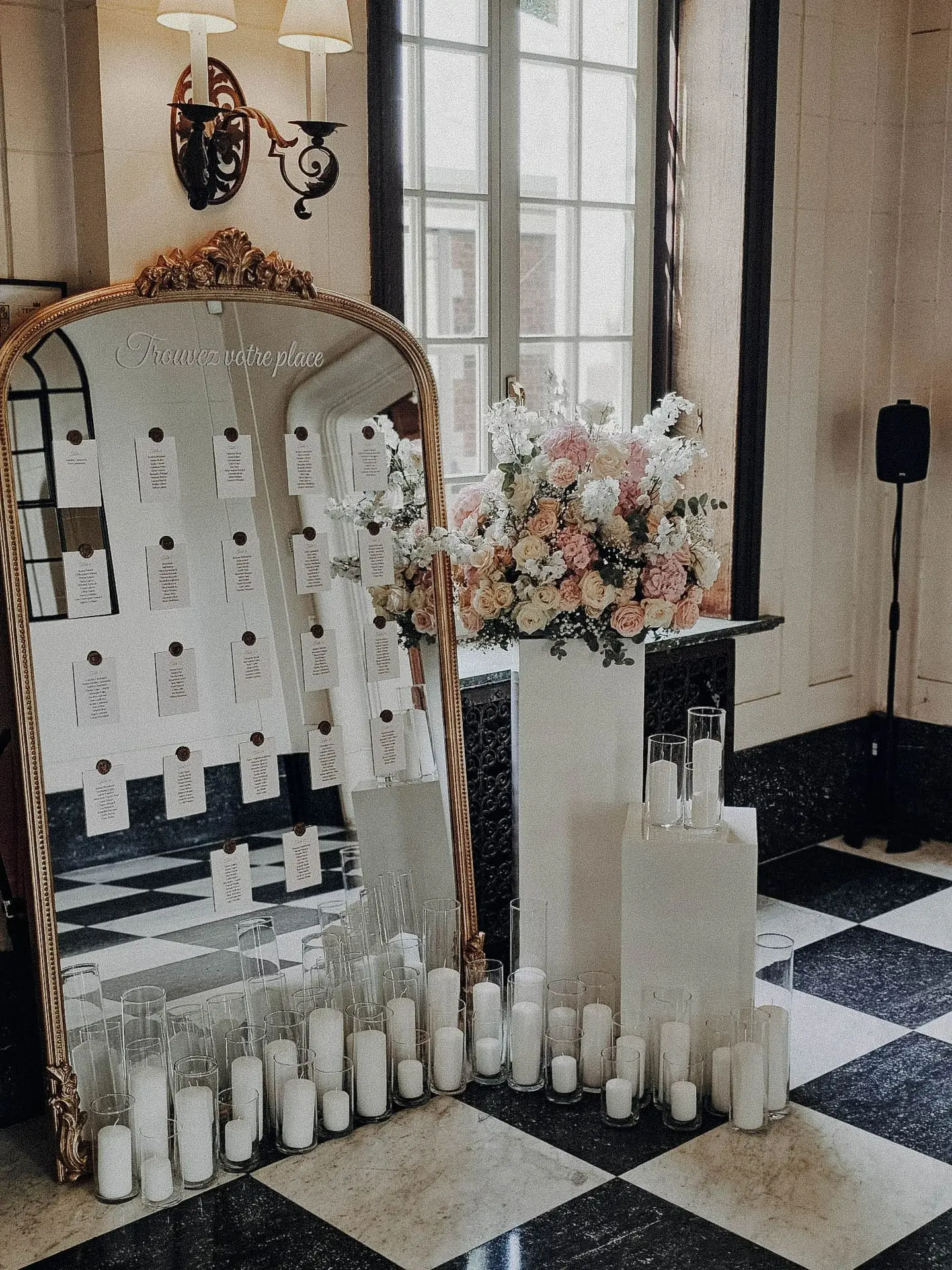 Trois panneaux ont accueilli les invités : un panneau de bienvenue en plexi blanc, un photobooth en forme de cadre, et un miroir XXL servant de plan de table, donnant le ton élégant de la journée.