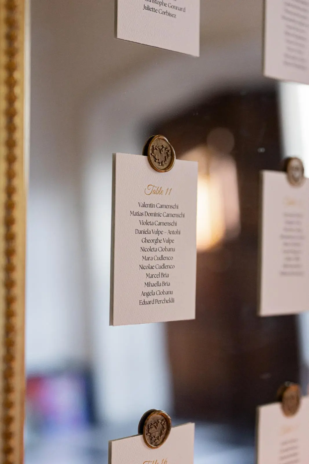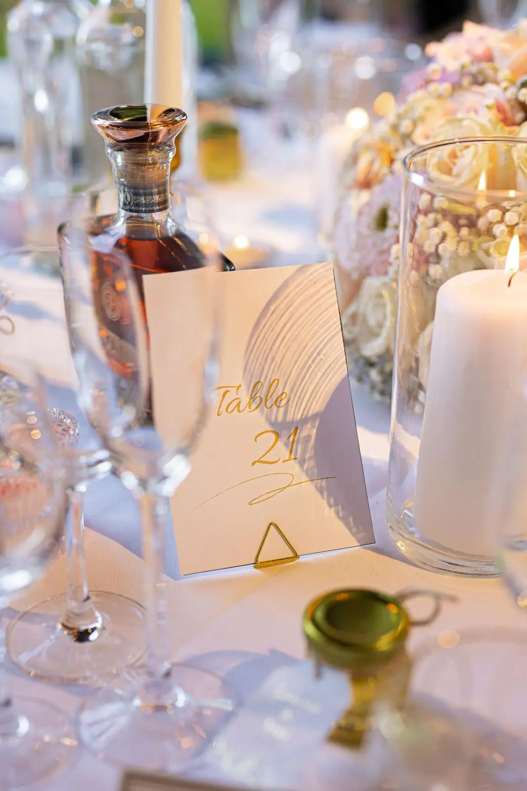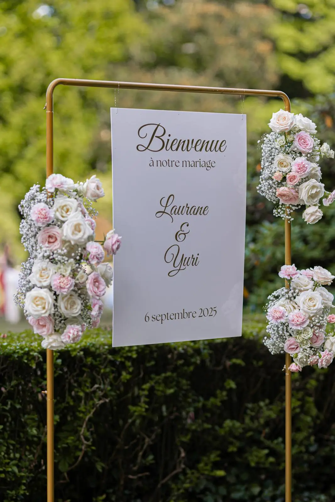 Trois panneaux ont accueilli les invités : un panneau de bienvenue en plexi blanc, un photobooth en forme de cadre, et un miroir XXL servant de plan de table, donnant le ton élégant de la journée.