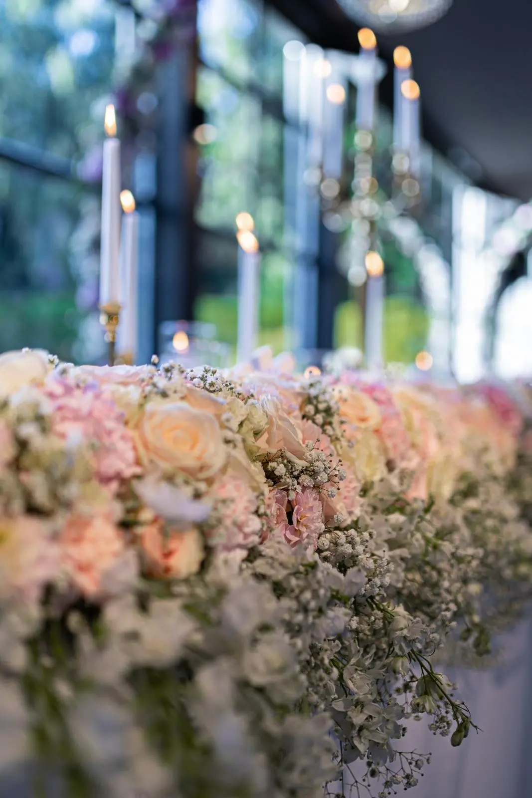 Pour la table d’honneur, un long chemin de fleurs complétait l’ensemble, créant une atmosphère romantique et élégante, parfaite pour cette journée unique.