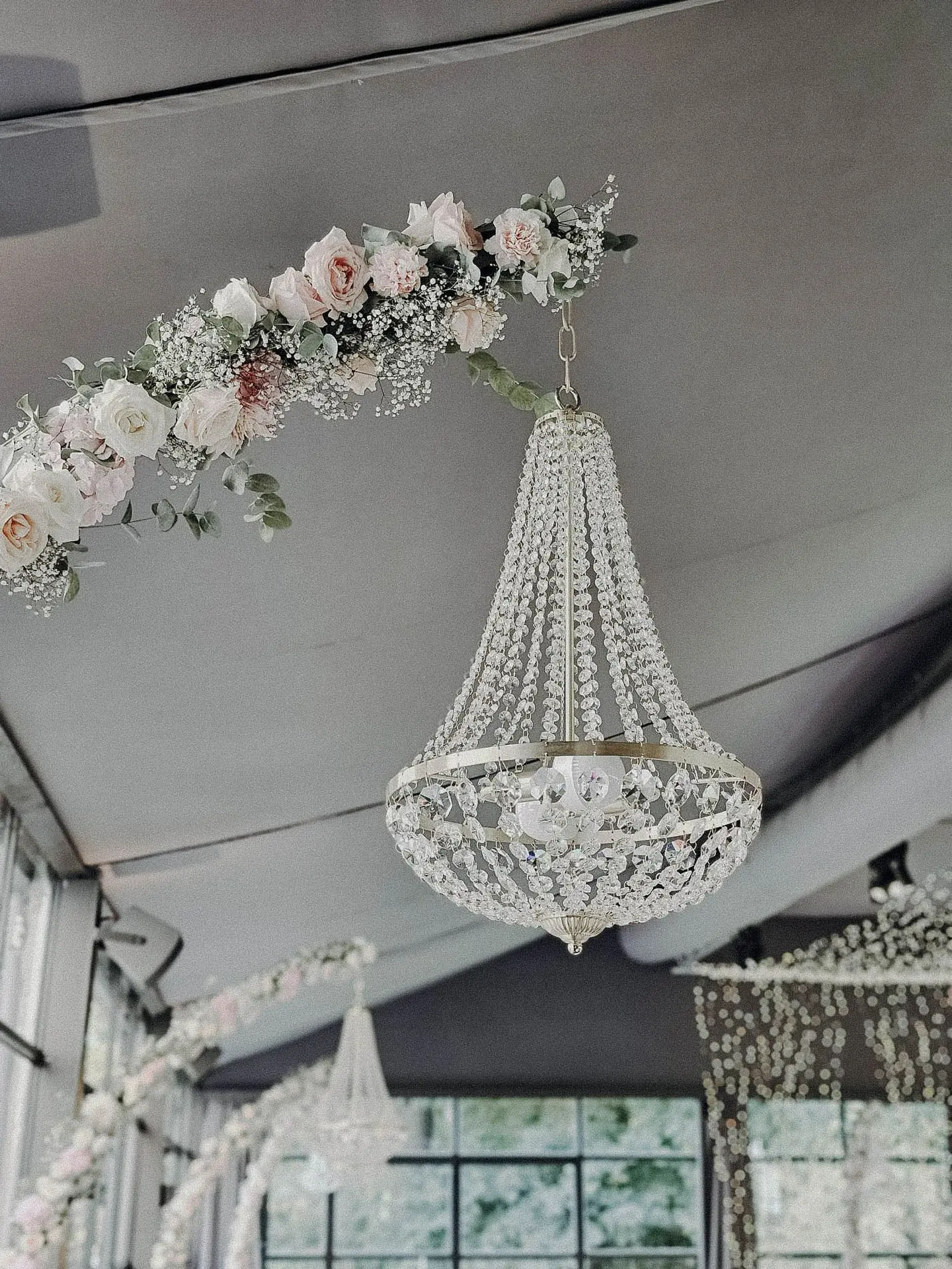 Dans la salle, dix lustres au pied fleuri illuminaient l’espace avec grâce et raffinement, apportant une ambiance chaleureuse et harmonieuse.