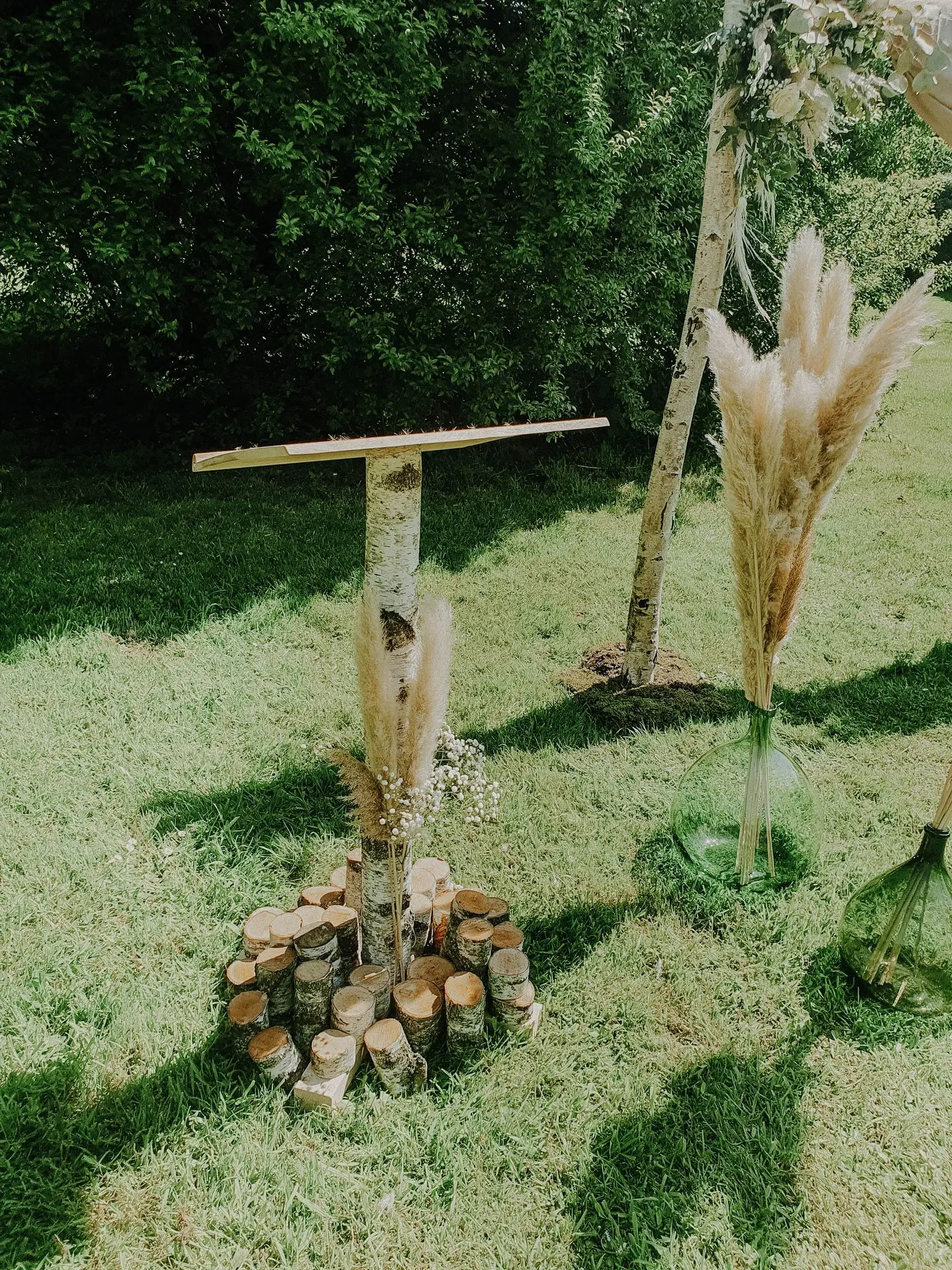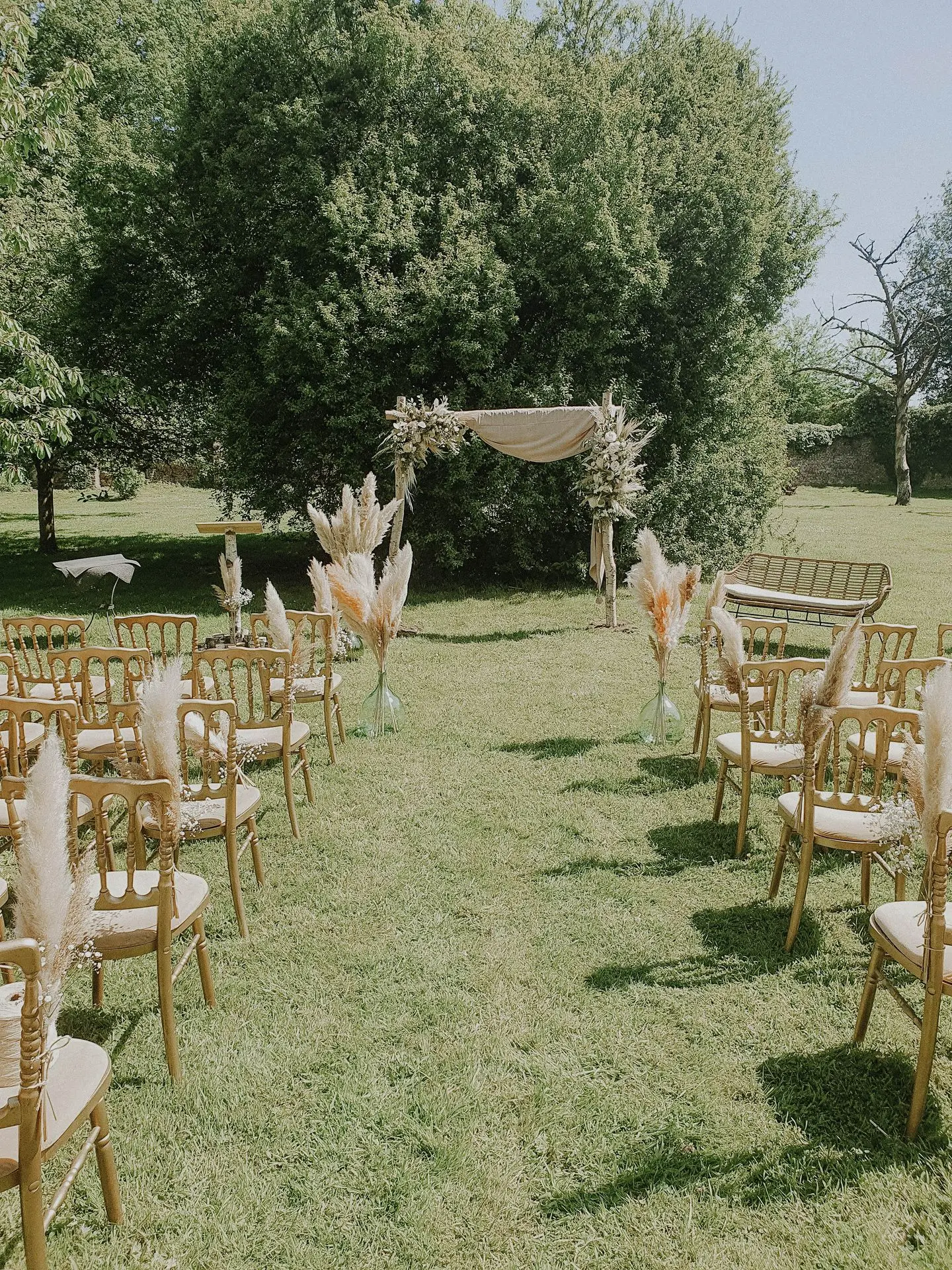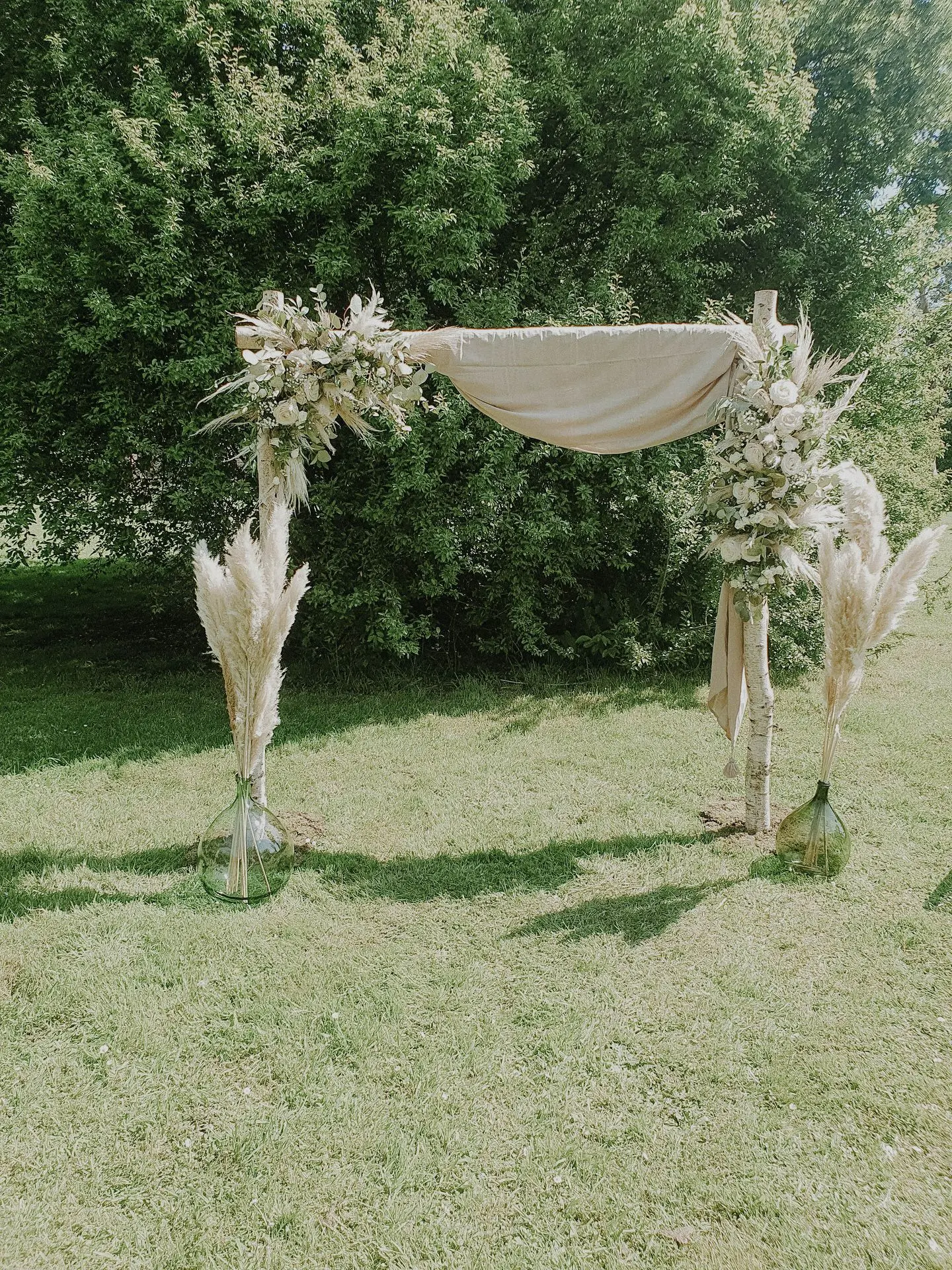 La pampa apportait une touche douce et aérienne, en parfaite harmonie avec l’ambiance naturelle et élégante du lieu. Chaque détail a été pensé pour sublimer la cérémonie et créer un décor poétique et chaleureux pour ce jour si spécial.