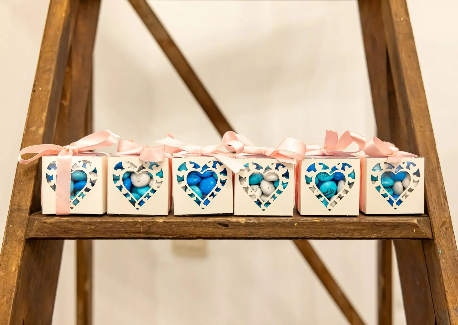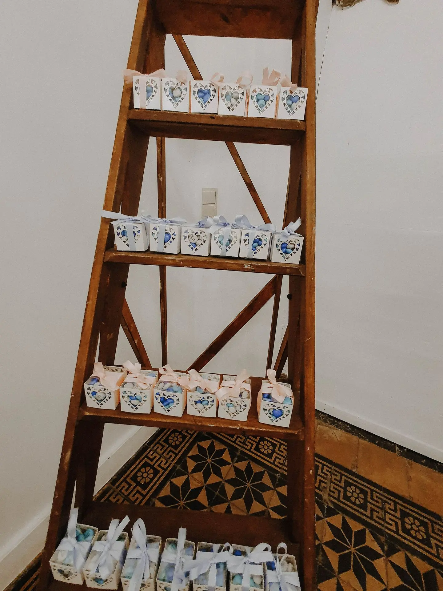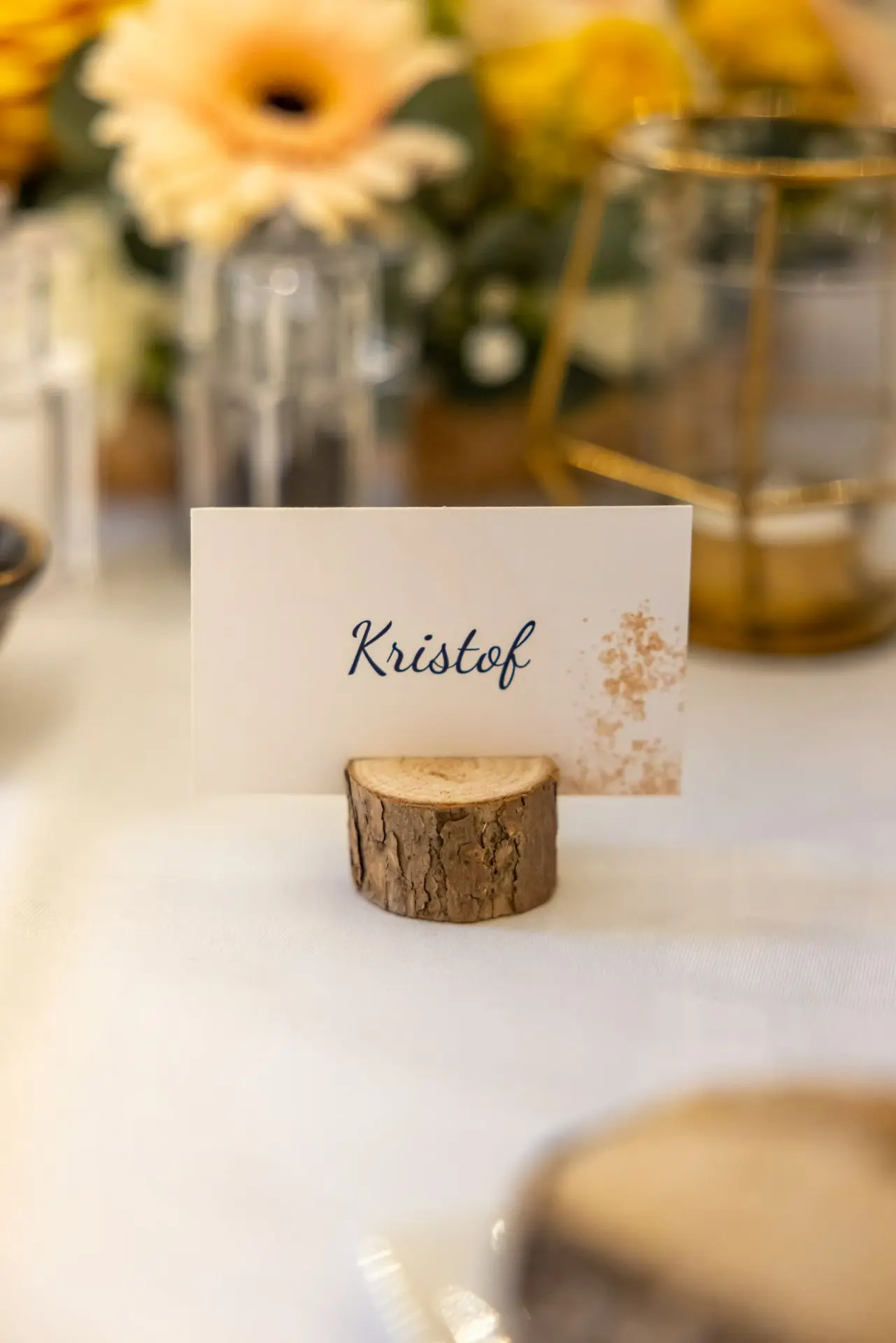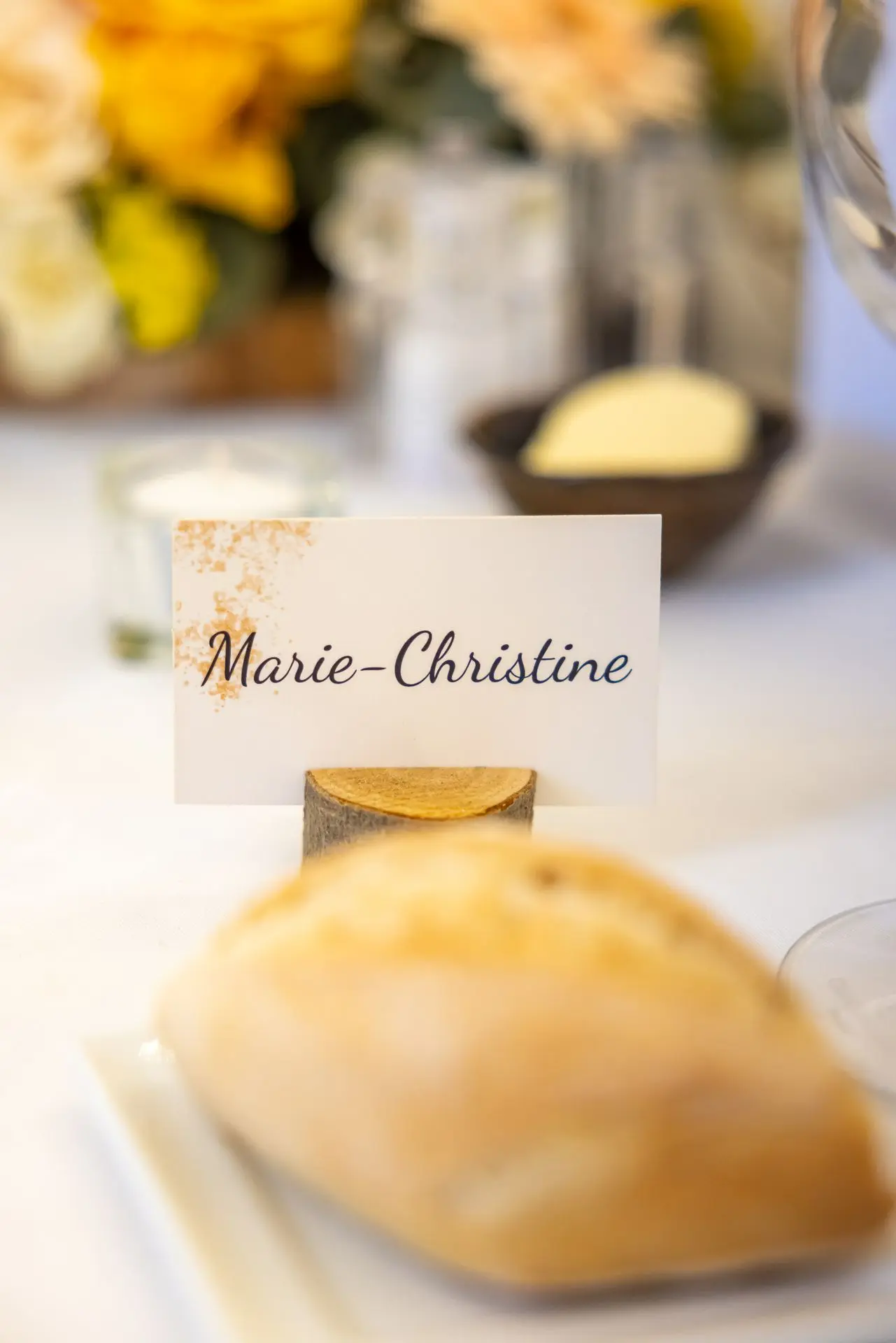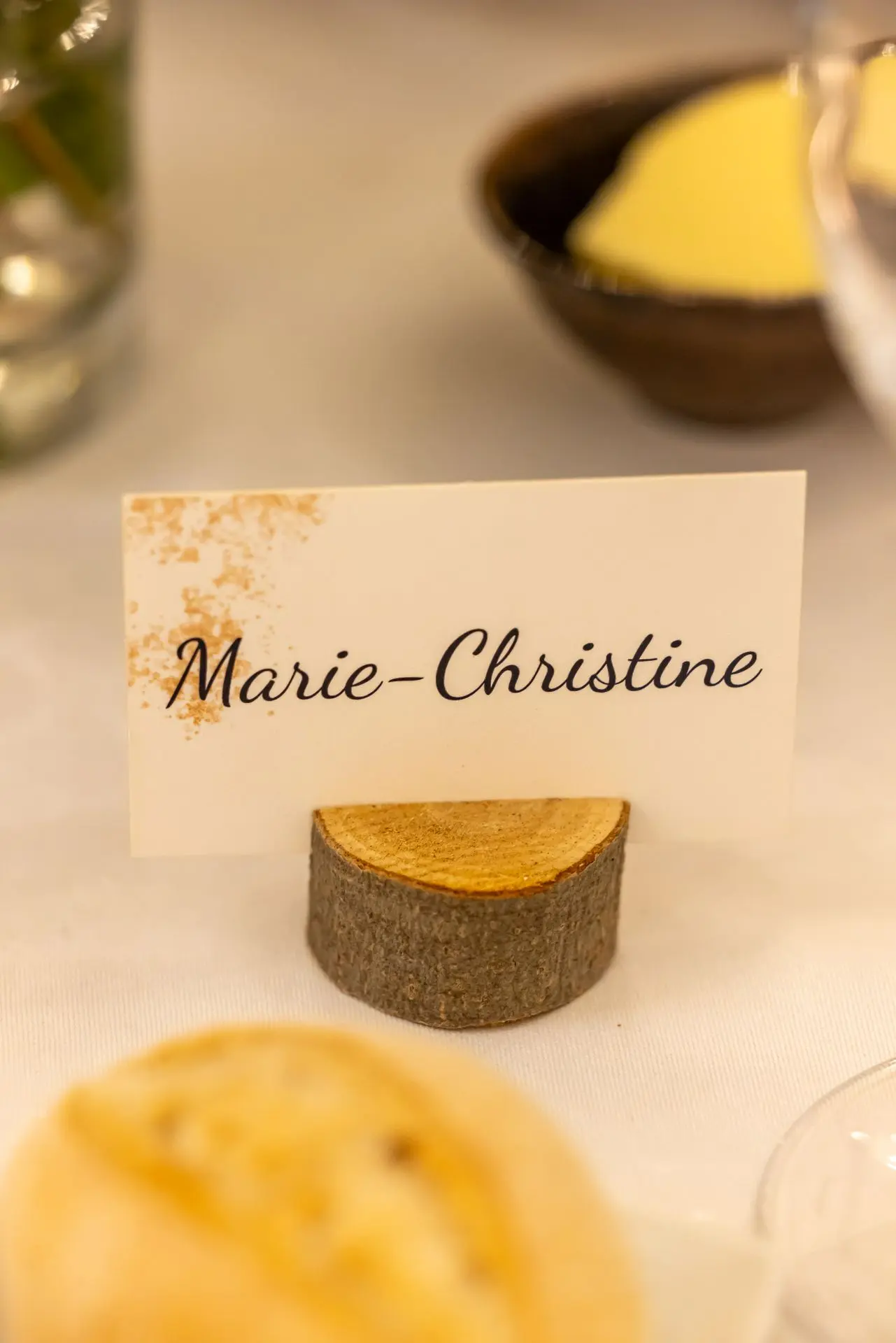 Les tables étaient décorées d’un rondin en bois, symbole d’authenticité, sur lequel reposait un montage en forme de boule, fleuri et élégant. Une atmosphère naturelle, douce et joyeuse, à l’image de leur joli mariage.