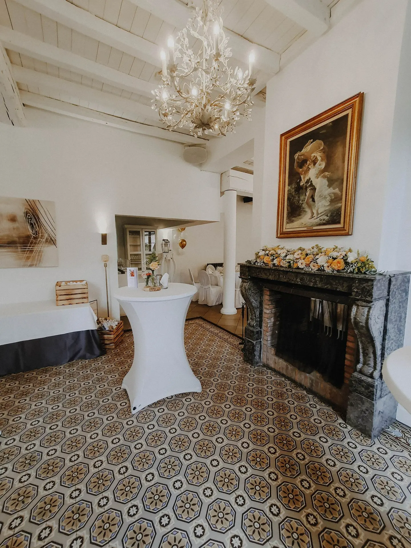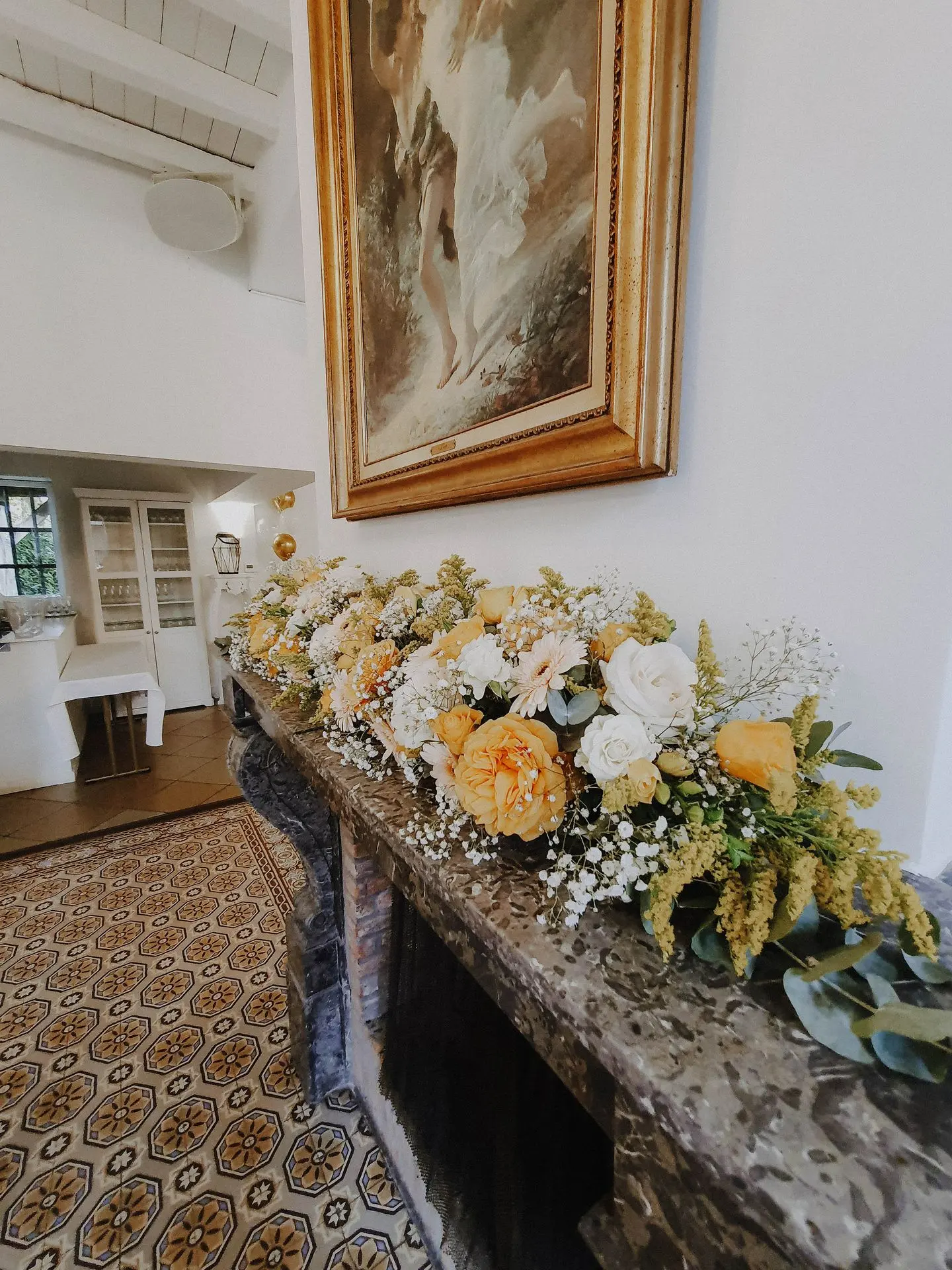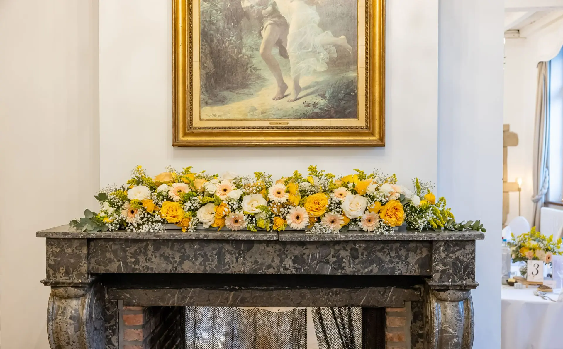 La cheminée fleurie créait un décor chaleureux et romantique, parfait pour accueillir les moments forts de leur journée.