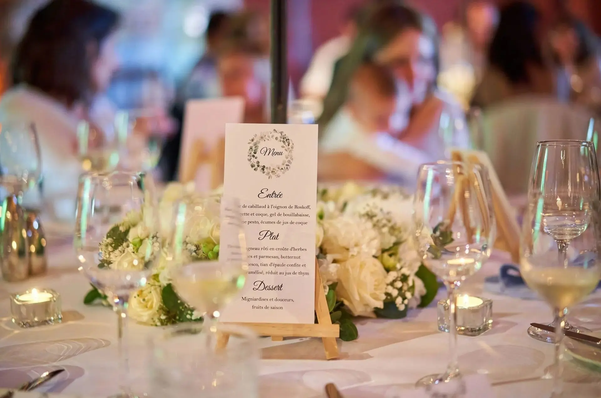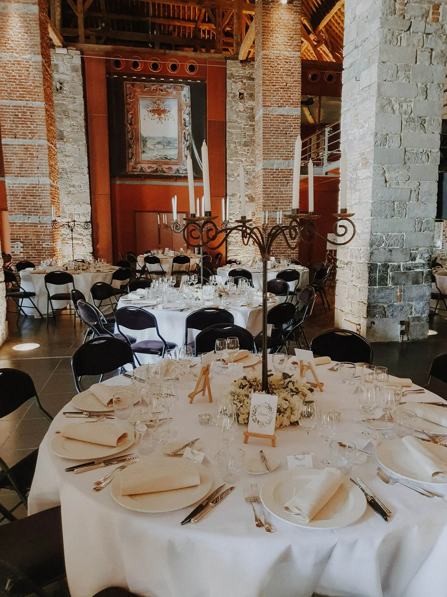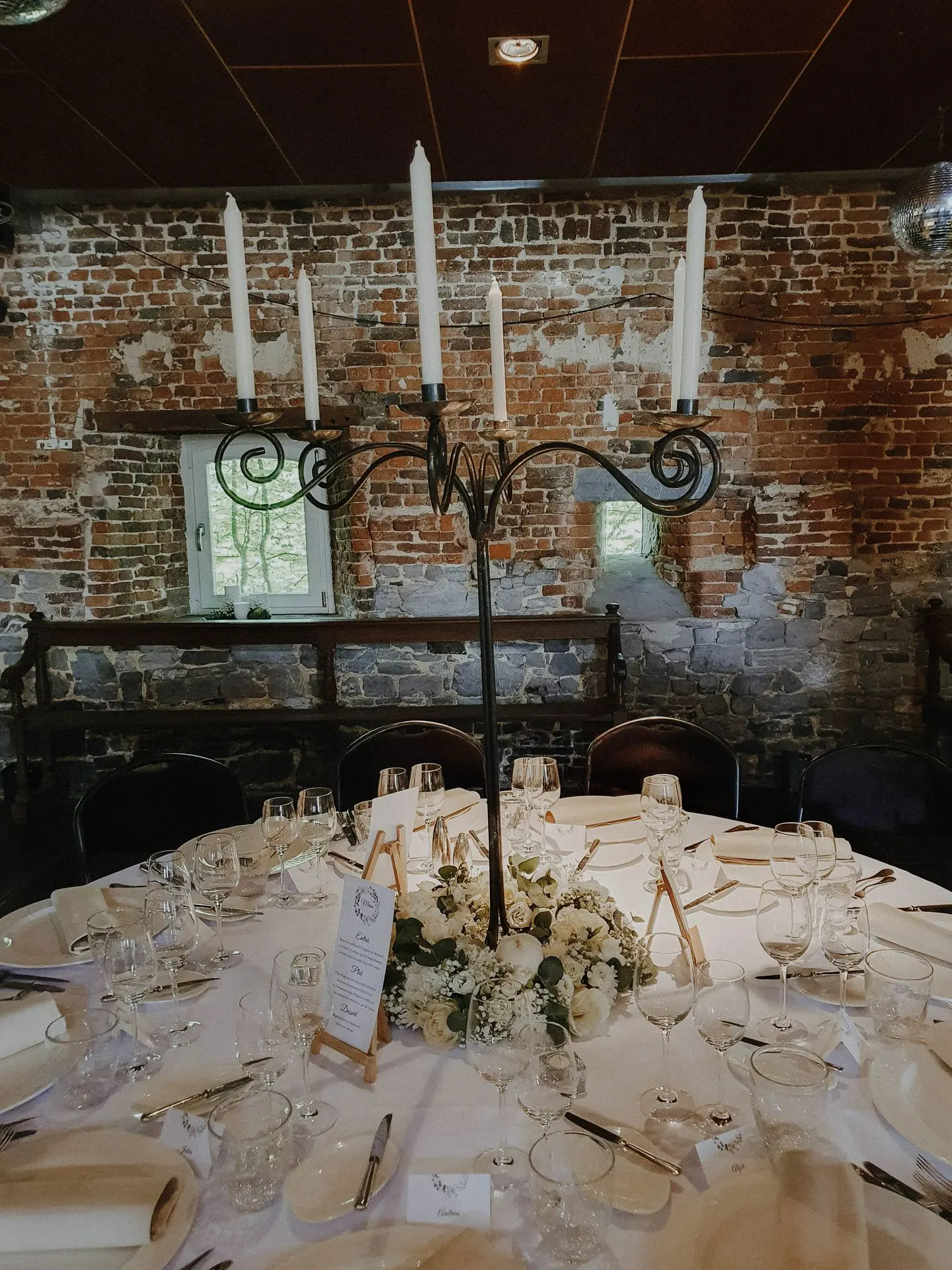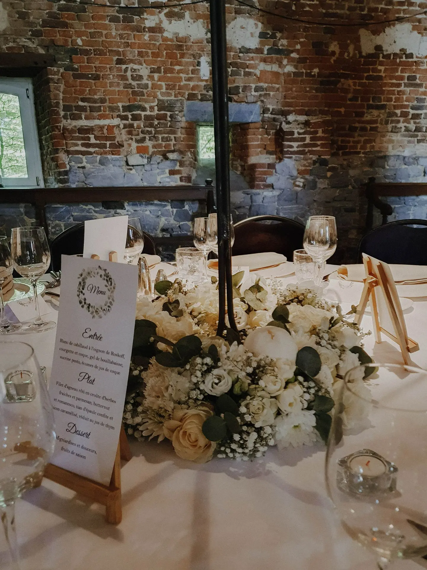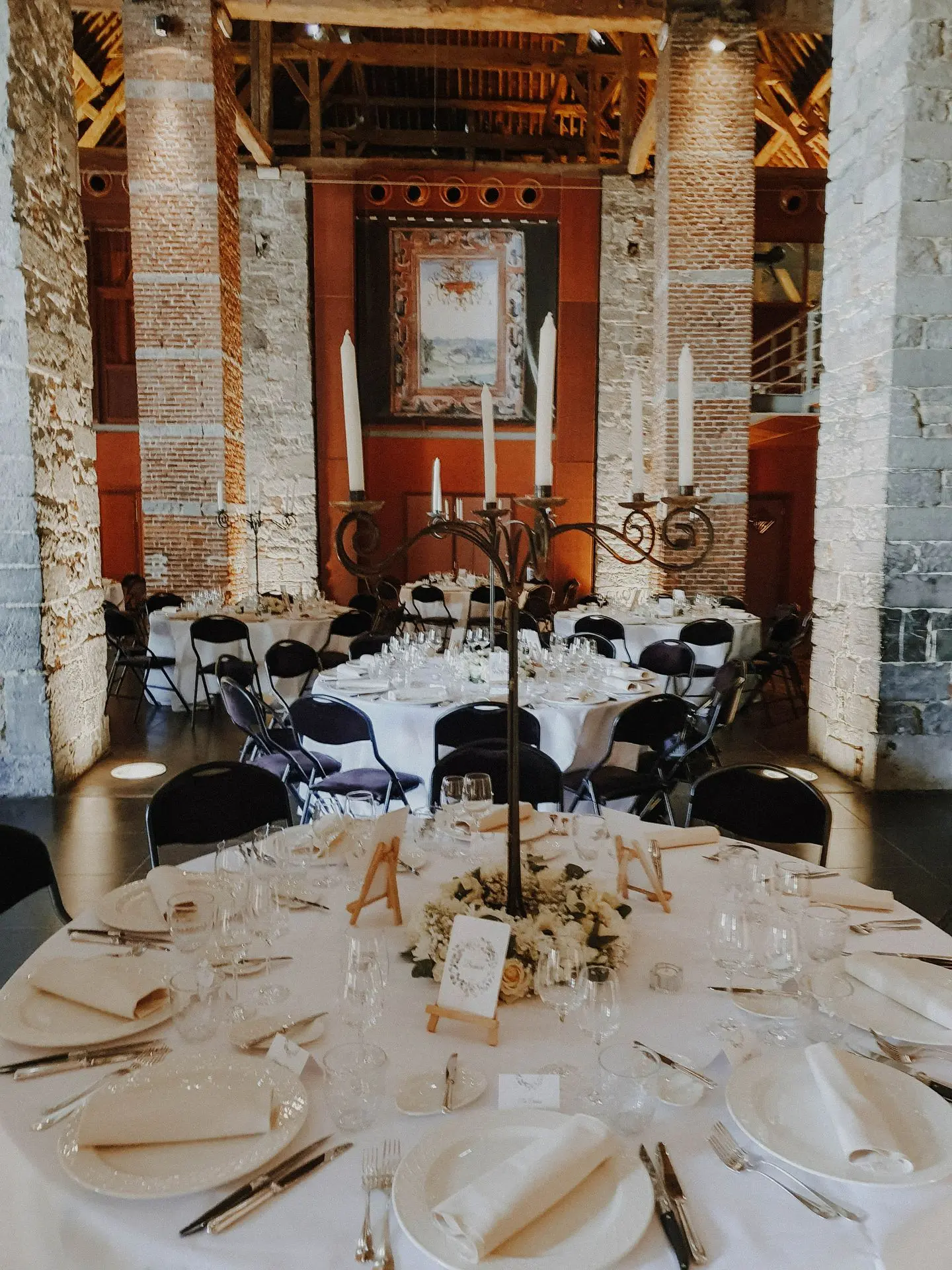 L’ambiance romantique s’est prolongée en salle avec de superbes chandeliers en fer forgé associés à une couronne de fleurs qui apportait une touche naturelle et raffinée.