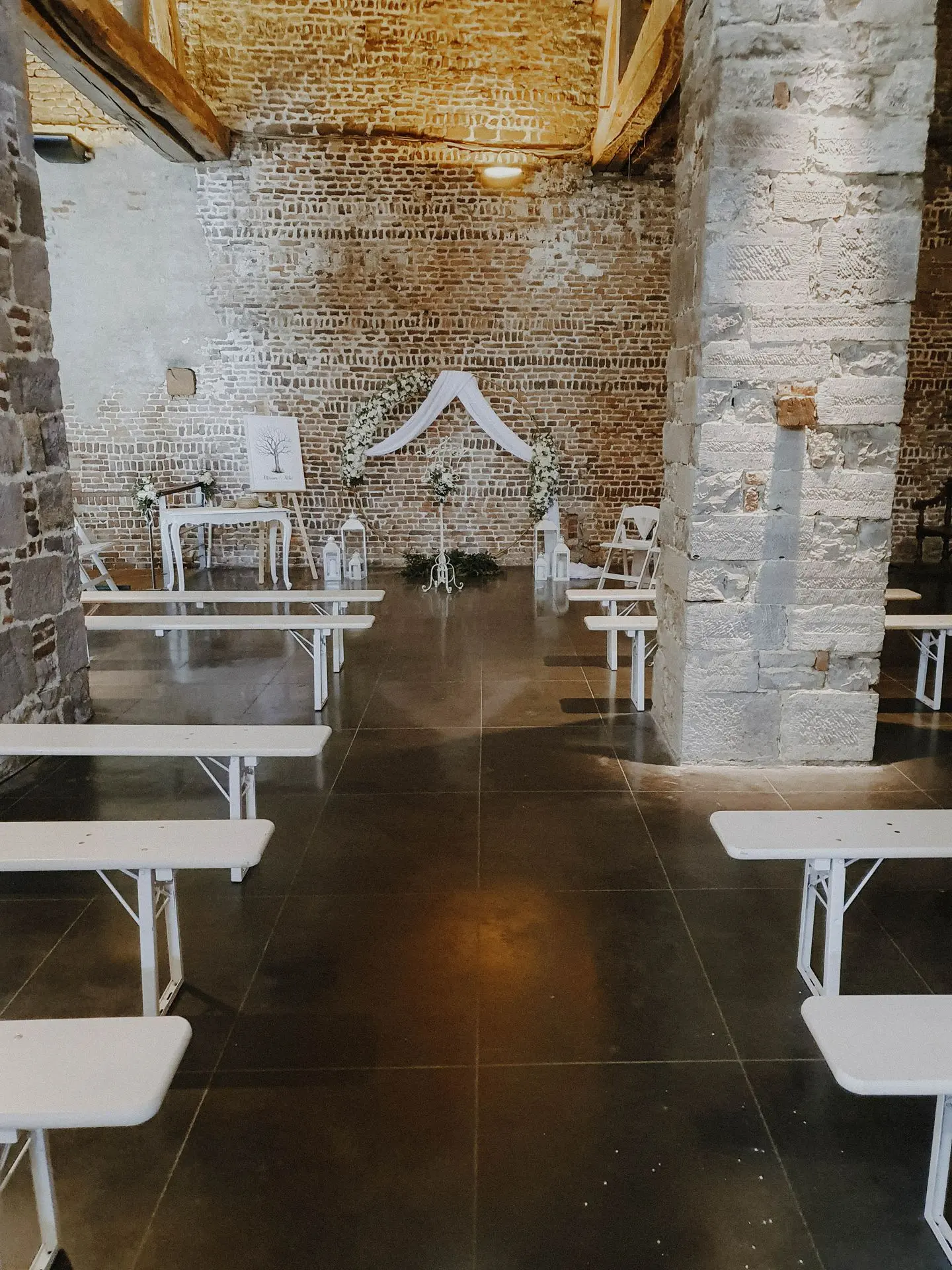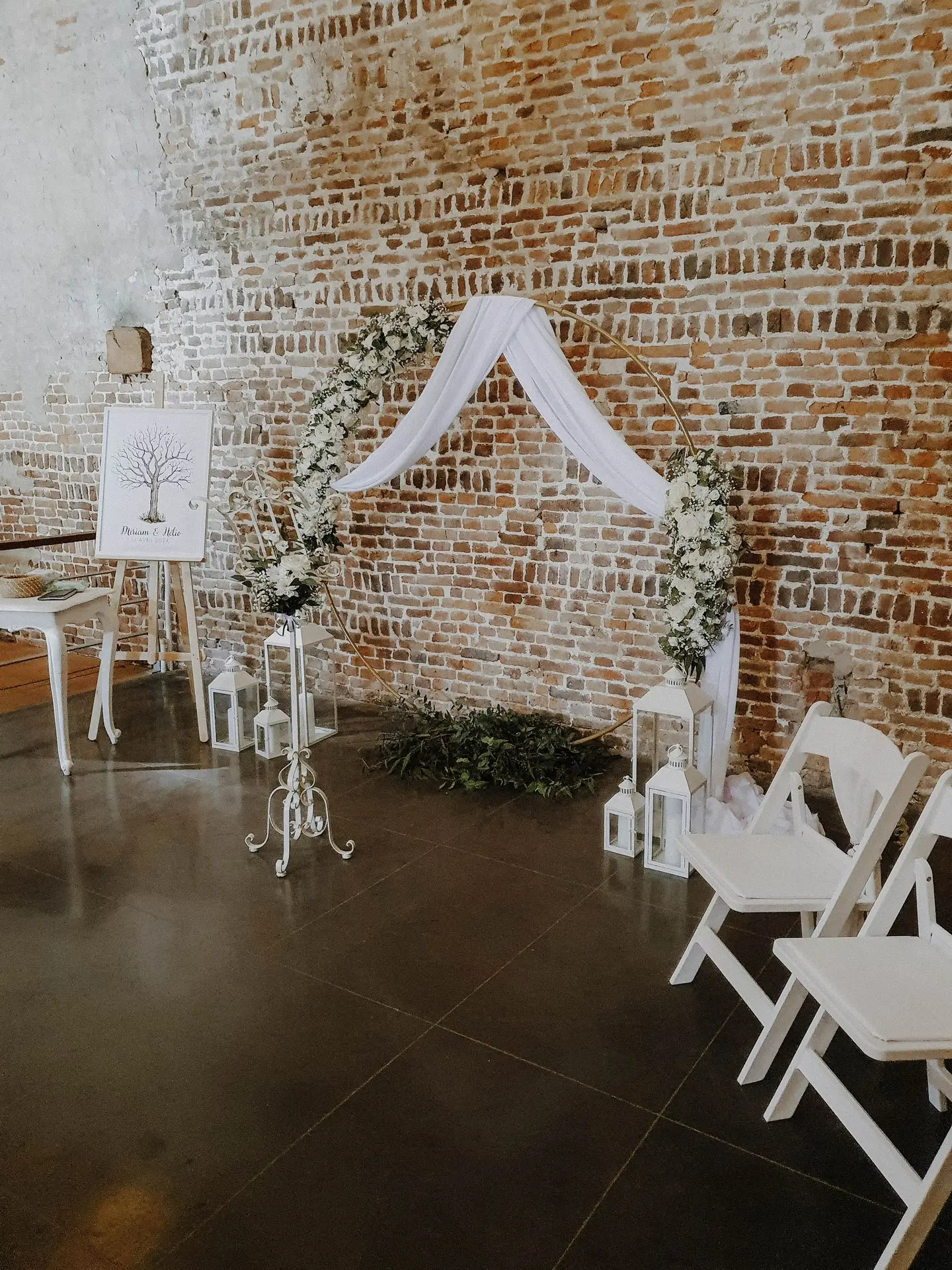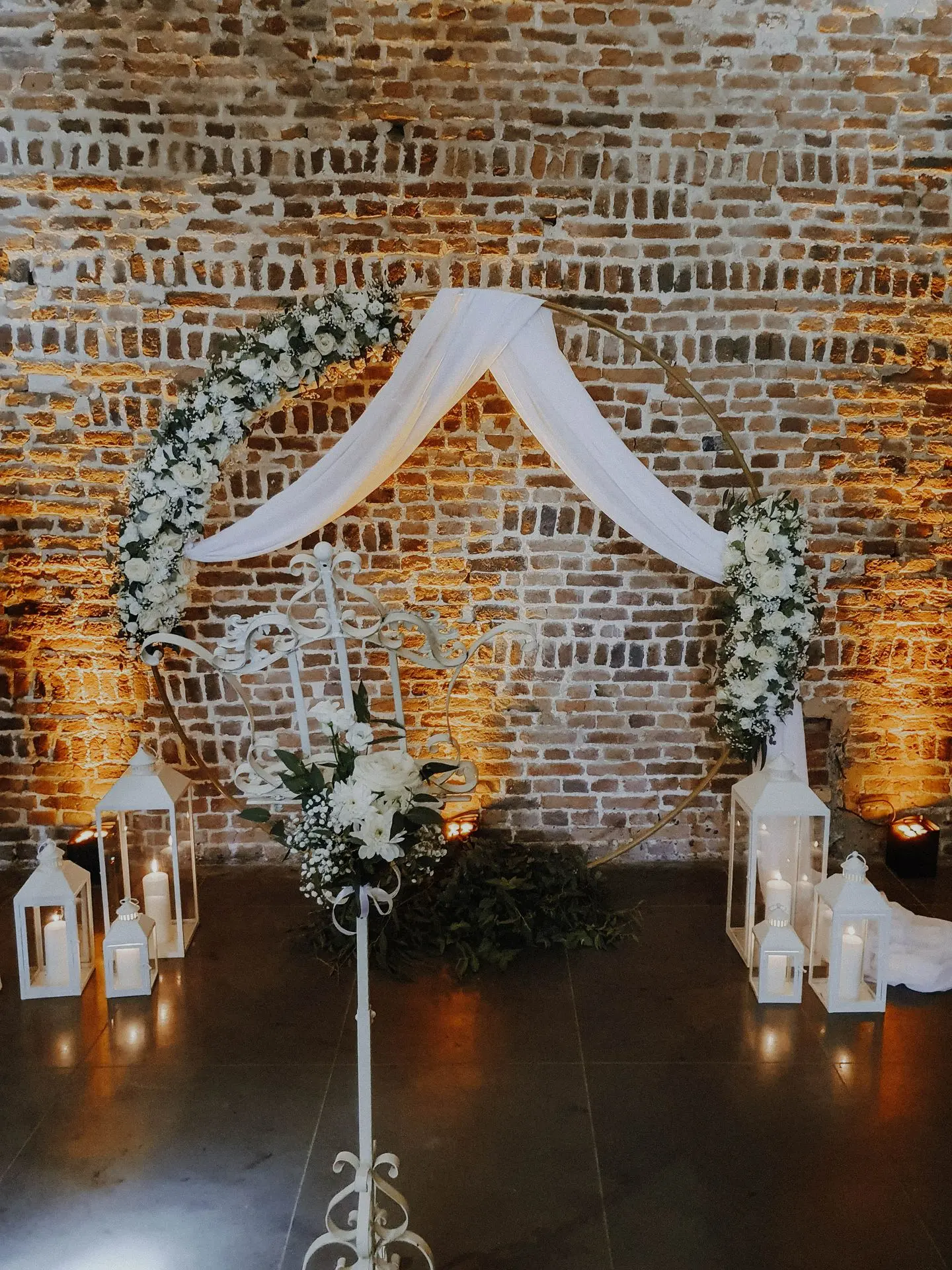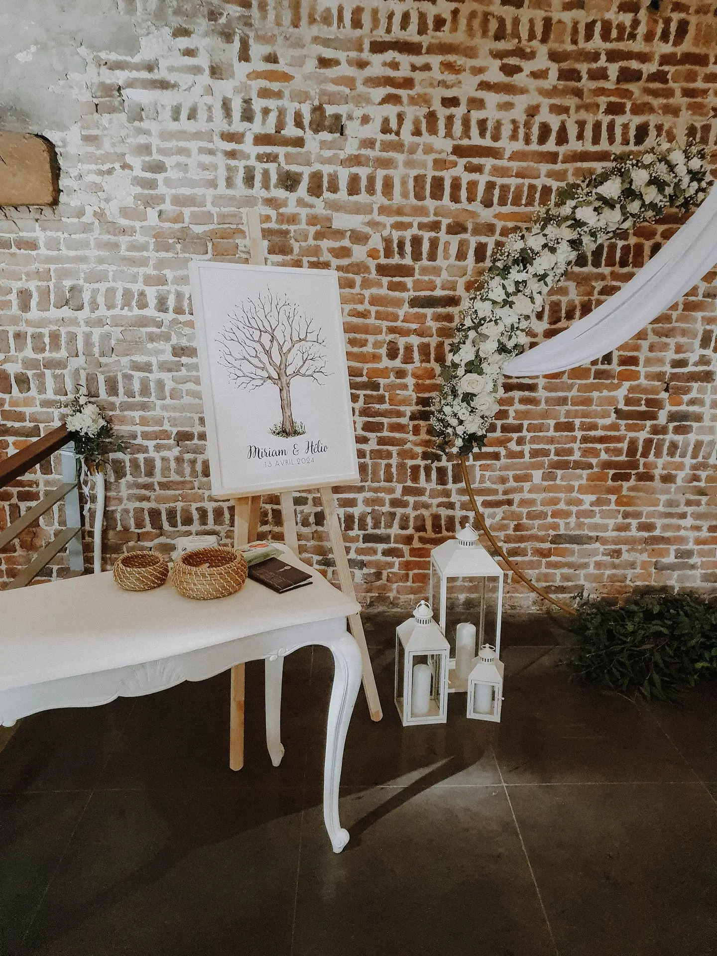 Miriam et Hélio ont célébré leur union à la Ferme de l’Abbaye de Moulin, un lieu chargé de charme où s’est tenue leur cérémonie laïque sous une arche délicatement décorée de blanc et de vert.