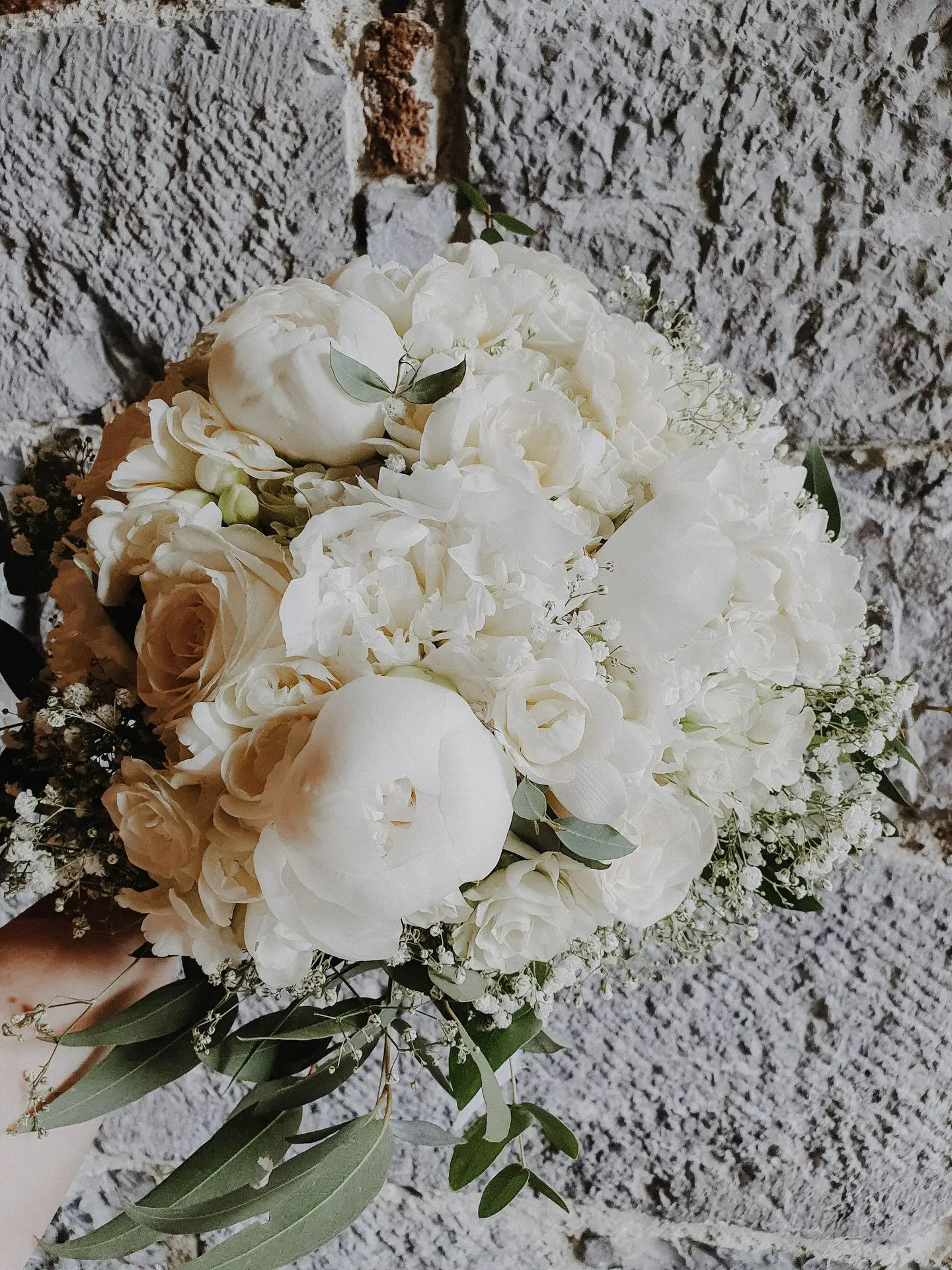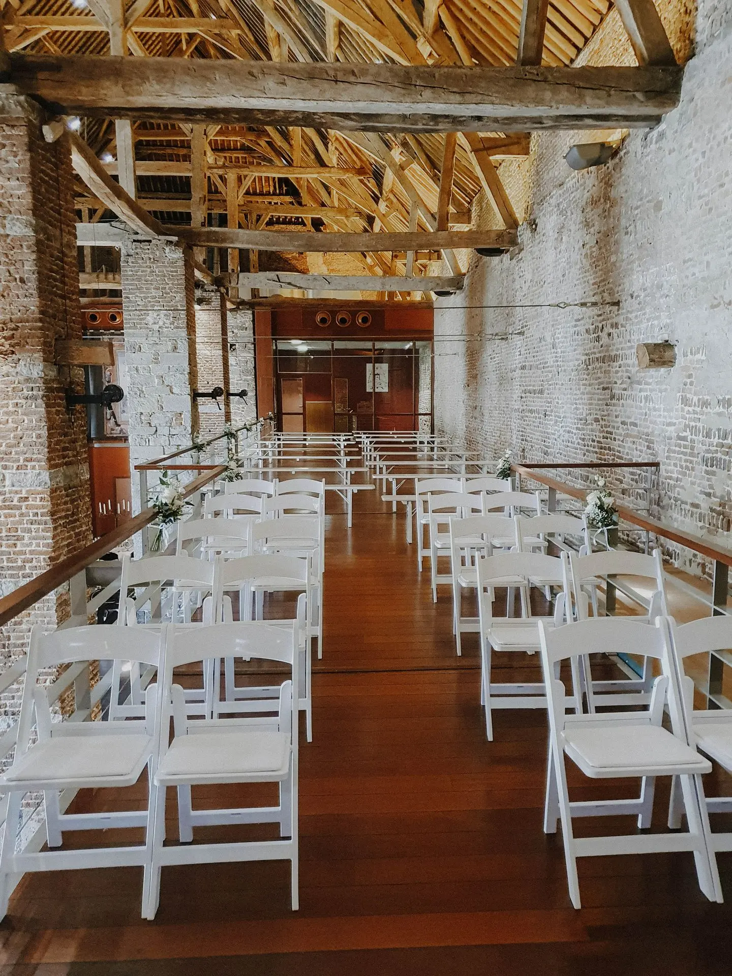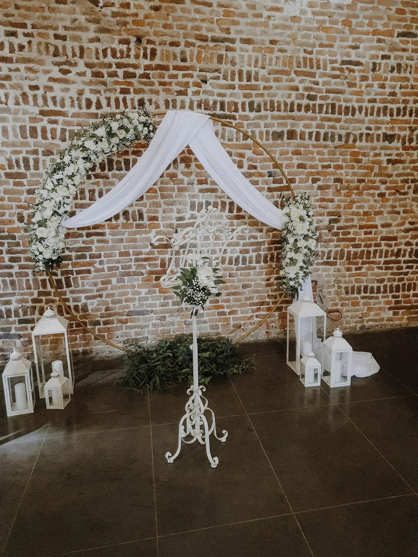 Miriam et Hélio ont célébré leur union à la Ferme de l’Abbaye de Moulin, un lieu chargé de charme où s’est tenue leur cérémonie laïque sous une arche délicatement décorée de blanc et de vert.