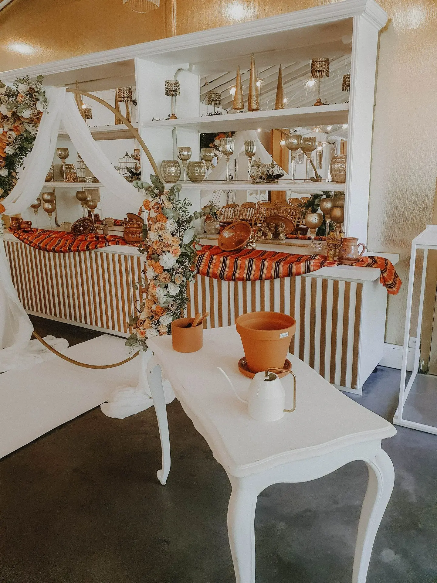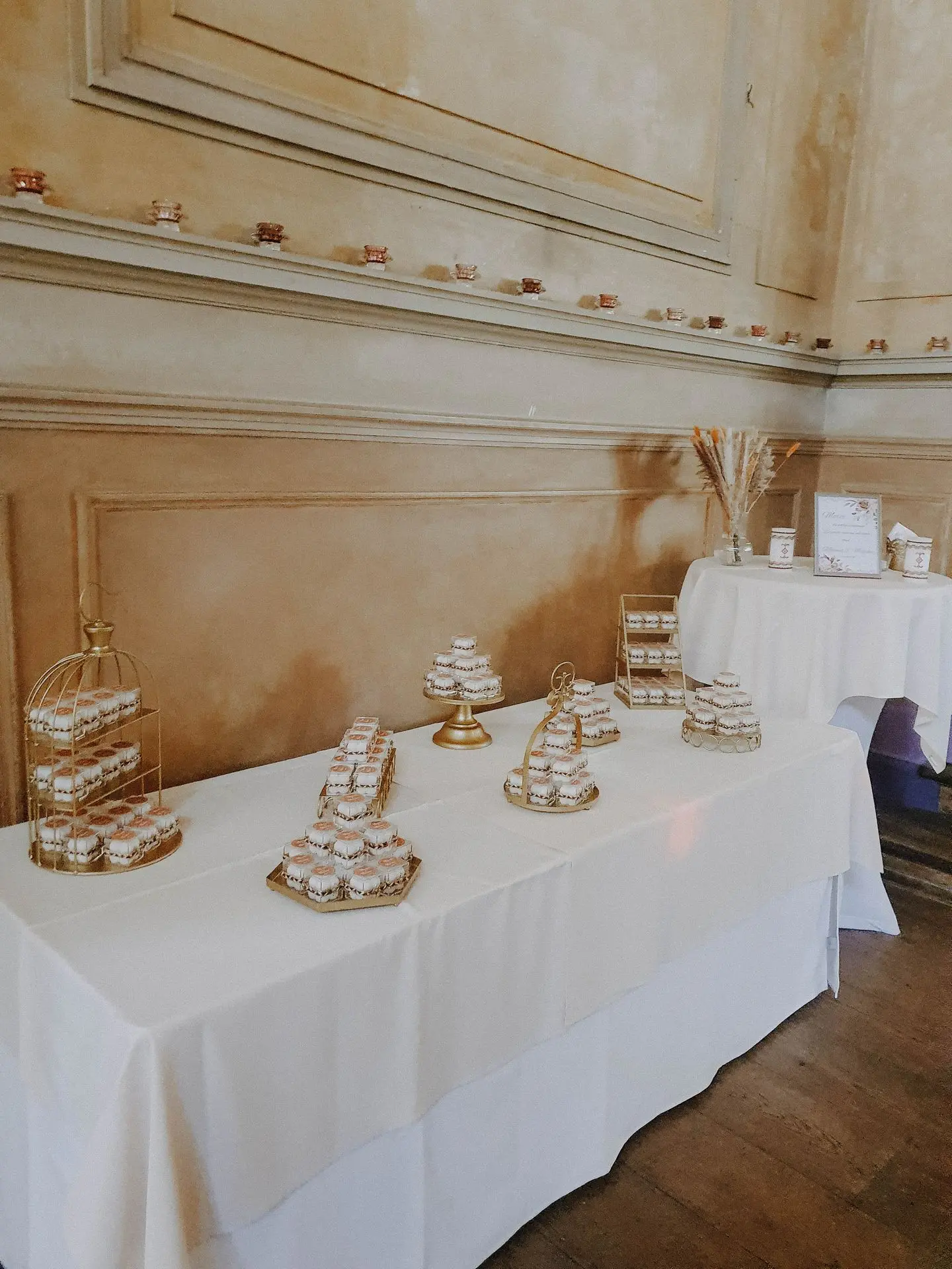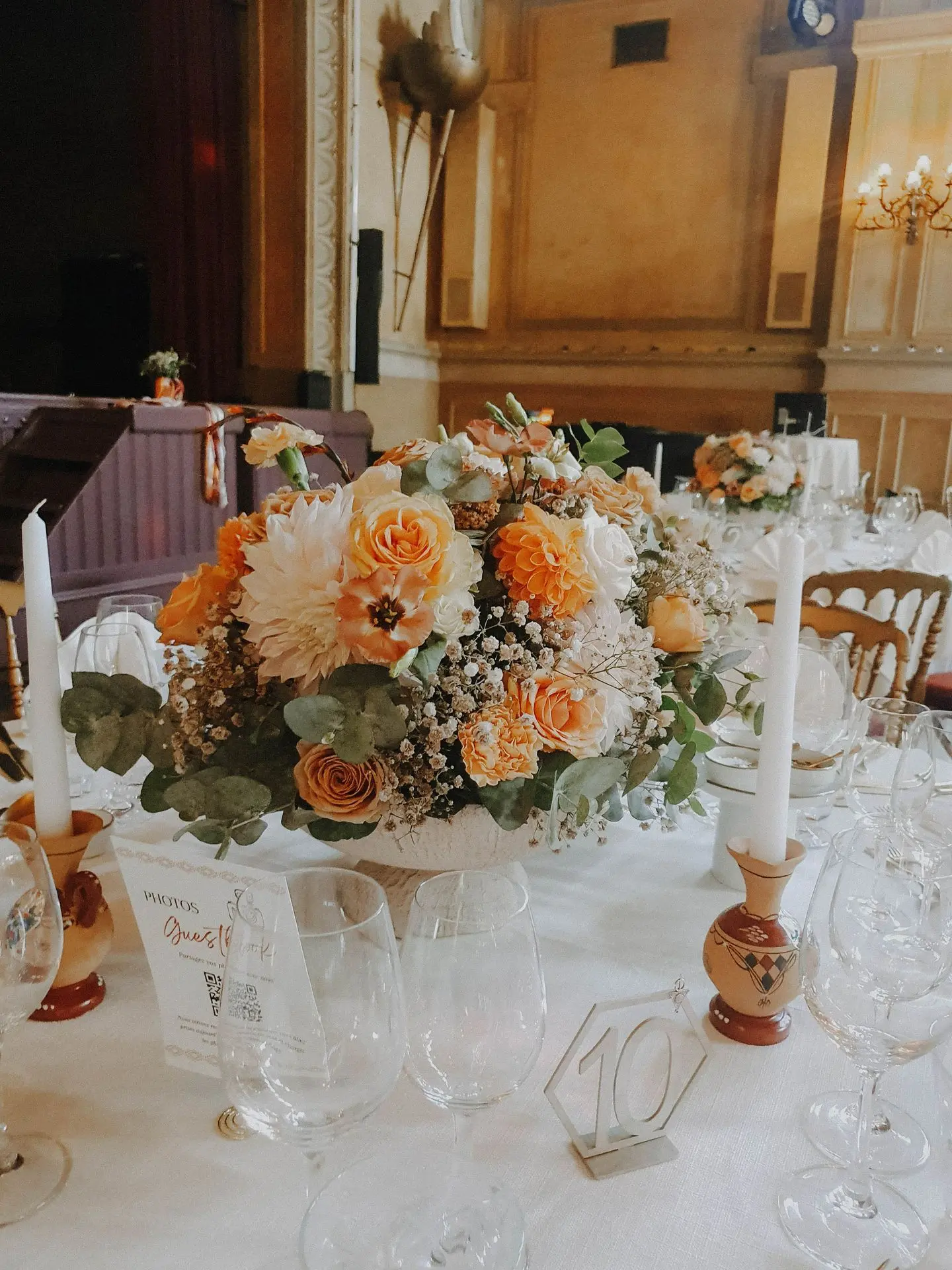 Pour la réception, les tables étaient décorées de centres de table fleuris aux couleurs douces et naturelles. Autour, de jolis photophores en poterie servaient de bougeoirs, ajoutant une touche artisanale et chaleureuse à l’ensemble.