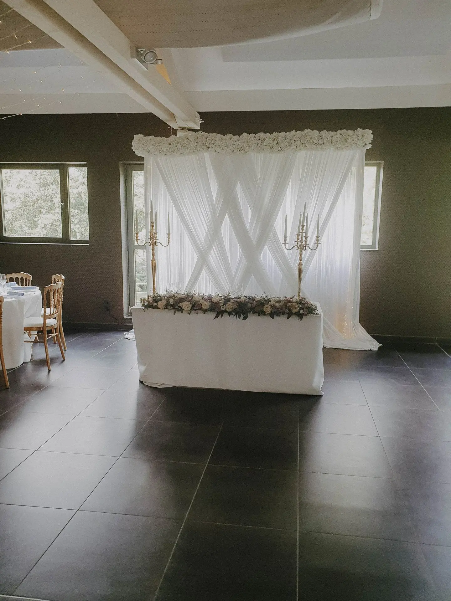 Leur table d’honneur, pensée pour deux, se dressait sous un voile délicat qui créait un écrin romantique, sublimé par deux chandeliers et un chemin fleurie aux tons naturels.